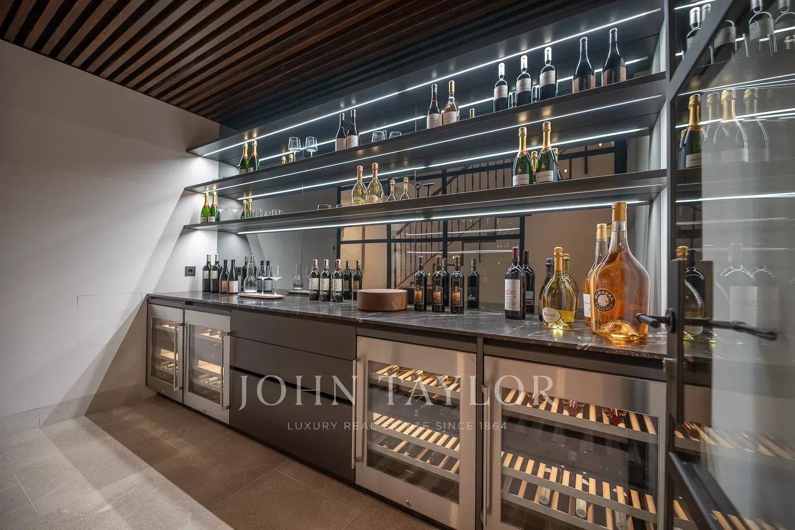La propriété dispose de deux accès : depuis l'élégante entrée principale à l'avant ou le parking sécurisé à l'arrière. En entrant, vous serez accueilli par un grand hall avec une cheminée décorative, un bar à vin élégant, une buanderie et un garage spacieux. Les étages supérieurs, accessibles par escalier ou ascenseur, sont judicieusement agencés pour maximiser le confort et la fonctionnalité.