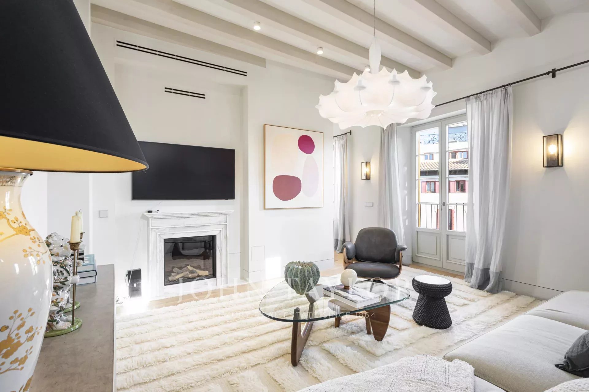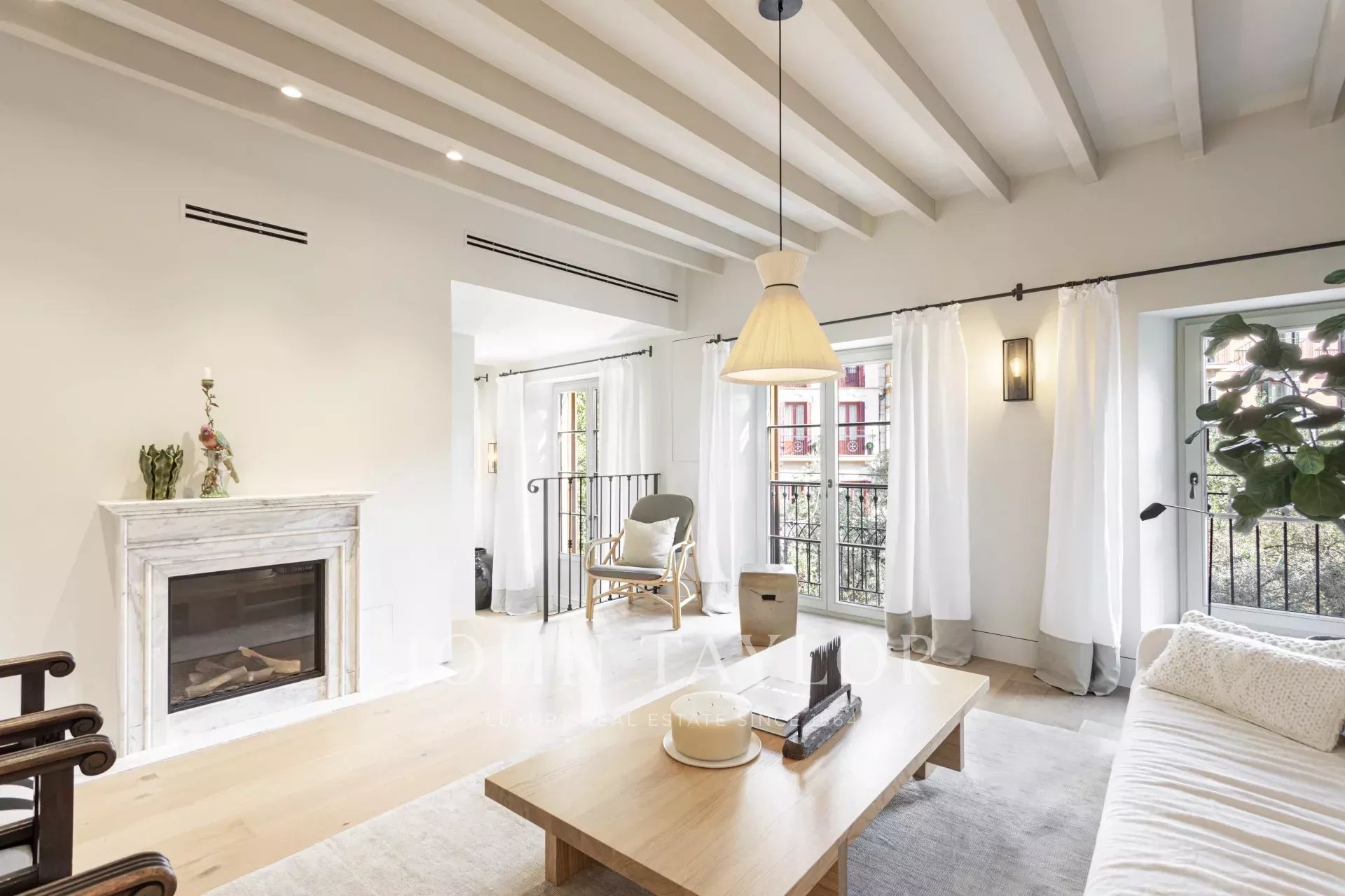 Dans cet appartement, un plan d'étage ouvert relie de manière transparente la salle de séjour et la cuisine ouverte. La chambre à coucher, située au calme et donnant sur l'arrière, dispose d'étagères en bois encastrées, d'armoires et d'un placard dans une teinte paisible de vert pâle, inspirée par l'olivier de la Placa Cort. Une magnifique cheminée au gaz avec des manteaux fabriqués à la main en marbre italien Calacatta Gold confère à l'espace de vie à la fois confort et classe. Peut-on rêver d'un refuge plus séduisant ?