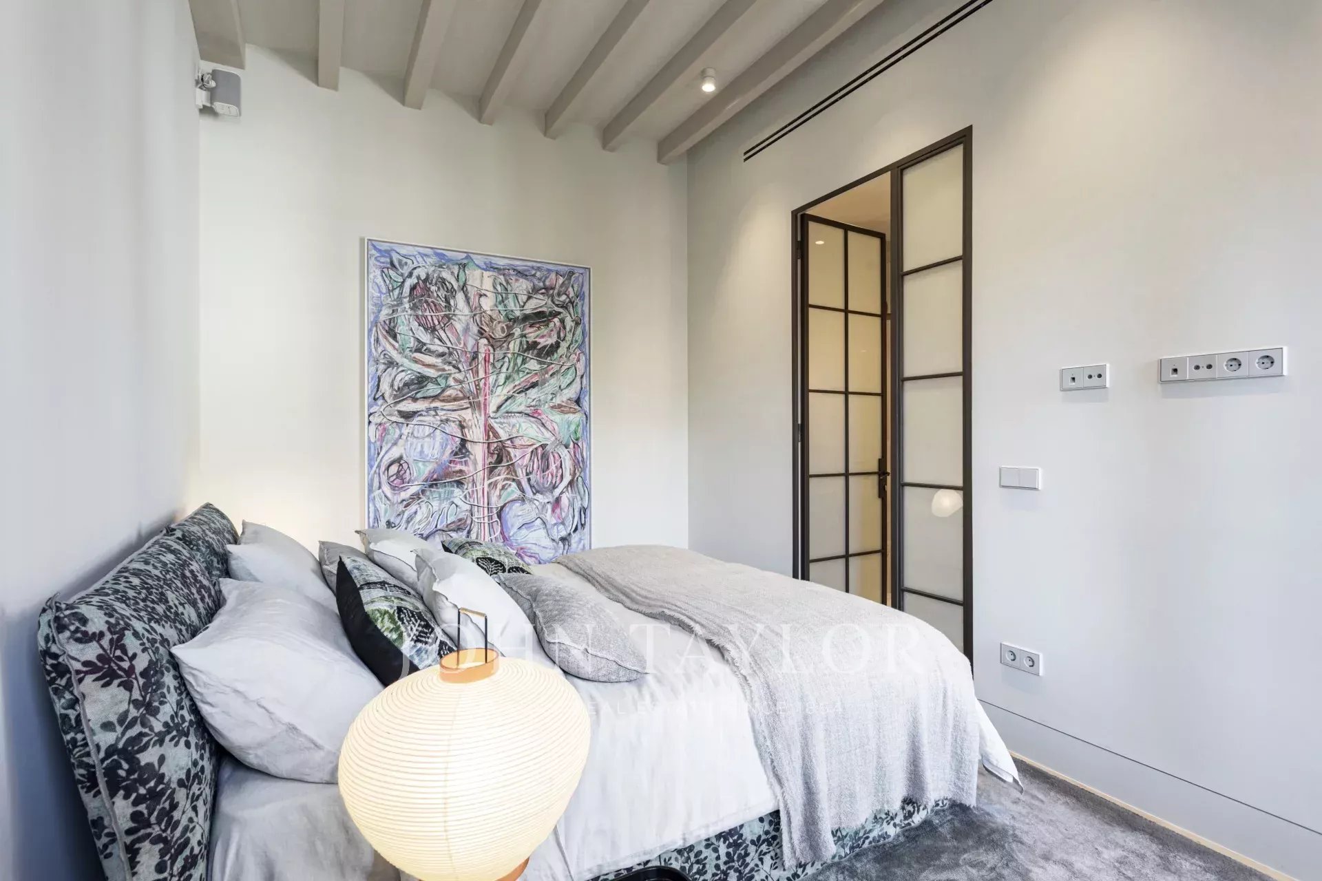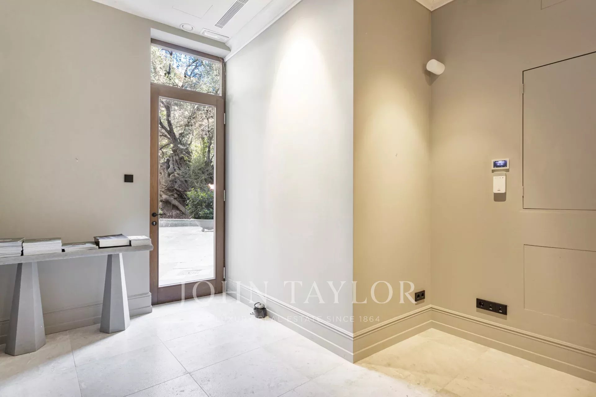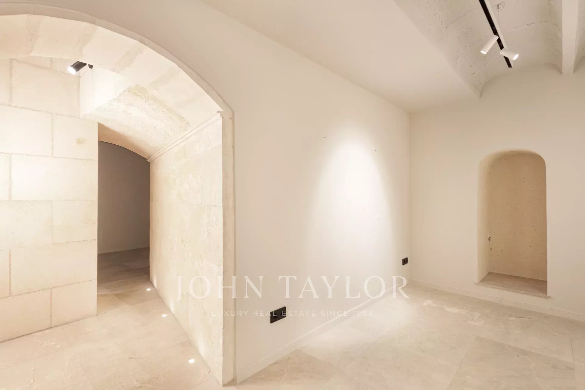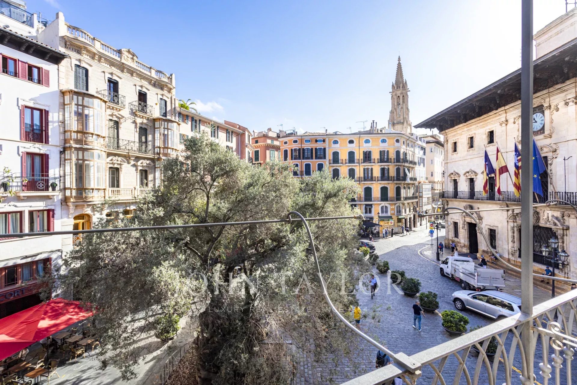 Sur ce plan ingénieux, il y a de la place pour une cuisine avec salle à manger et des doubles portes qui s'ouvrent sur la Placa Cort. La chambre à coucher dispose d'un dressing et d'une salle de bains attenante derrière une porte à glissière. Dans la cuisine, les armoires personnalisées sont en bois massif et tout le marbre de la cuisine est de l'or de Calacatta, sélectionné à la main par nos soins sur place en Italie. Cet appartement est merveilleux et constitue une oasis de calme surprenante au milieu de la vieille ville animée.