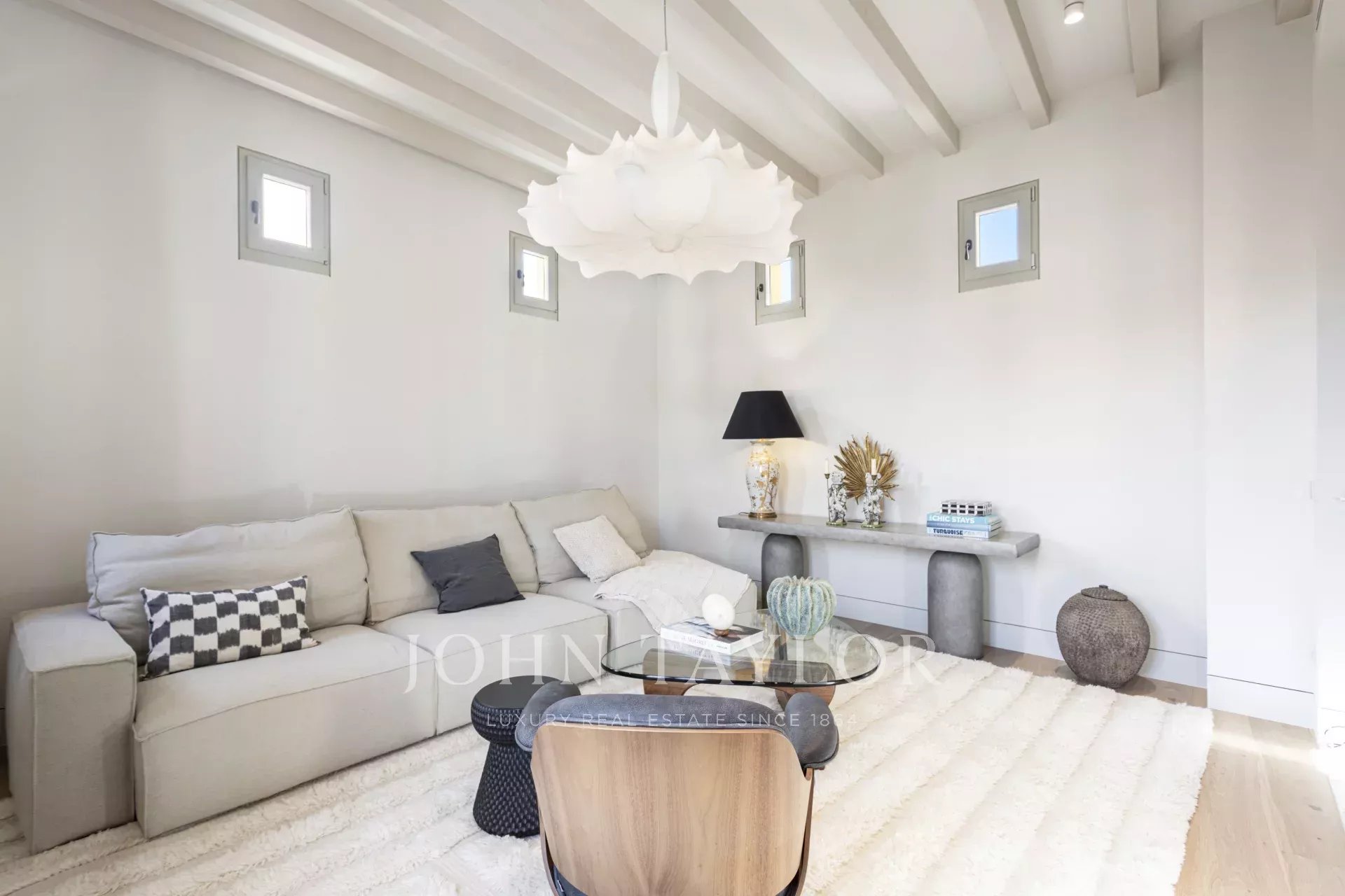 Le quatrième étage est spacieux et se compose de plusieurs espaces sociaux, d'une salle à manger et d'une cuisine. L'ascenseur monte directement aux étages 3 et 4. Des parquets en chêne massif huilé et chauffé traversent l'ensemble du plan d'étage. De là, un escalier mène à la terrasse du toit qui offre une vue magnifique. Les plafonds sont ornés de robustes poutres d'époque. Dans l'espace social, vous trouverez une cheminée au gaz en marbre Calacatta Gold et des doubles portes ouvrant sur la Placa Cort. La maison est entièrement meublée avec des pièces triées sur le volet par les meilleurs designers et producteurs, comme une magnifique lampe de Floos, une table basse de Vitra, un buffet et un tapis de Dusty Deco. Sans oublier la classique chaise longue Eames.