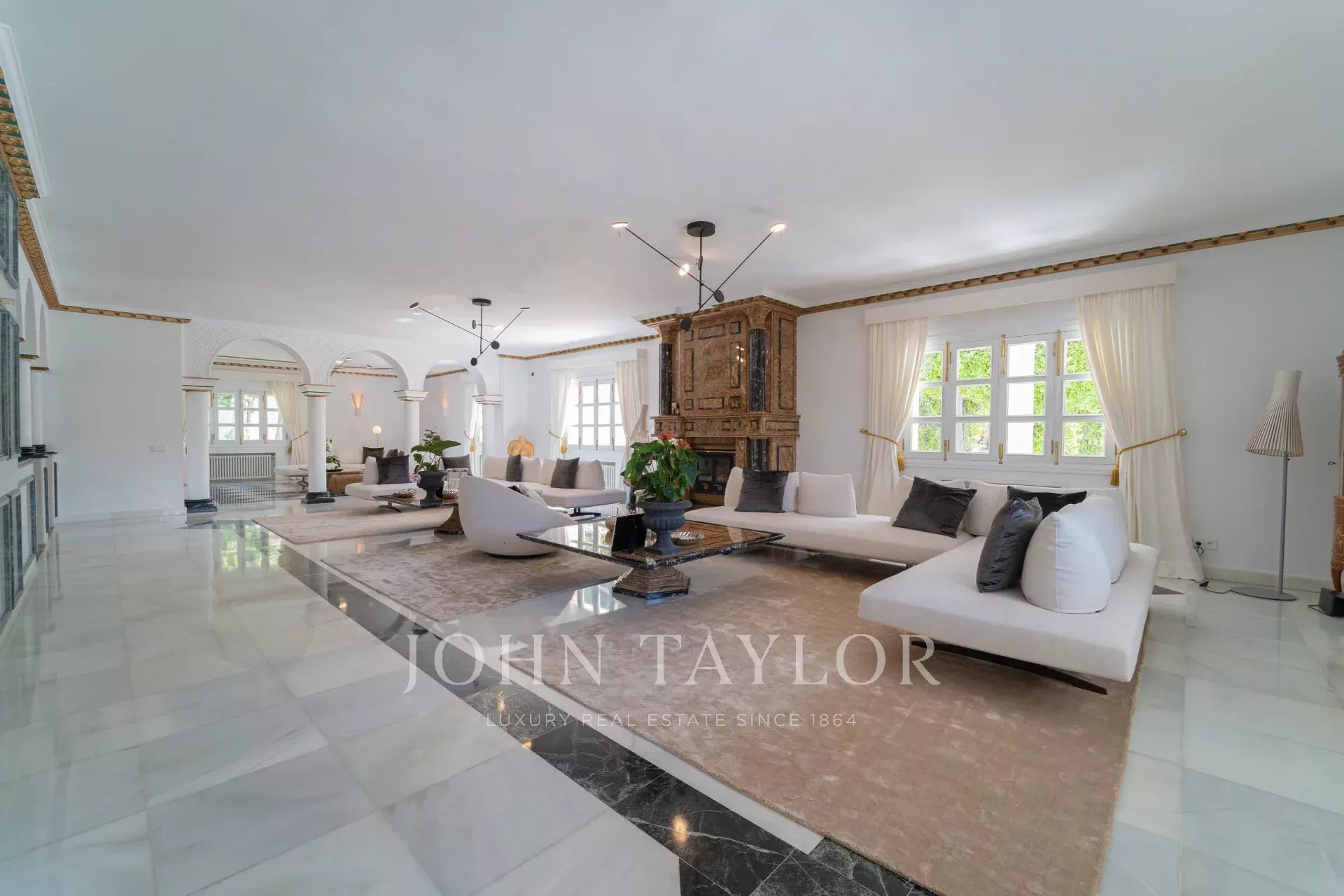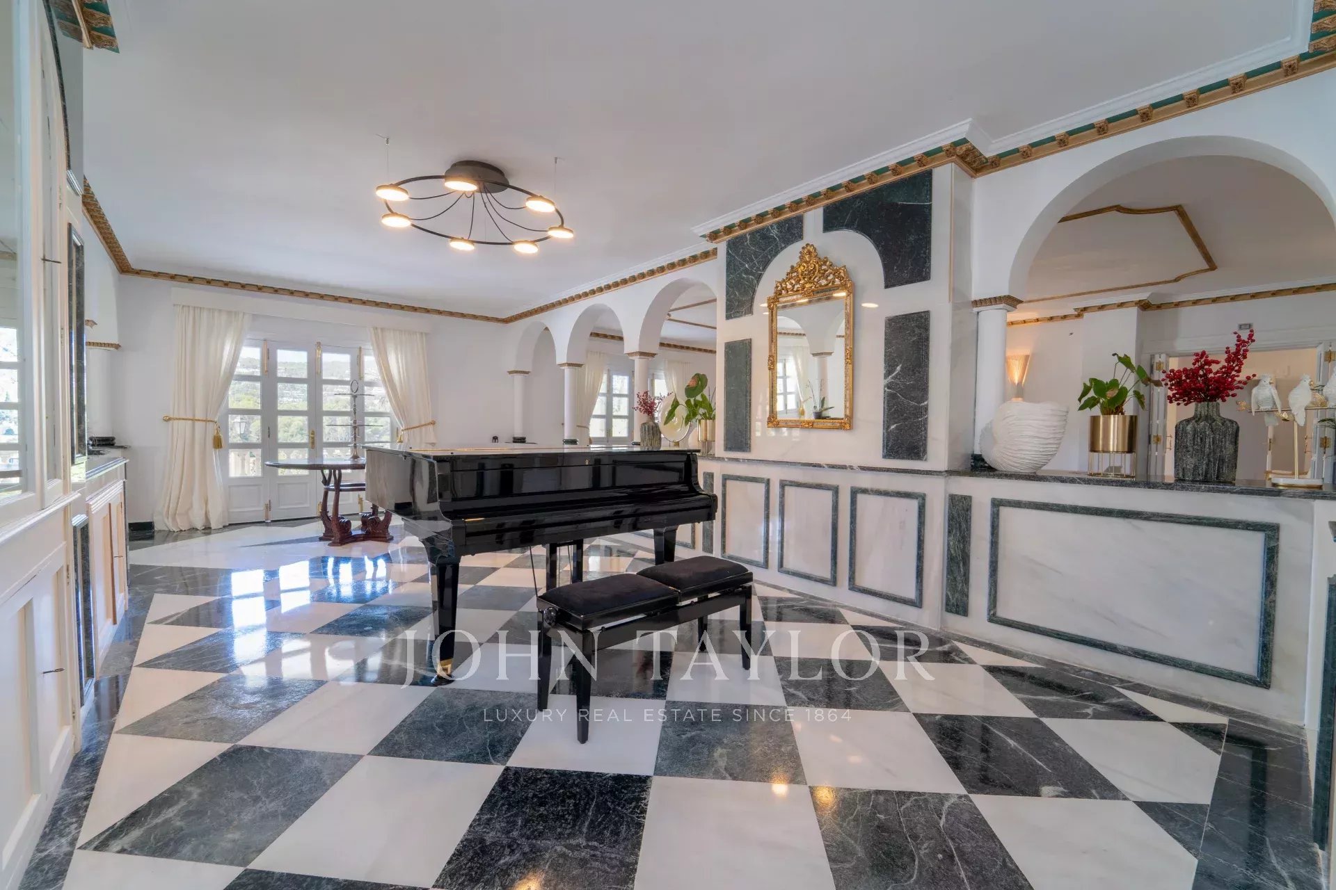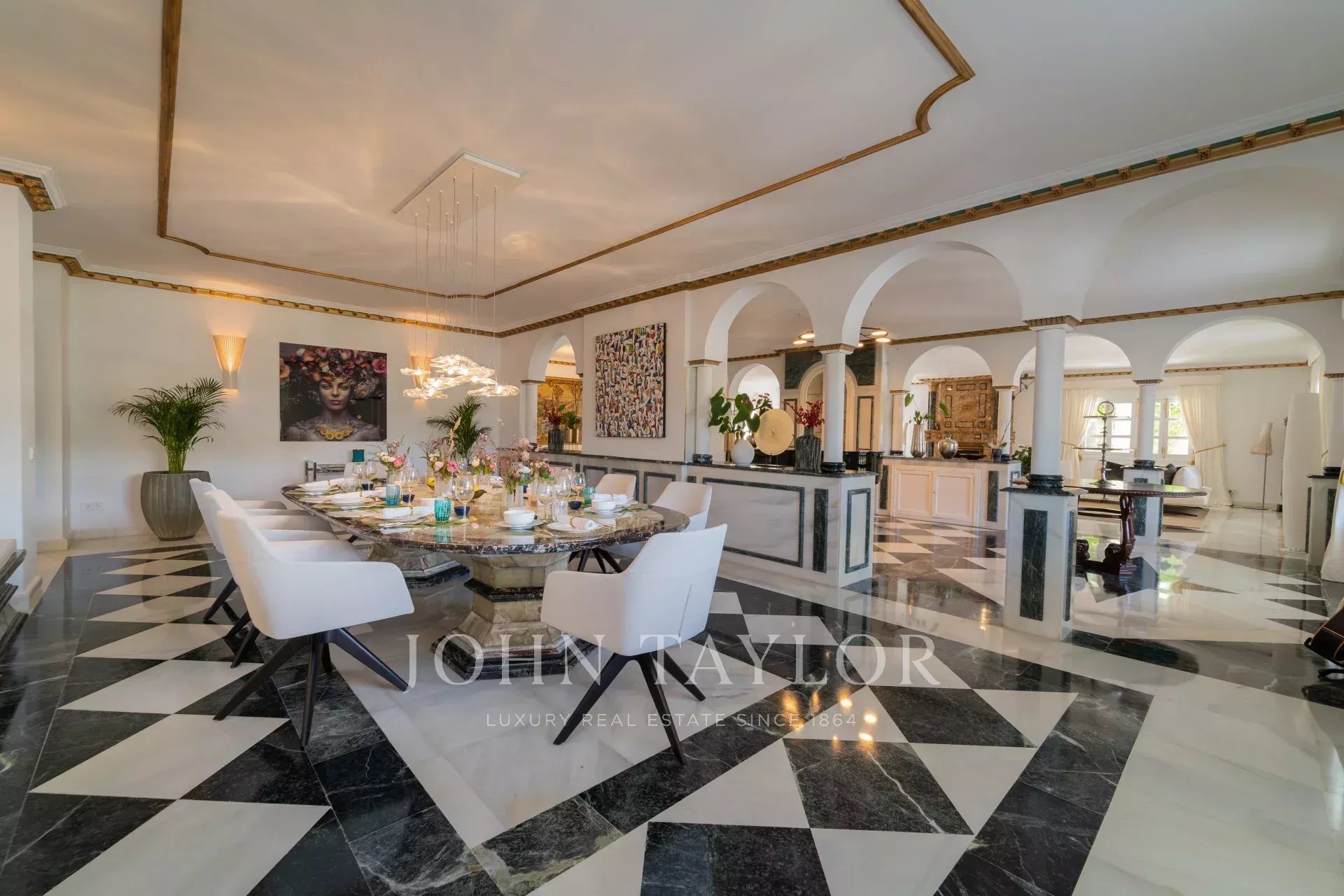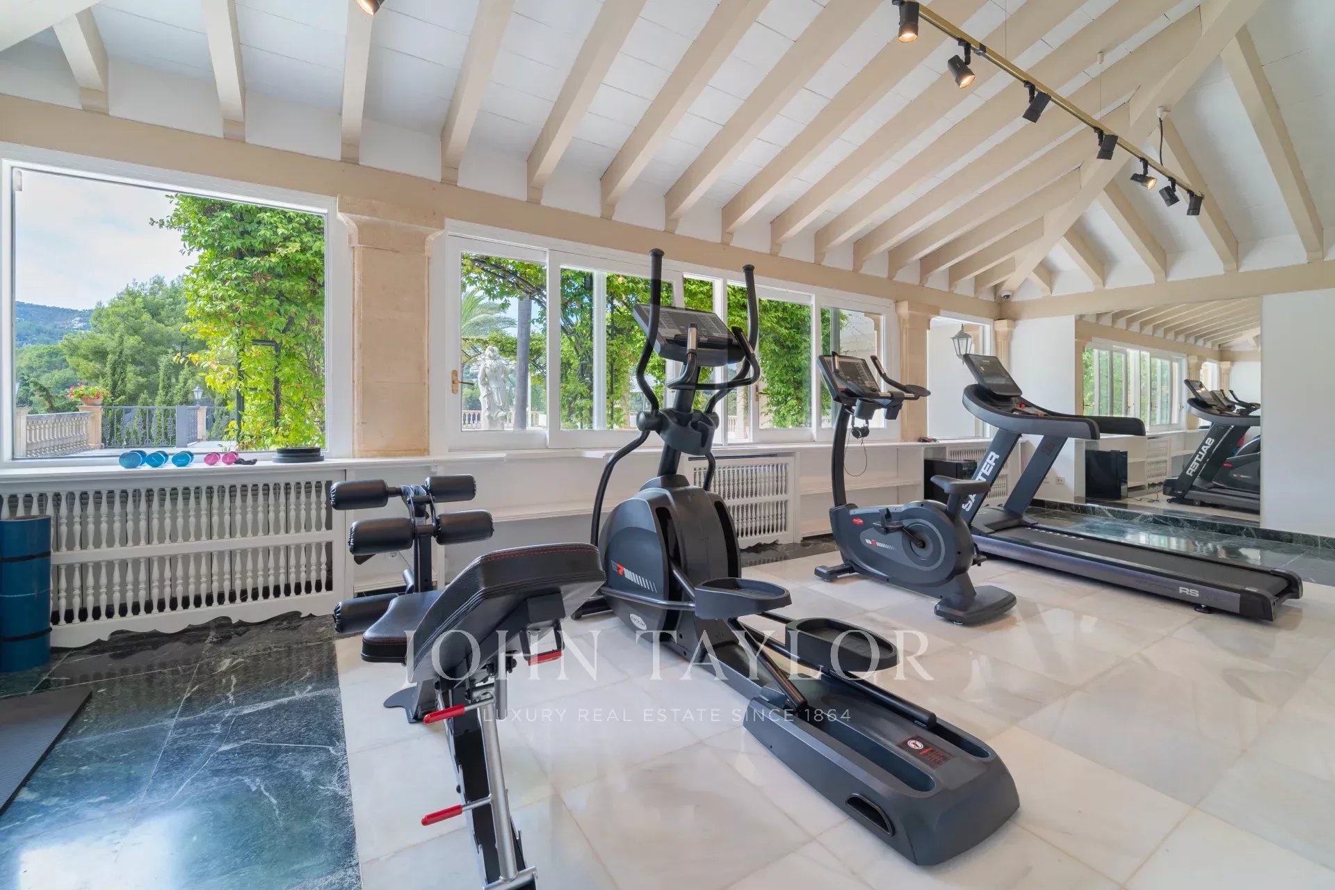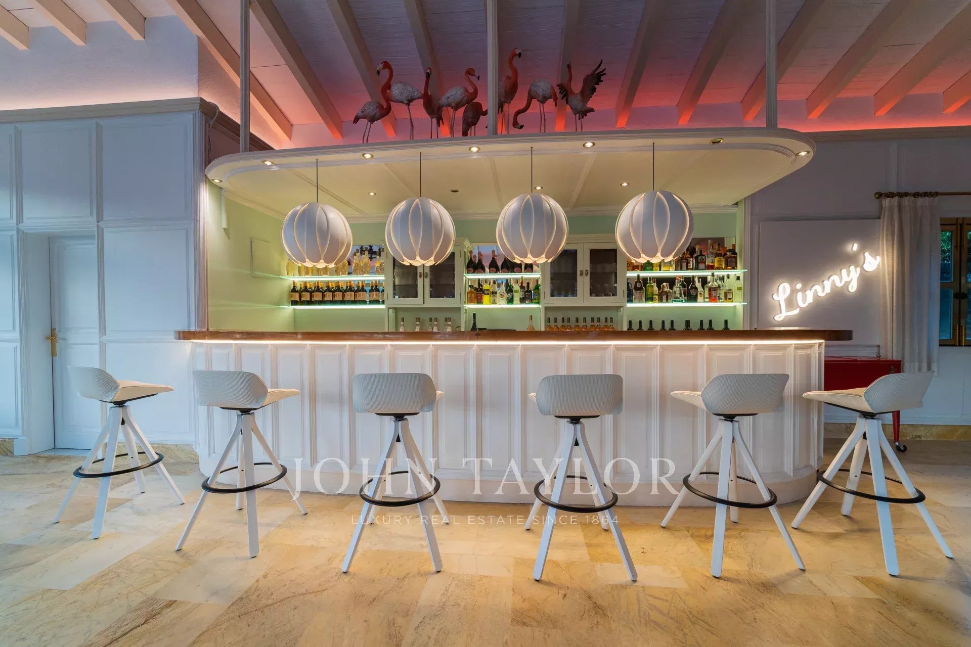 Une entrée impressionnante : On y accède par un grand portail en acier forgé et une longue allée bordée de 11 palmiers imposants. Espaces de divertissement et de bien-être. À l'entrée, vous trouverez un espace de sport et de remise en forme comprenant un gymnase, une petite cuisine, une salle de bains et une chambre d'amis, idéale pour des séances de yoga ou de massage. La maison du barbecue, qui abrite le bar "Linny's", est équipée d'un gril à bois ouvert, d'une plaque de cuisson wok et d'un grand four à pizza en pierre, idéal pour organiser des rassemblements. Adjacent à la villa, le Park di Sabine séduit par son orangerie de jasmin odorant et son étang serein. La terrasse est l'endroit idéal pour profiter d'un coucher de soleil à couper le souffle.