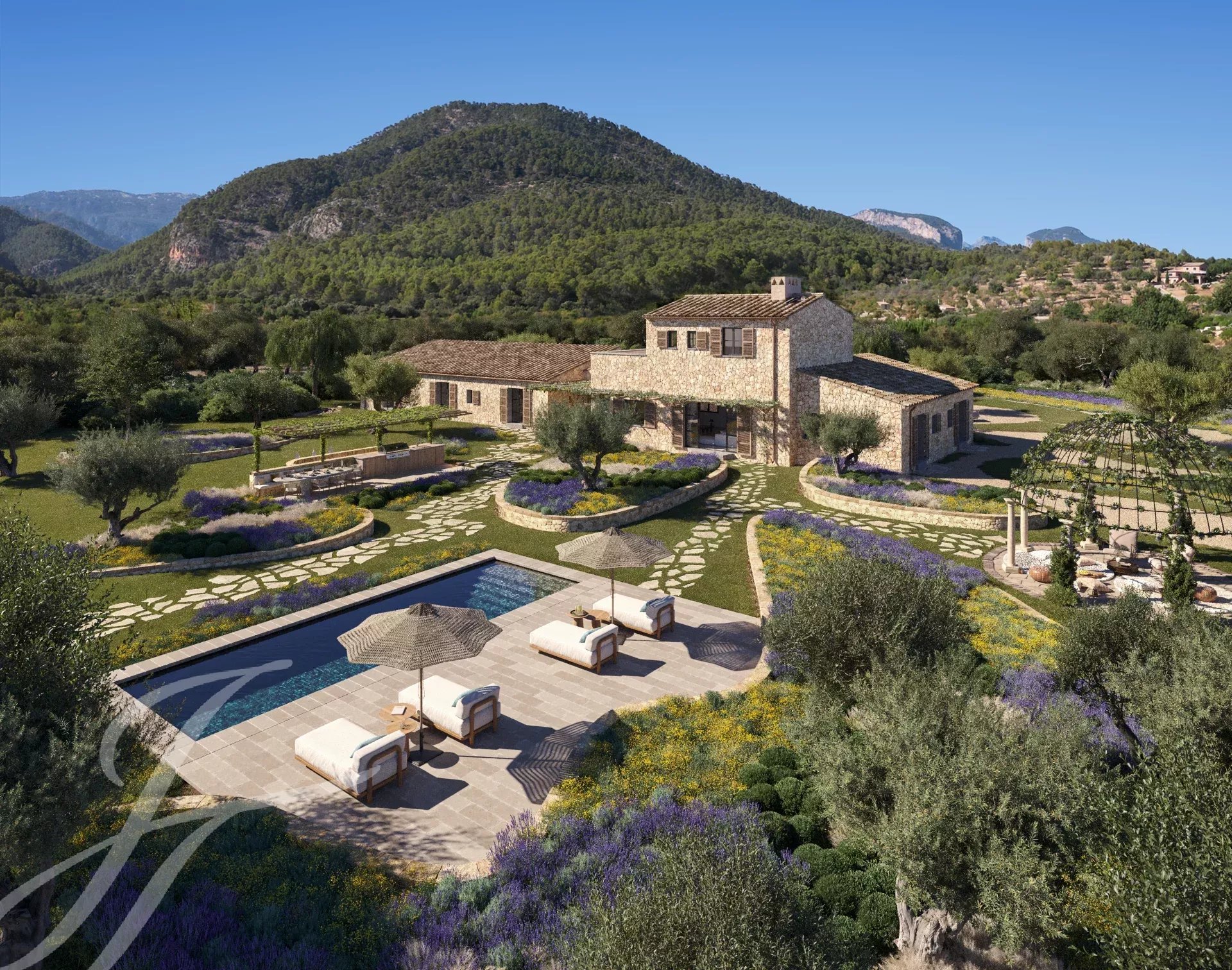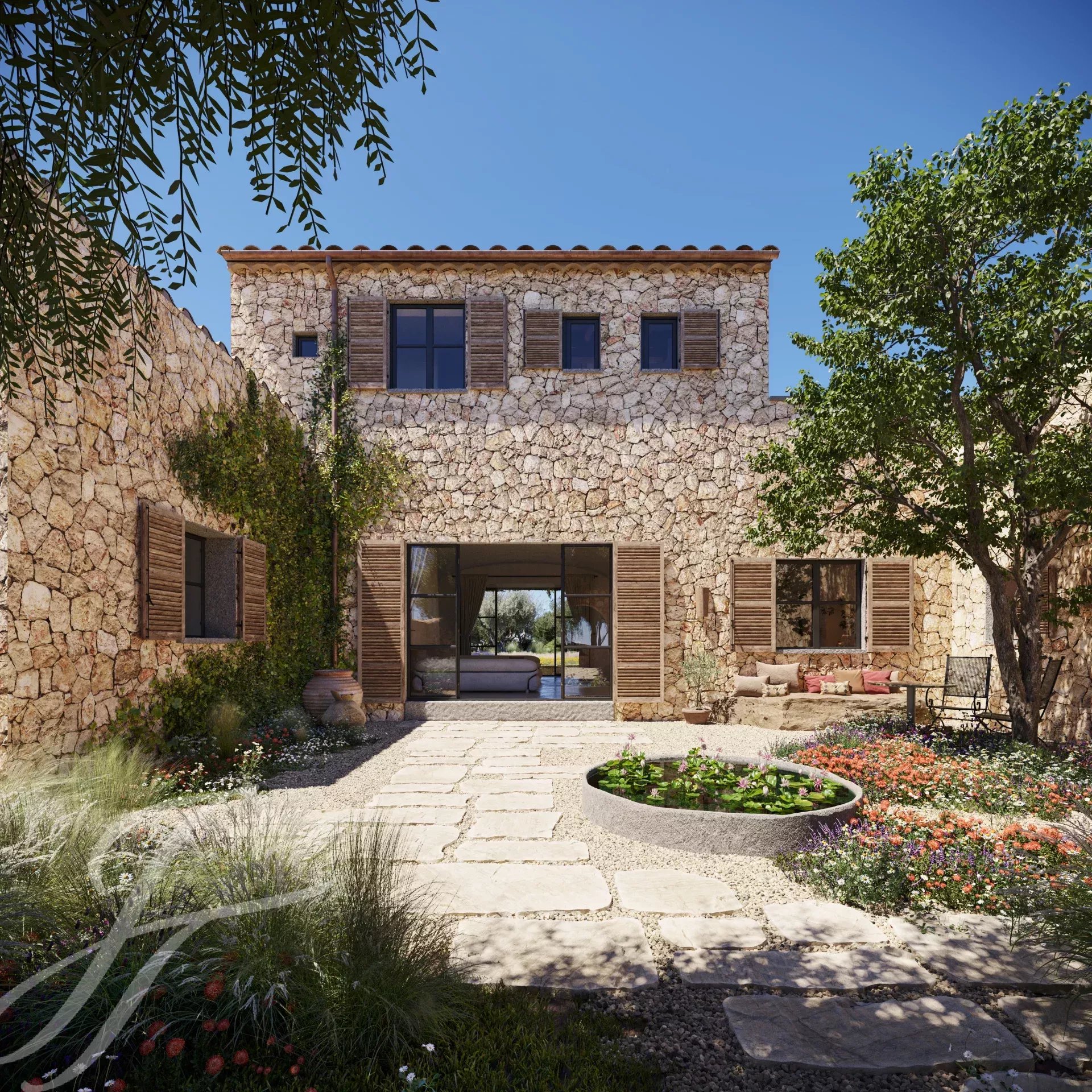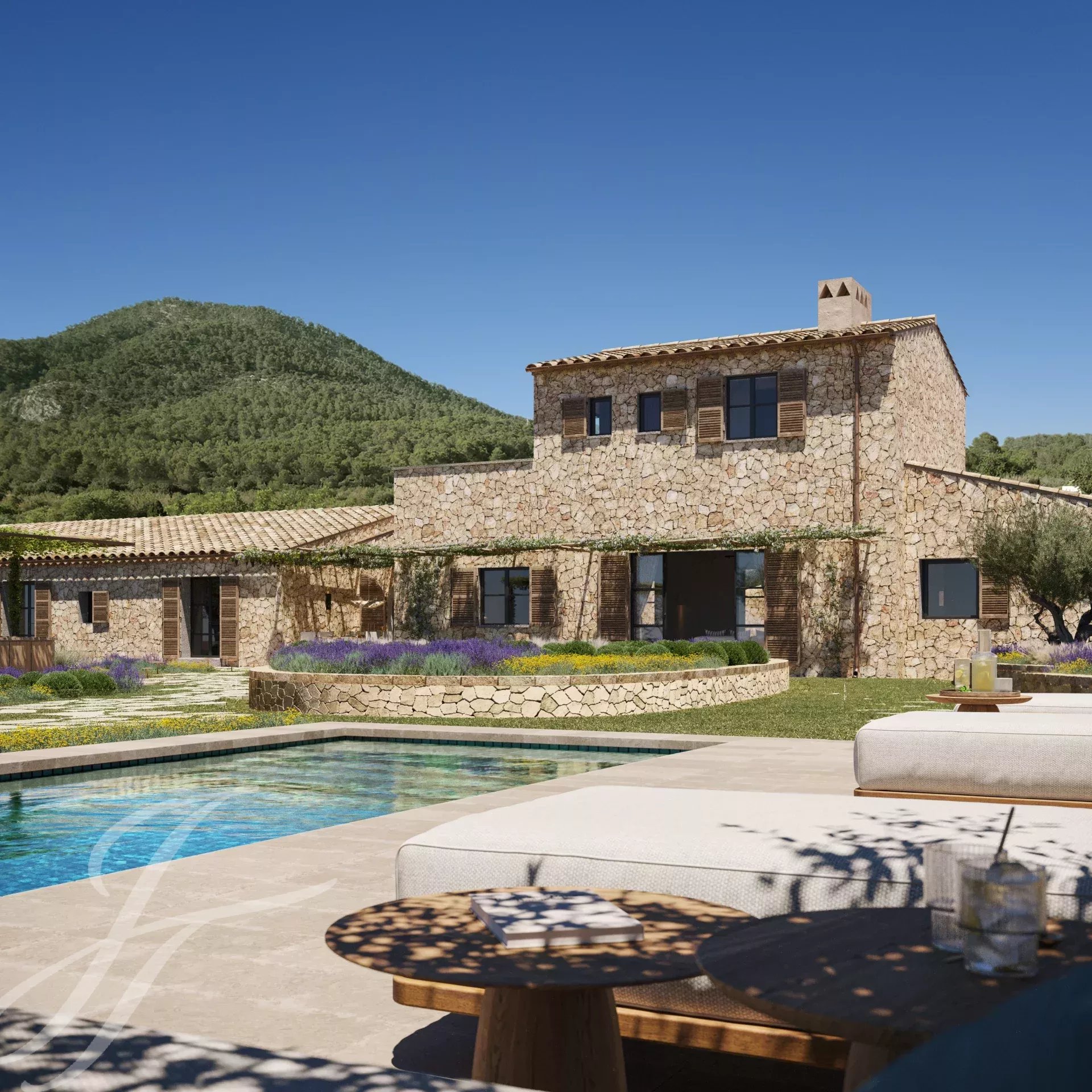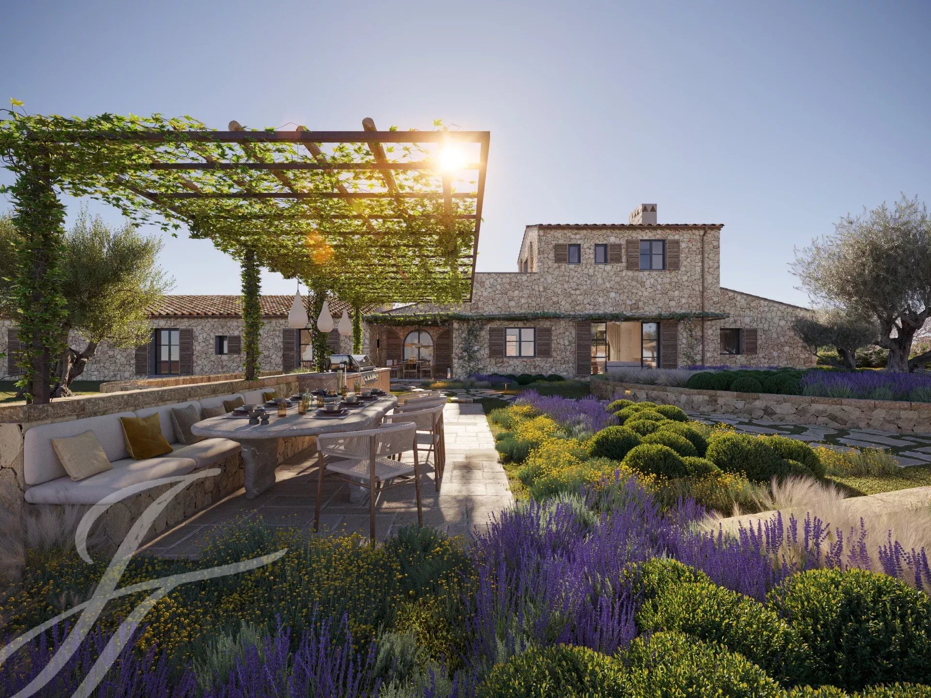 Cette belle maison de campagne boho-chic est actuellement en construction. Située dans l'un des endroits les plus recherchés de la campagne, à proximité de la ville et de l'aéroport, elle assure un accès facile et confortable à la propriété. Le patio d'entrée, la façade en pierre, les volets en bois, les hauts plafonds avec des poutres en bois et des plafonds en dôme, le sol en pierre, les fenêtres du sol au plafond et l'aménagement paysager méditerranéen créent une énergie fantastique et un flux naturel dans toute la maison.