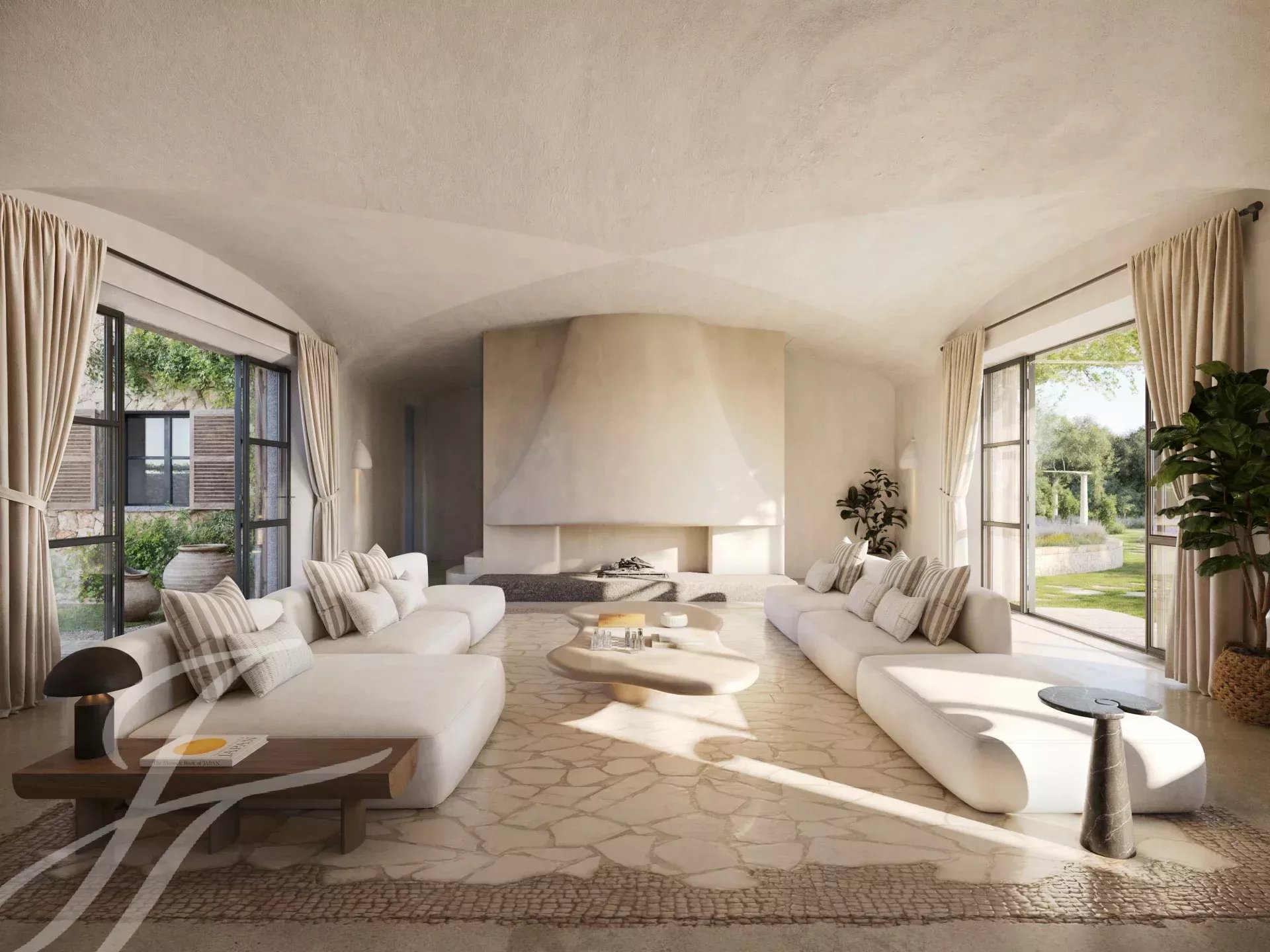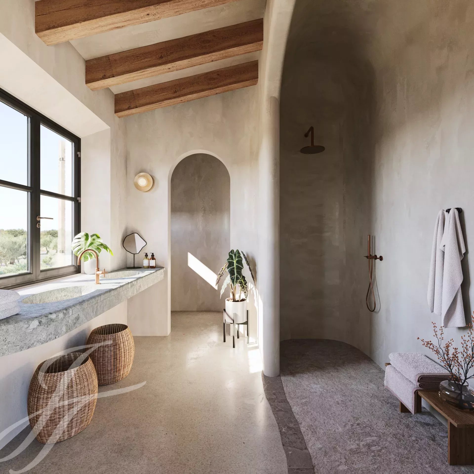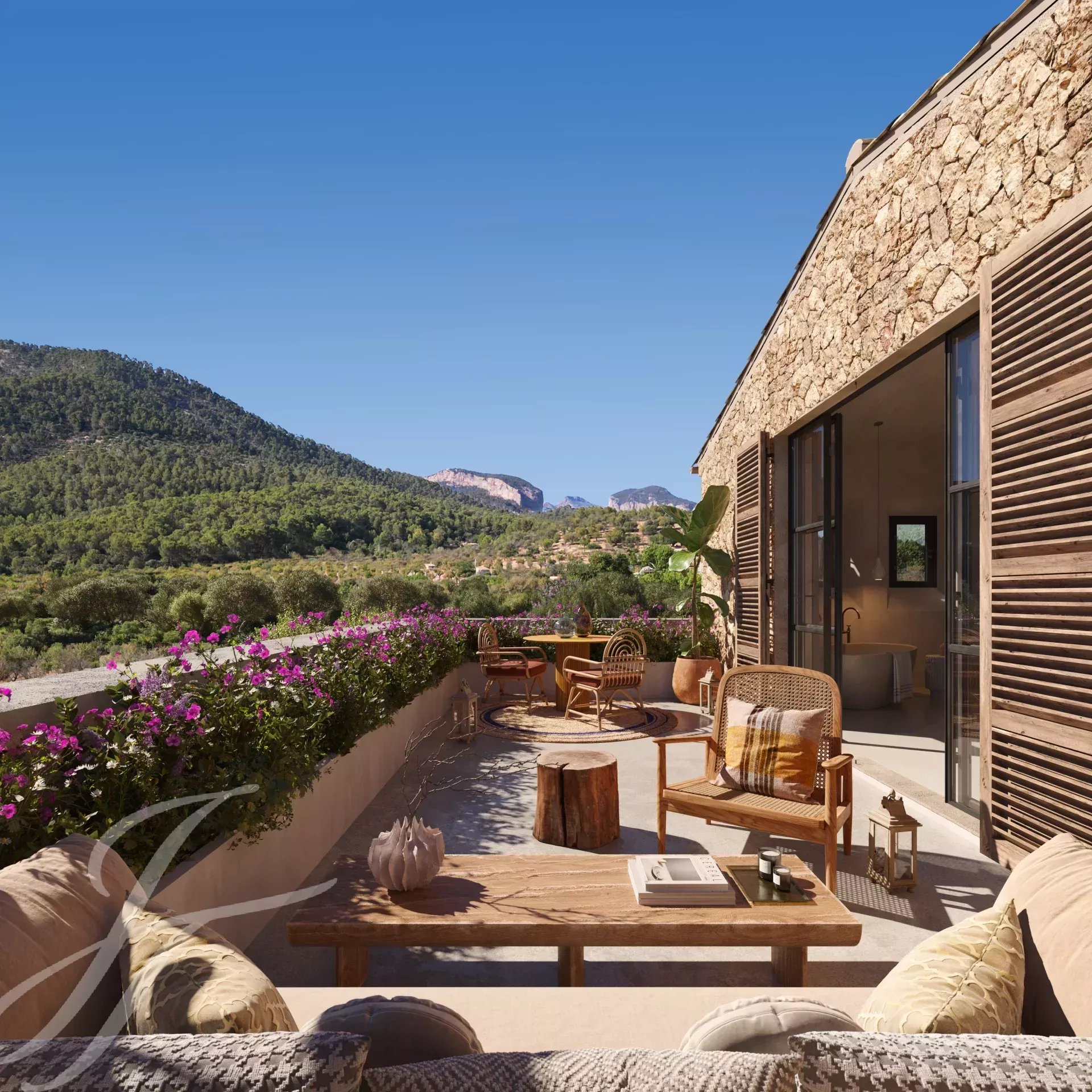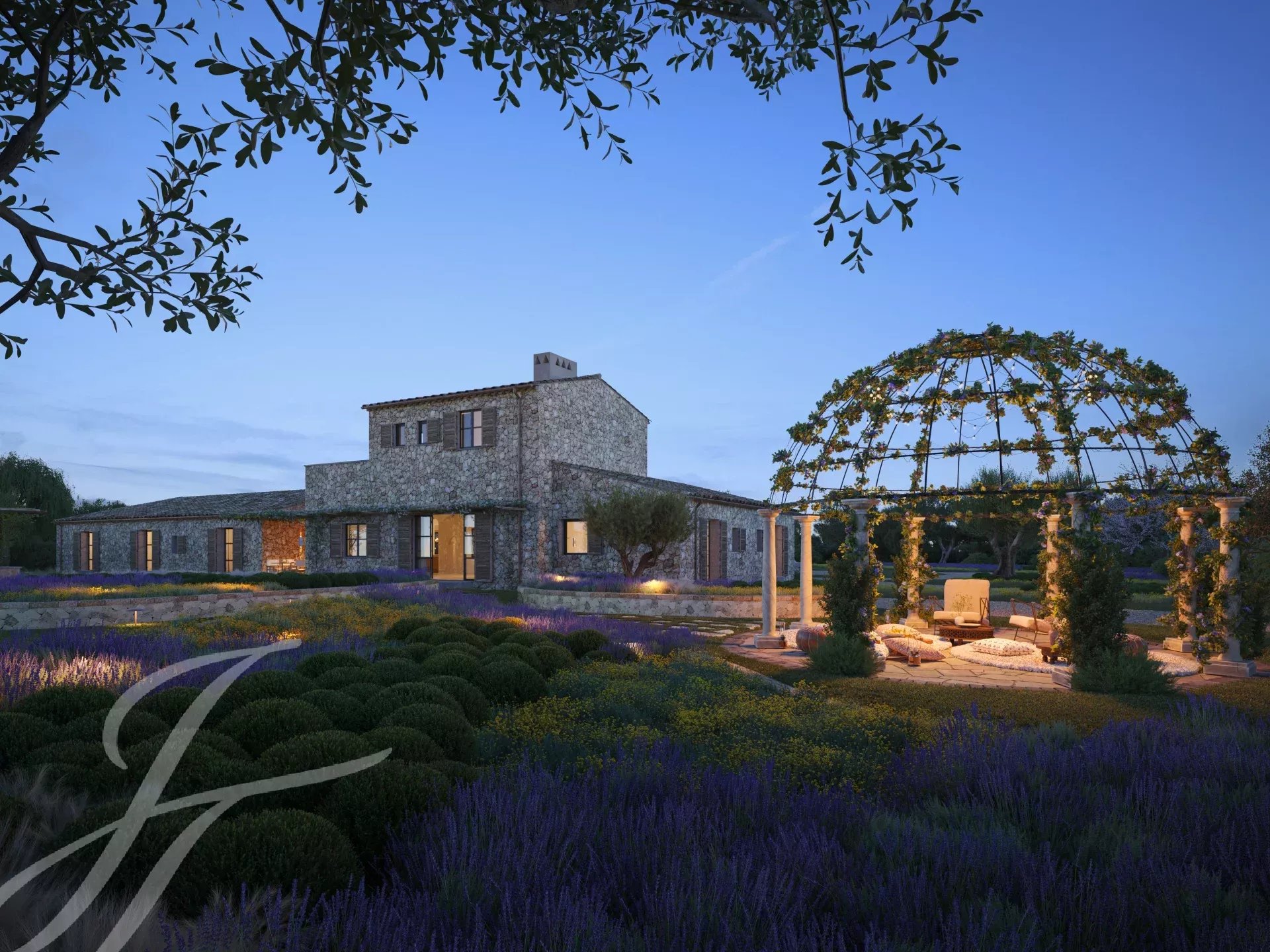 Cette belle maison de campagne boho-chic est actuellement en construction. Située dans l'un des endroits les plus recherchés de la campagne, à proximité de la ville et de l'aéroport, elle assure un accès facile et confortable à la propriété. Le patio d'entrée, la façade en pierre, les volets en bois, les hauts plafonds avec des poutres en bois et des plafonds en dôme, le sol en pierre, les fenêtres du sol au plafond et l'aménagement paysager méditerranéen créent une énergie fantastique et un flux naturel dans toute la maison.