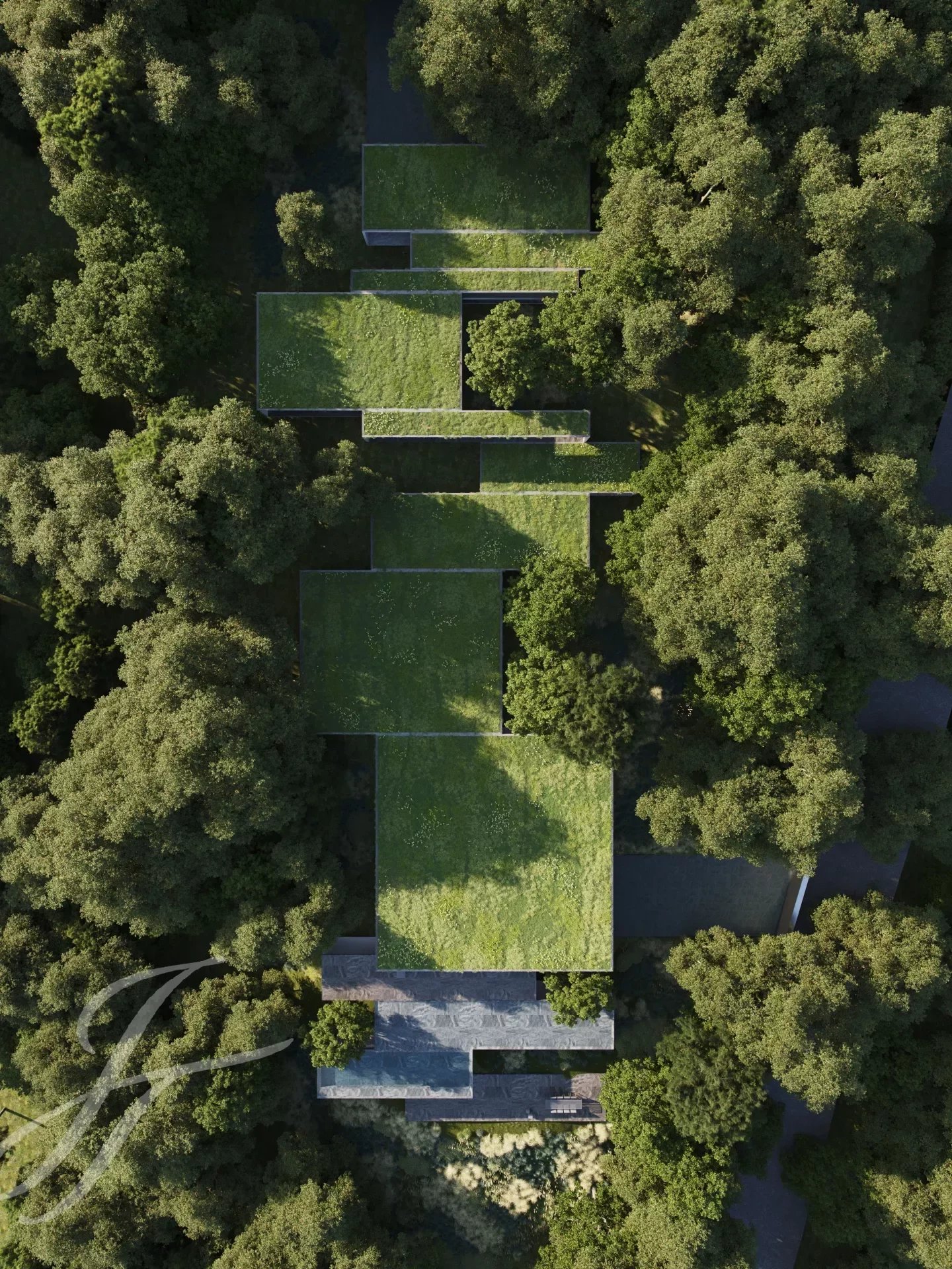 L'architecture de la villa reflète la topographie unique du terrain, avec une structure qui suit la forme allongée et inclinée du terrain, tandis que les panneaux d'aluminium réfléchissants créent une illusion de continuité entre la structure et la forêt. Cette conception réduit la proéminence visuelle de la maison, soulignant la beauté de l'environnement naturel.