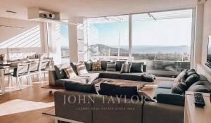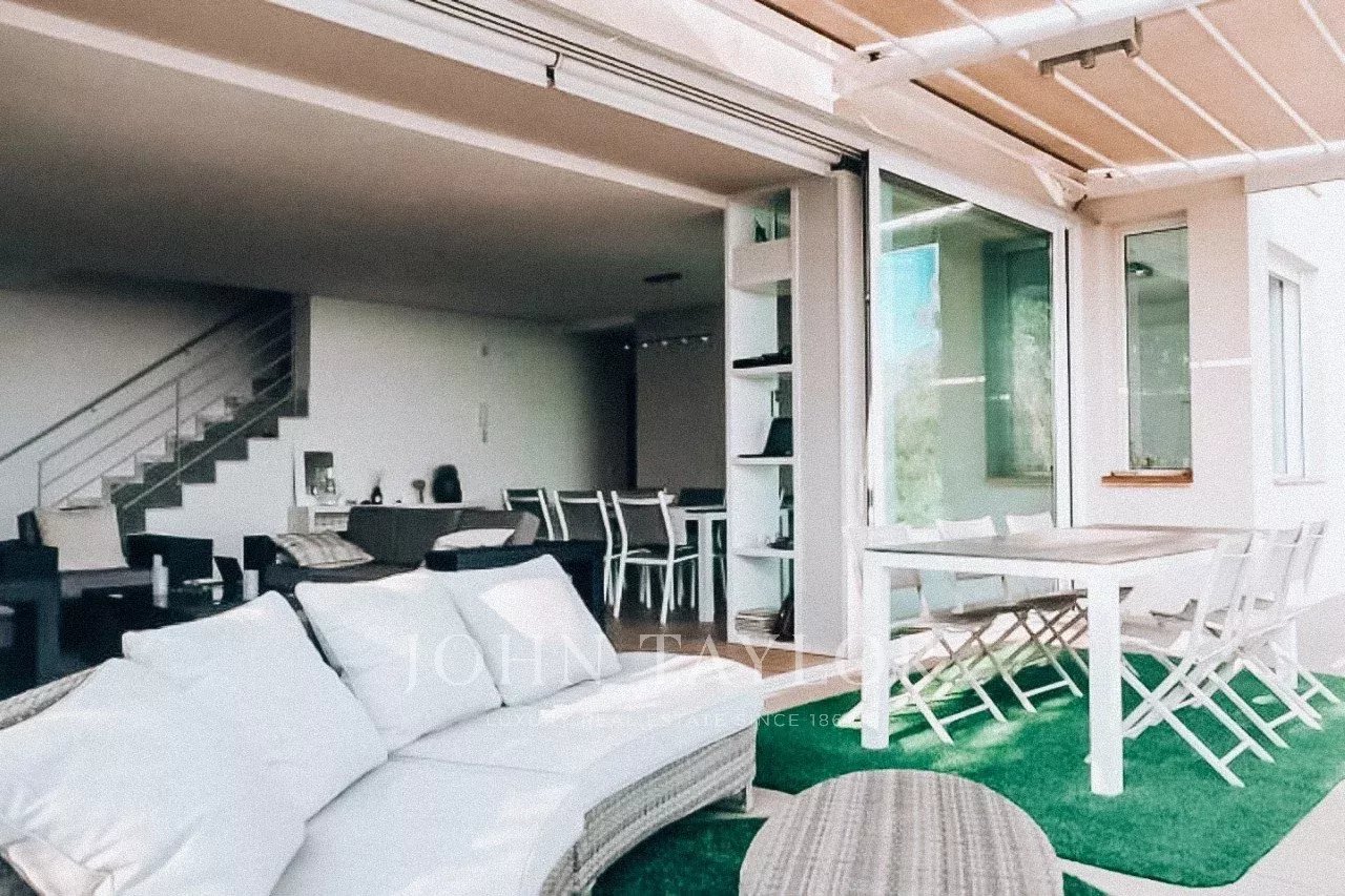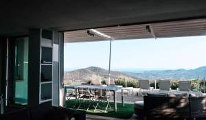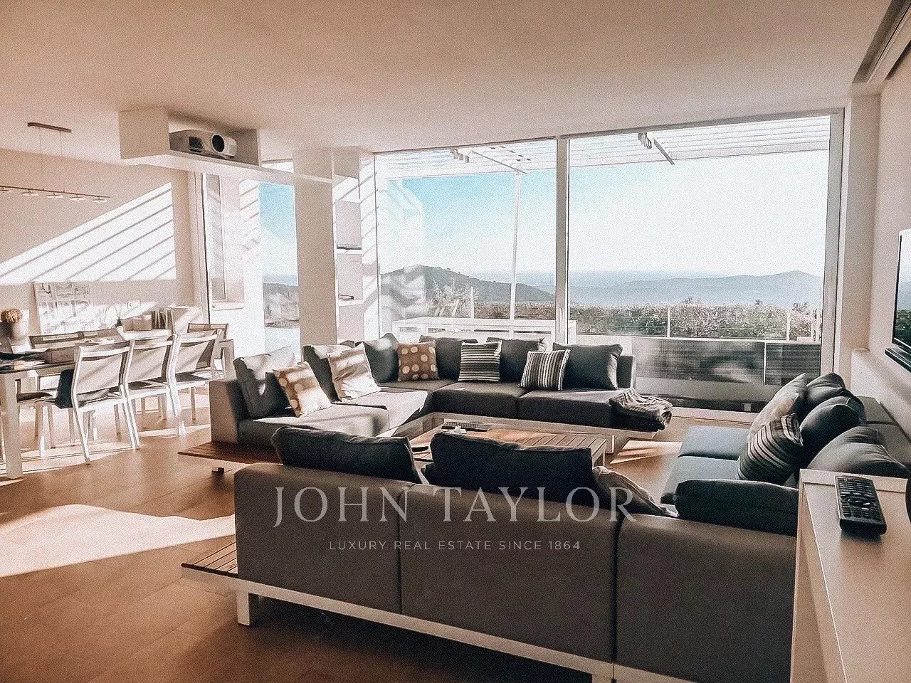 Salon/salle à manger de 49m² attenant à une grande terrasse de 160m² séparée par de grandes fenêtres coulissantes.