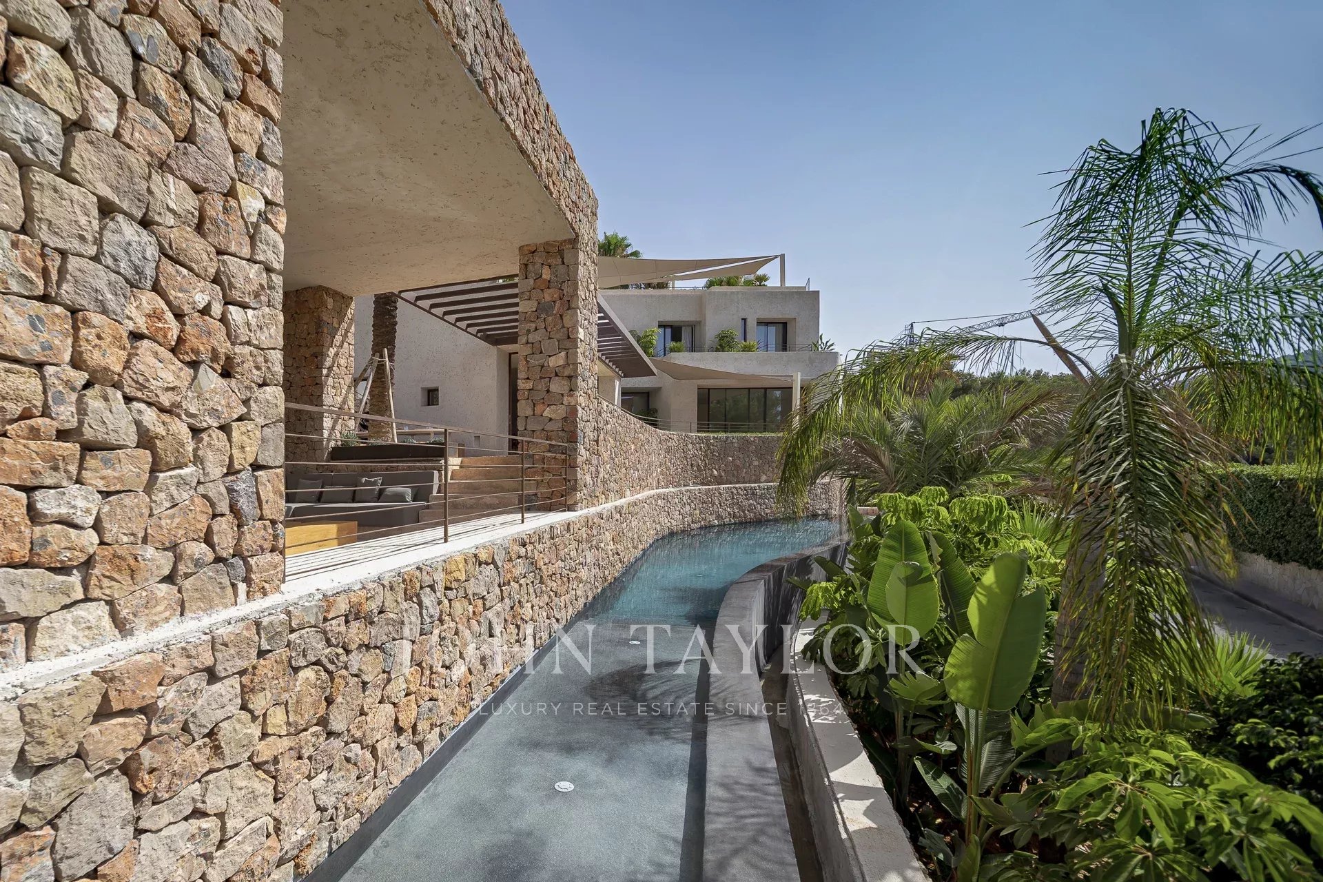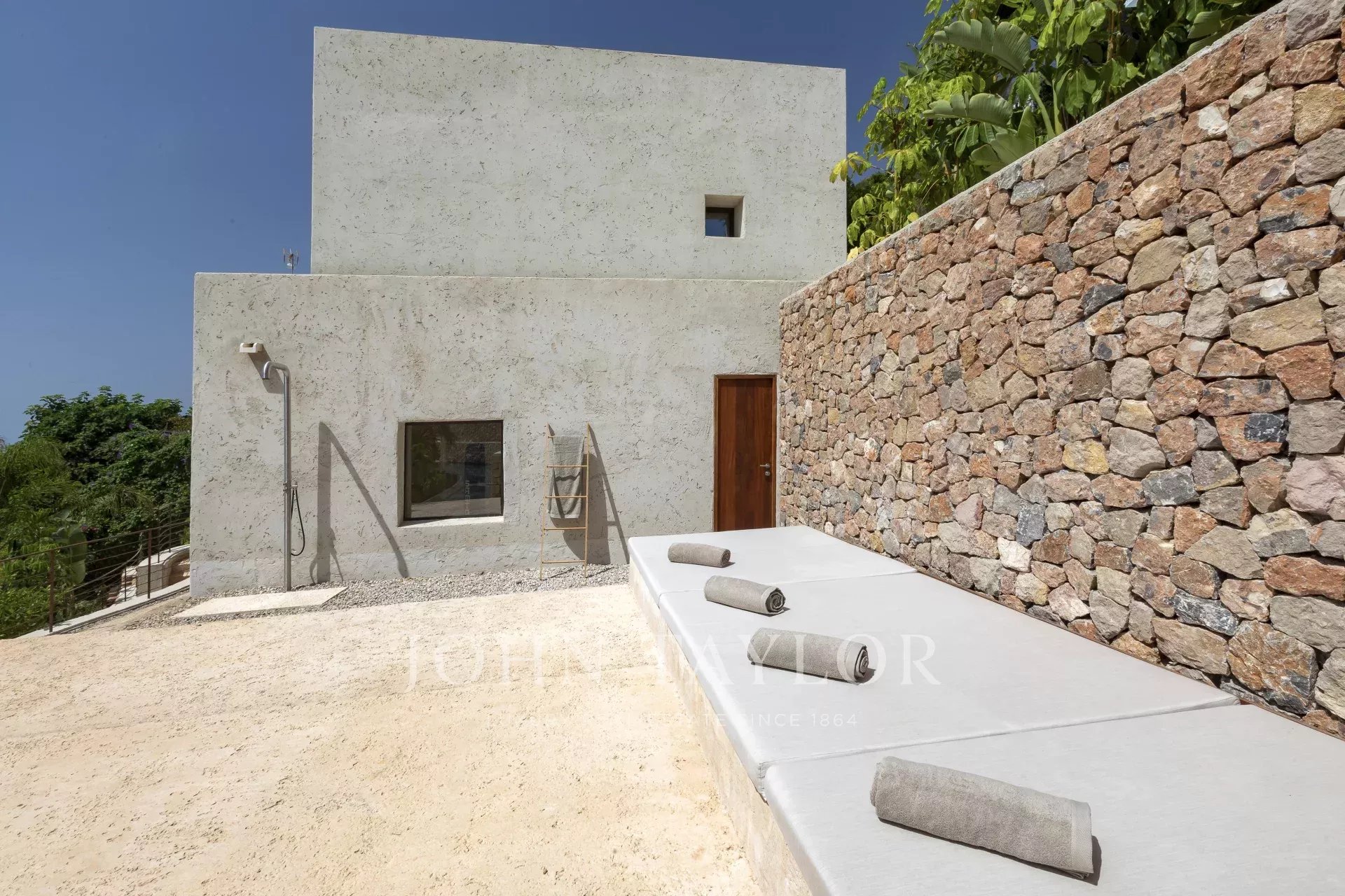 L'ensemble de la maison donne sur Ibiza et la mer Méditerranée, avec une architecture très méditerranéenne et ses plantes dans la piscine rendent cette maison unique dans la région.