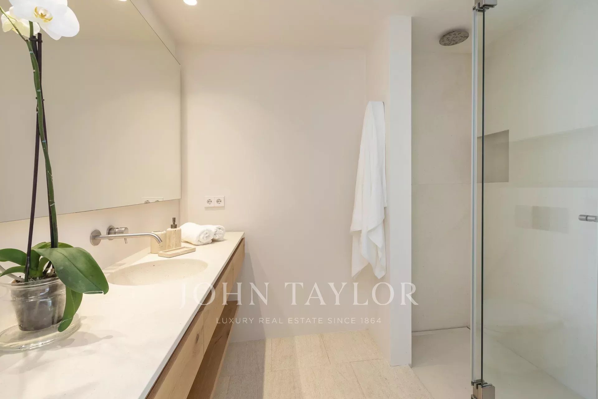 Dans la maison principale, il y a un grand salon avec accès à une salle à manger pour 12 personnes et une cuisine de rêve. Toutes ces pièces bordent la terrasse qui donne accès à la piscine à travers chacune d'entre elles. Si l'on monte à l'étage supérieur, on trouve 4 chambres doubles avec salle de bains et un deuxième salon.