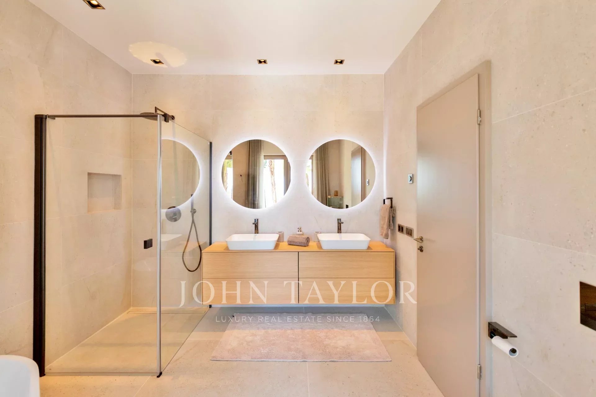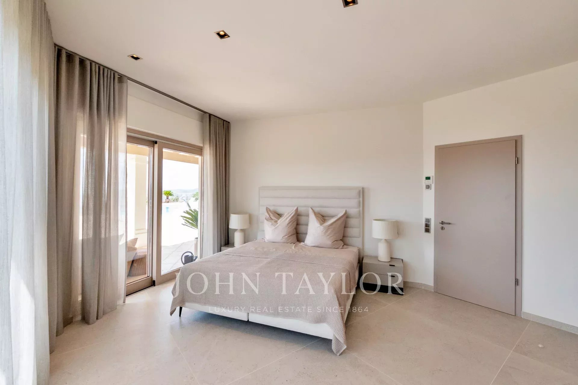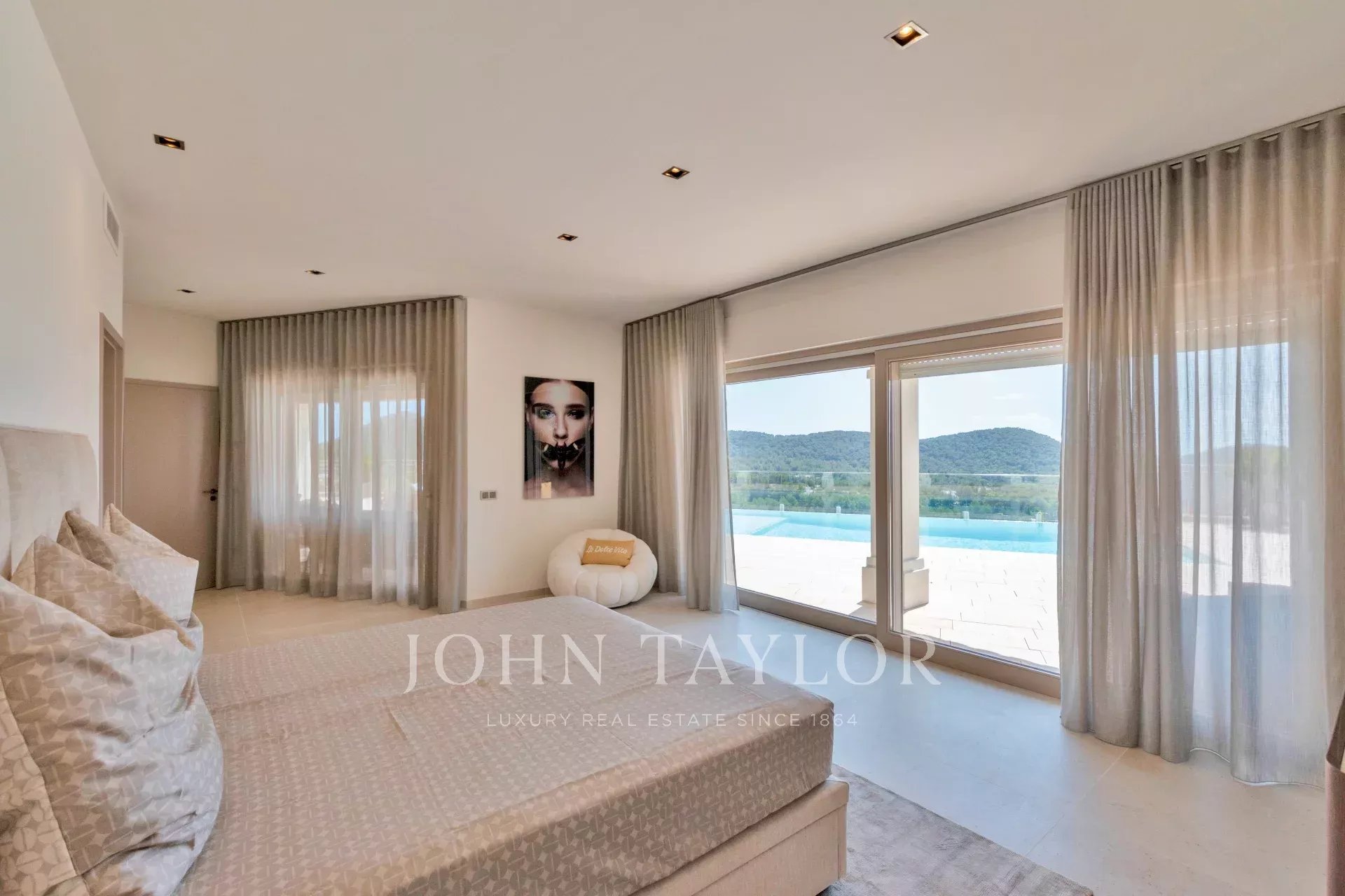 Au niveau supérieur, la villa dispose de quatre chambres spacieuses, toutes avec salle de bains attenante et dressing. Deux d'entre elles sont de vastes suites principales avec accès direct à des terrasses privées offrant des vues spectaculaires sur la ville d'Ibiza et la baie de Talamanca.