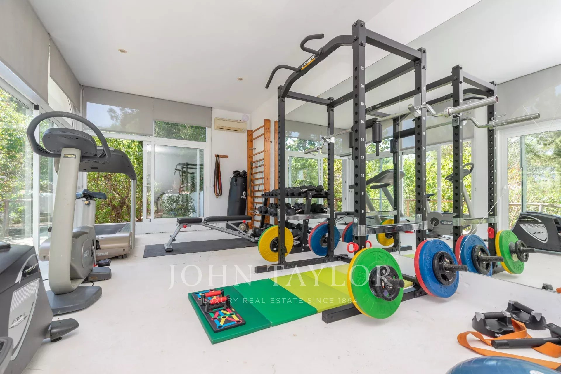 La propriété comprend également un grand garage de 162 m² pouvant accueillir jusqu'à six véhicules, ainsi qu'une salle de sport ultramoderne avec vue sur la mer et équipée de matériel Technogym. D'autres commodités incluent la climatisation, le chauffage électrique, l'internet haut débit, IPTV, un système sonore SONOS, une buanderie et un éclairage extérieur avec plus de 350 lampes.