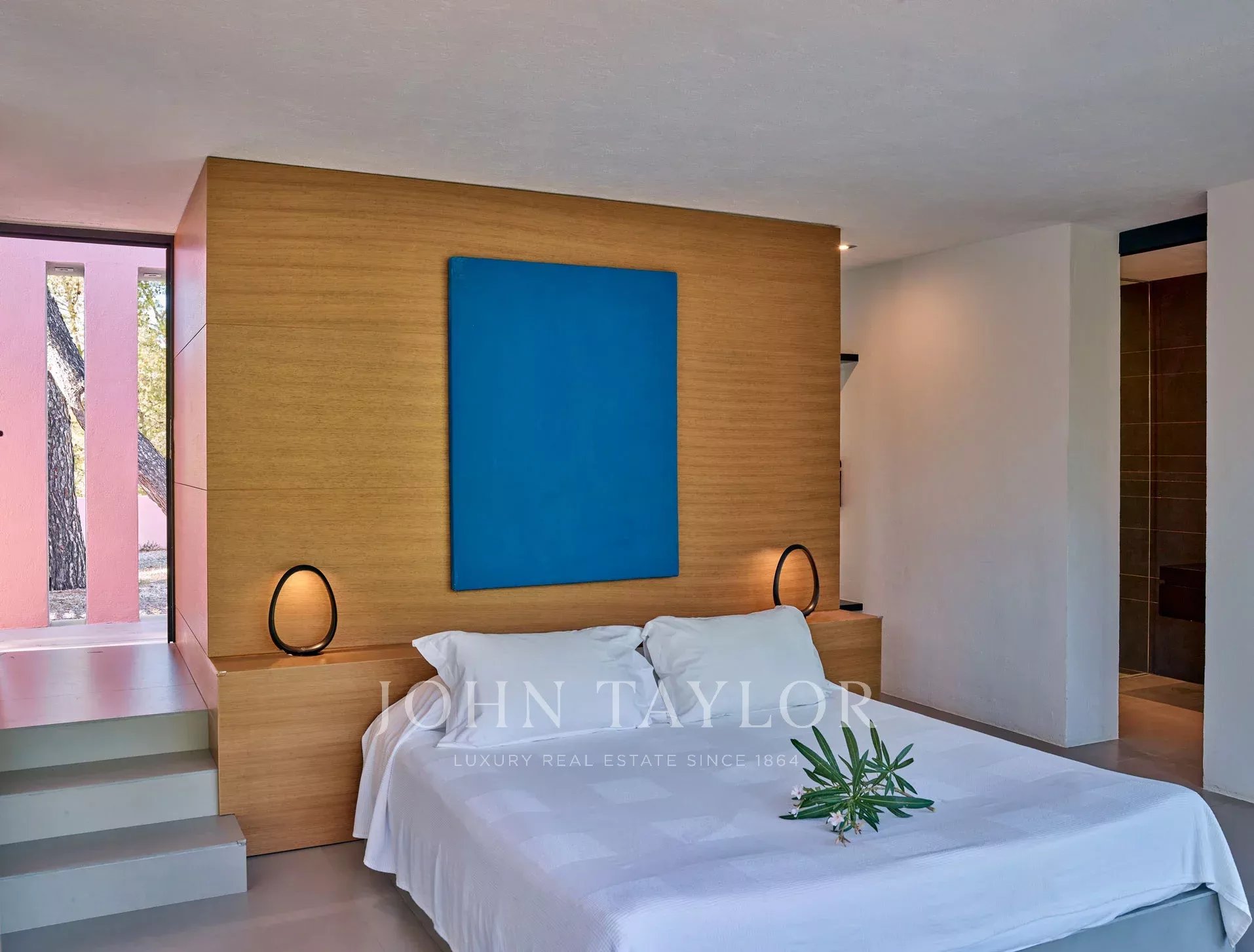 La villa dispose de plusieurs chambres avec salle de bains attenante, toutes avec accès à l'extérieur via de grandes portes coulissantes. La chambre principale, avec une salle de bains privative comprenant une douche séparée avec jets latéraux, est connectée à la pièce principale, mais offre également de l'intimité grâce à des portes coulissantes. D'autres chambres ont un accès direct au jardin ou à une terrasse en bois sous la piscine, créant une ambiance unique et relaxante.