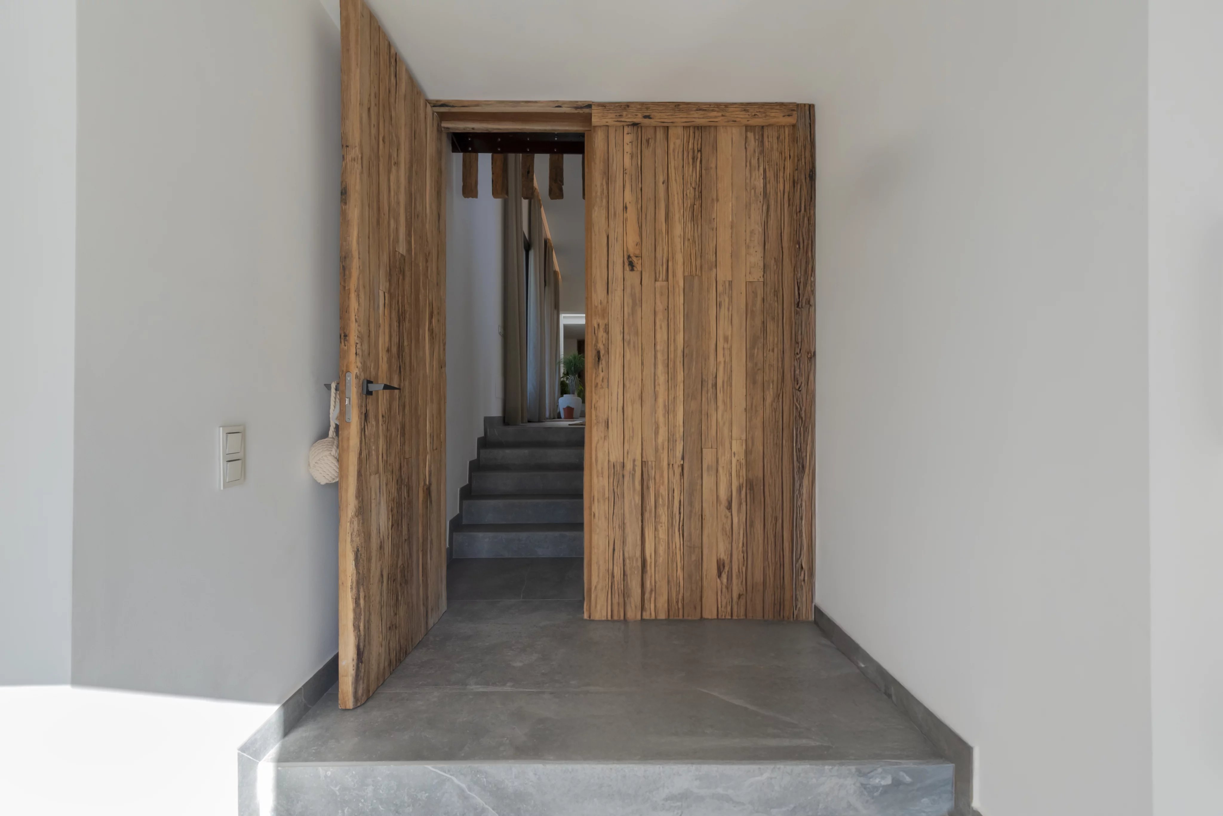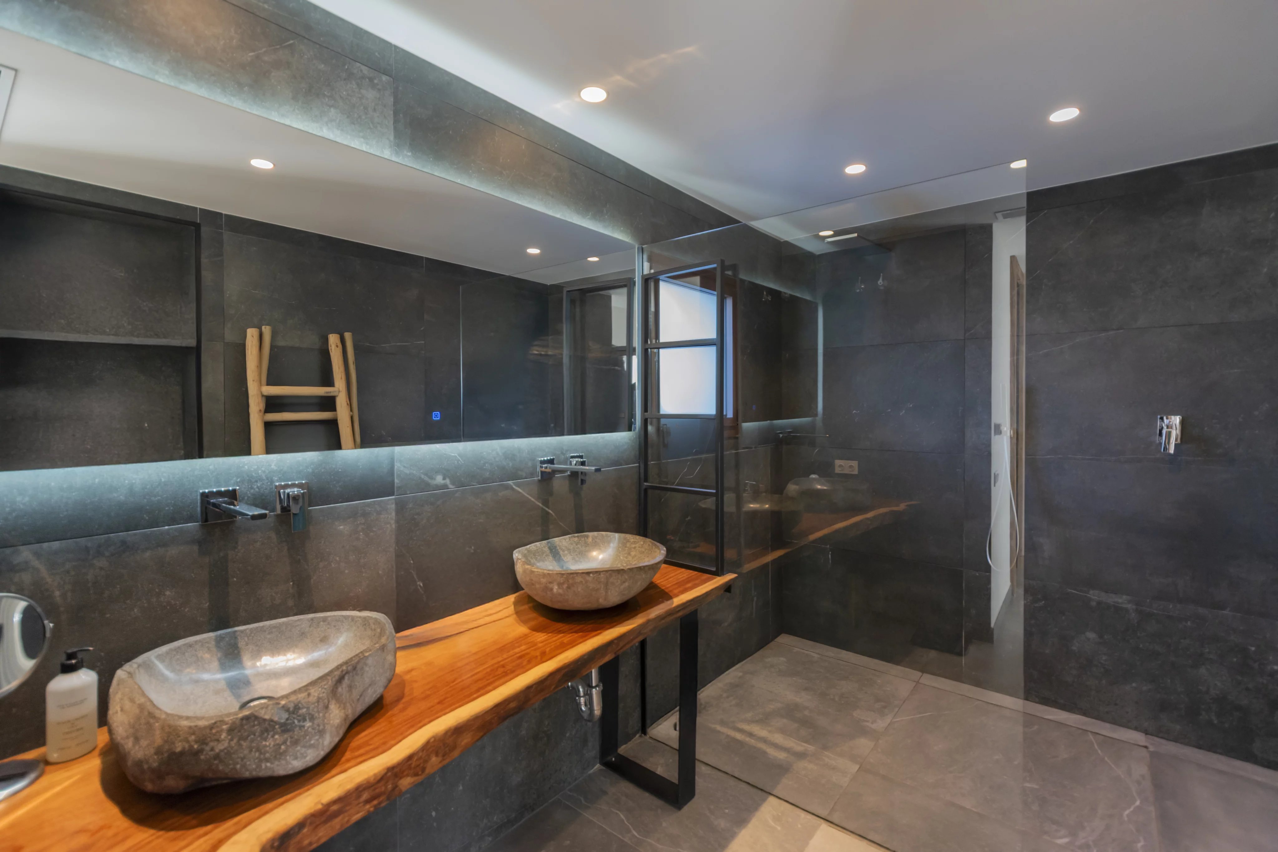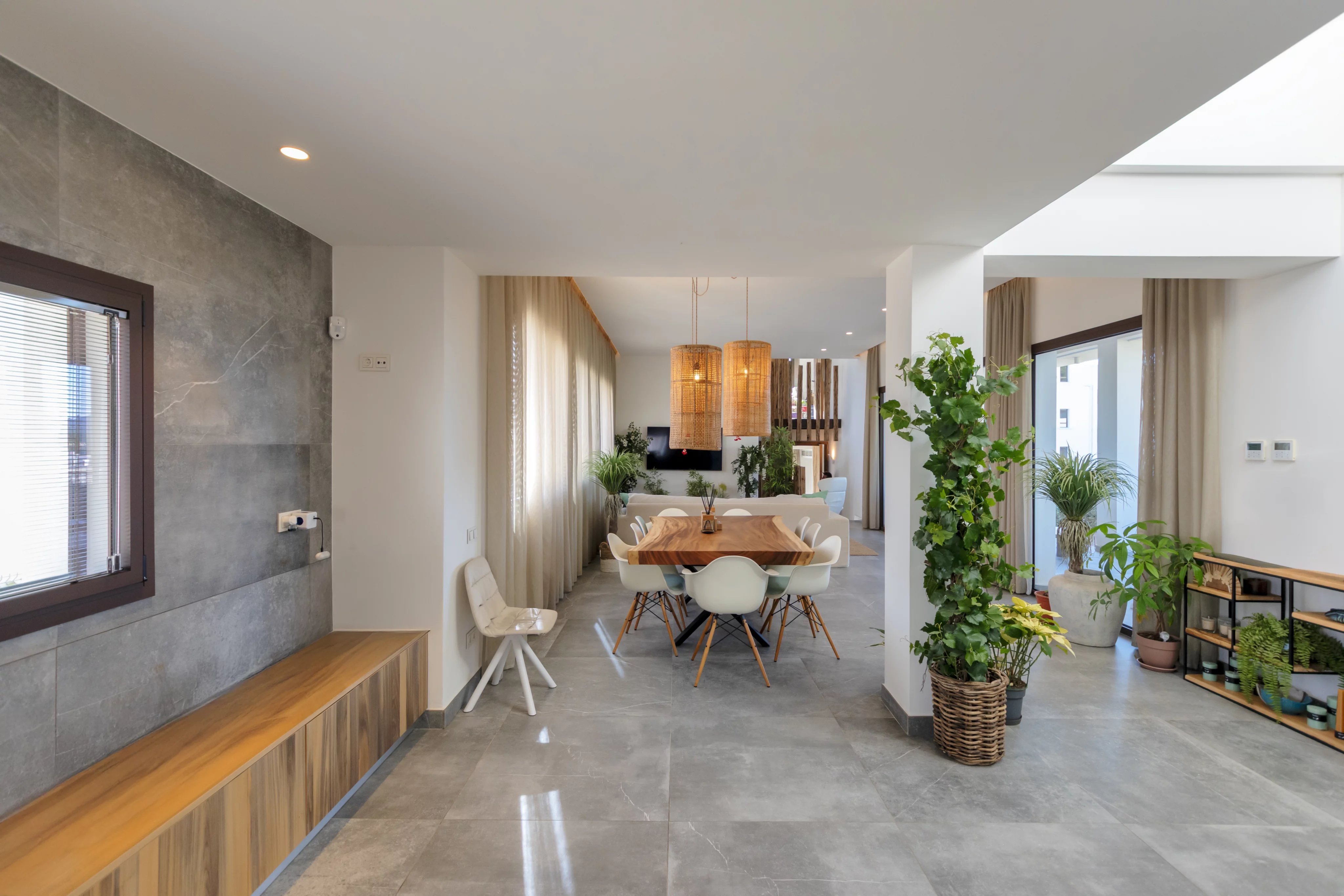 La pièce principale se compose d’un élégant salon-salle à manger avec cuisine ouverte, doté de larges baies vitrées et d’un accès direct aux terrasses et à la piscine privée, idéal pour la vie quotidienne comme pour recevoir.