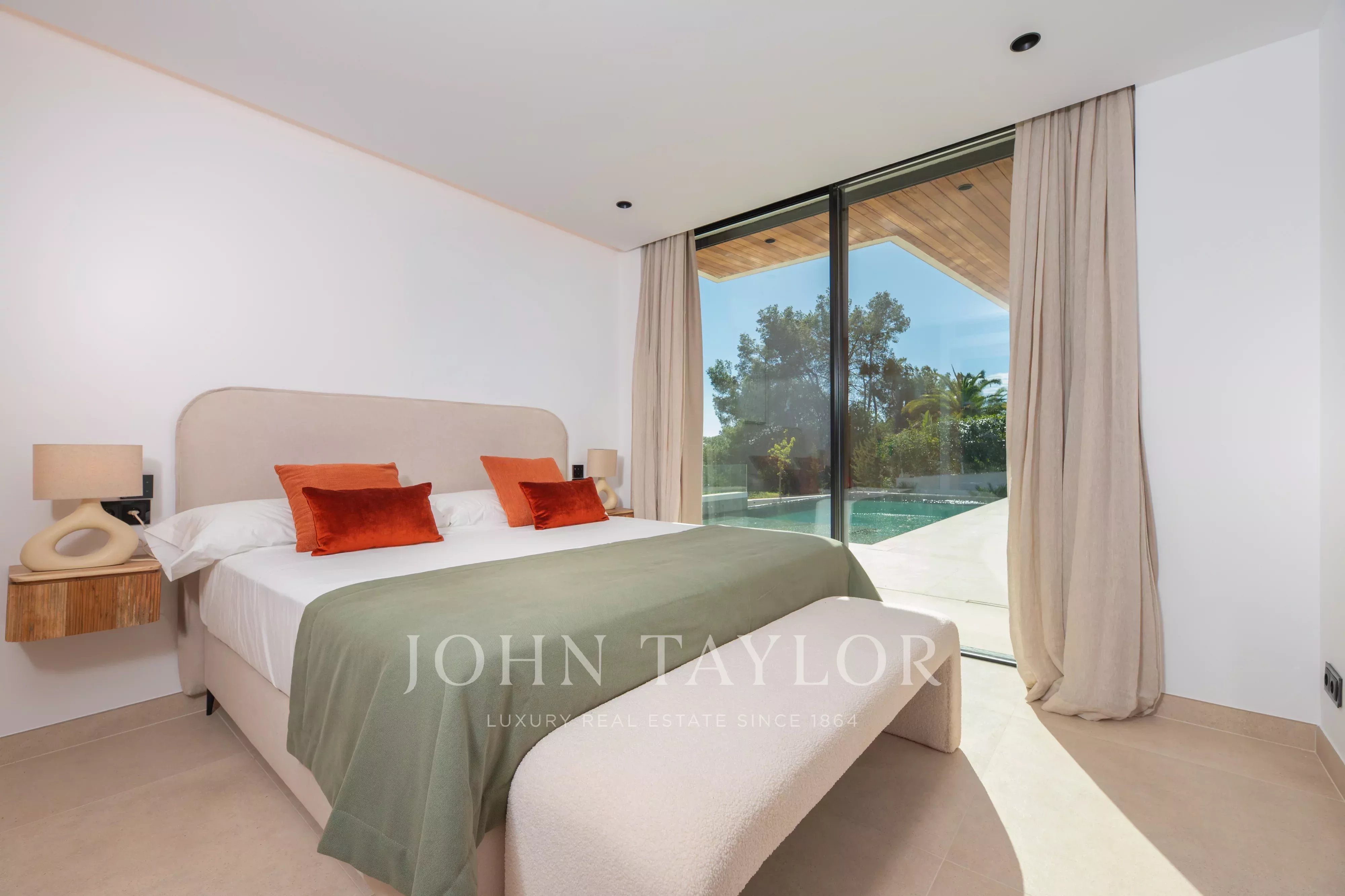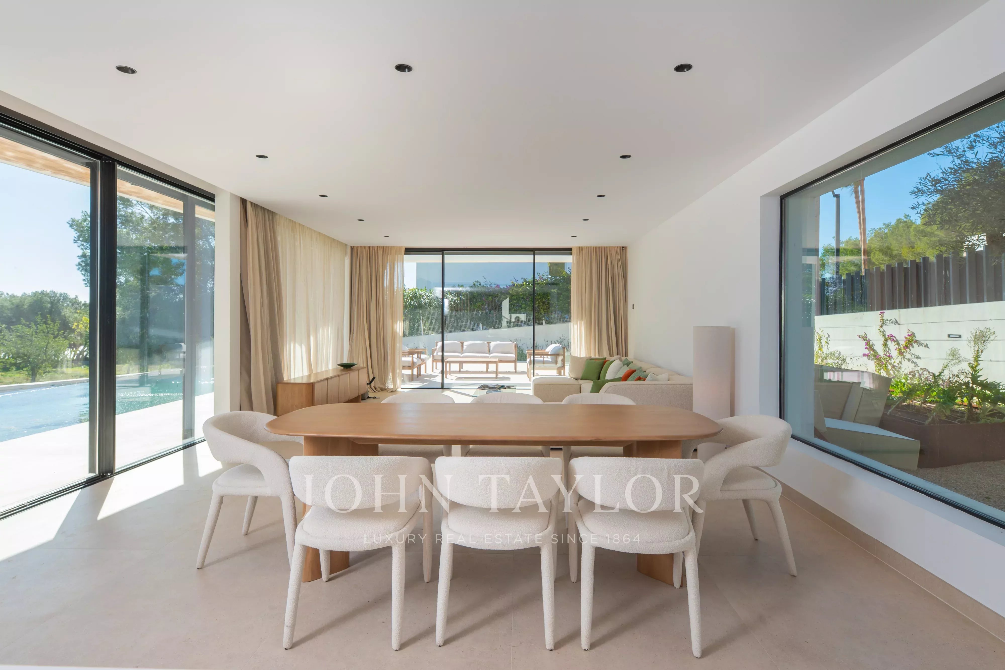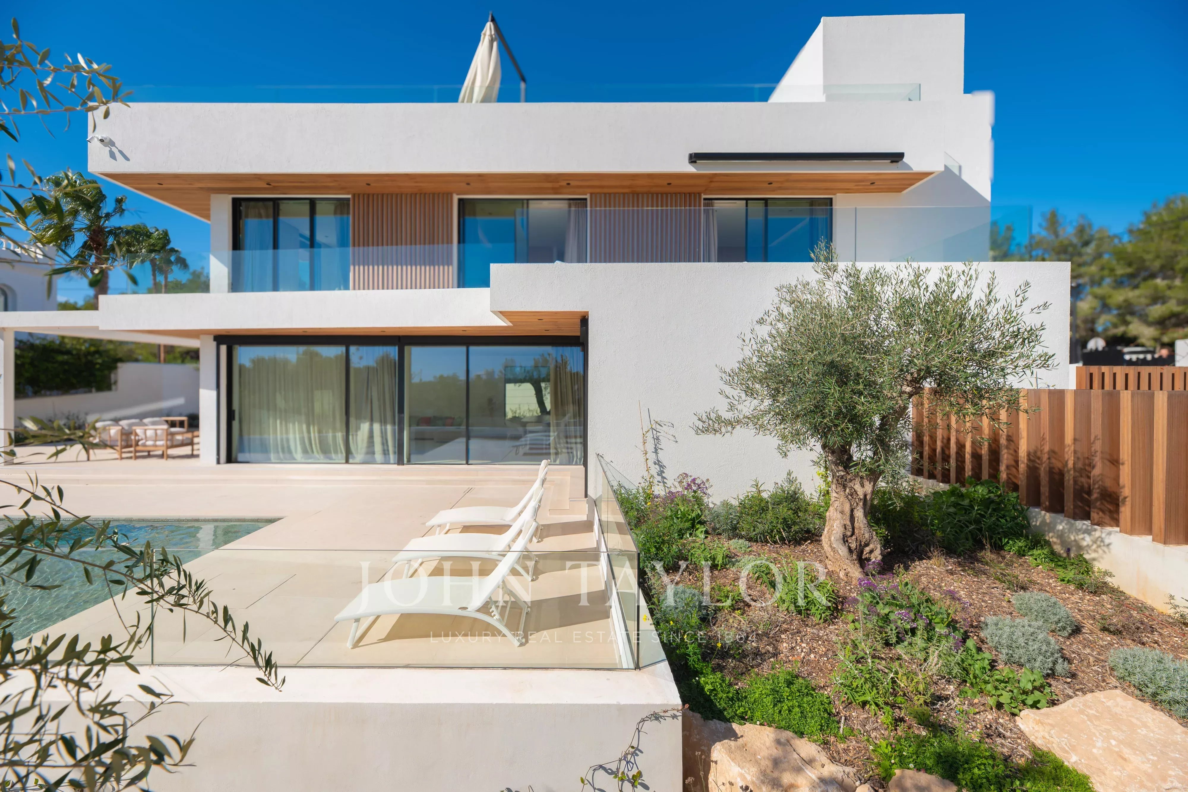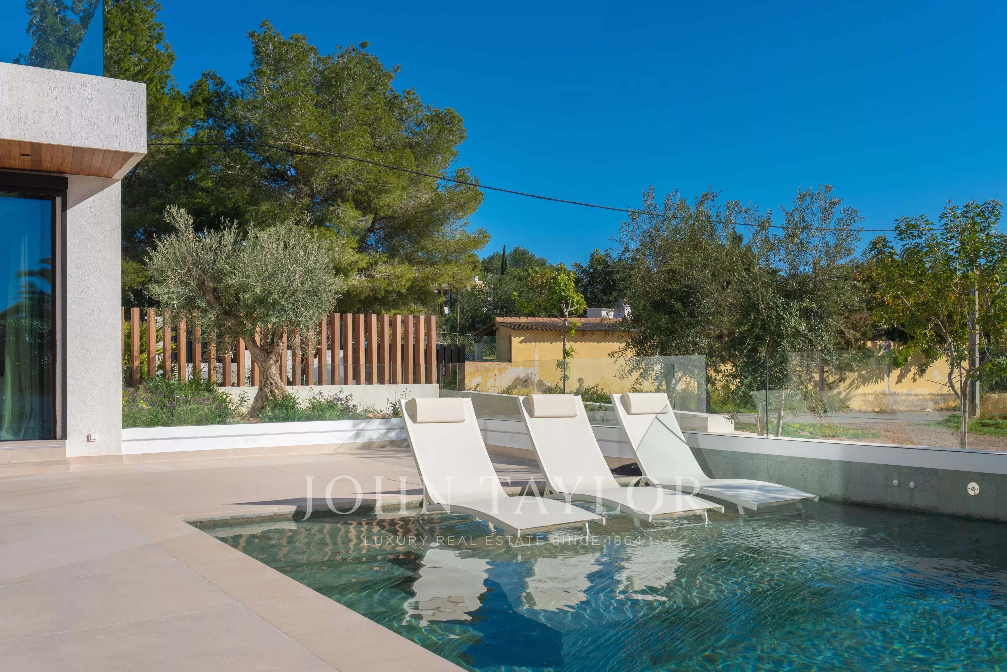 De grandes baies vitrées donnent accès direct à l’extérieur, où se trouvent une agréable terrasse couverte, parfaite pour les repas en plein air, ainsi qu’un bel espace piscine privé, idéal pour profiter du climat d’Ibiza toute l’année.