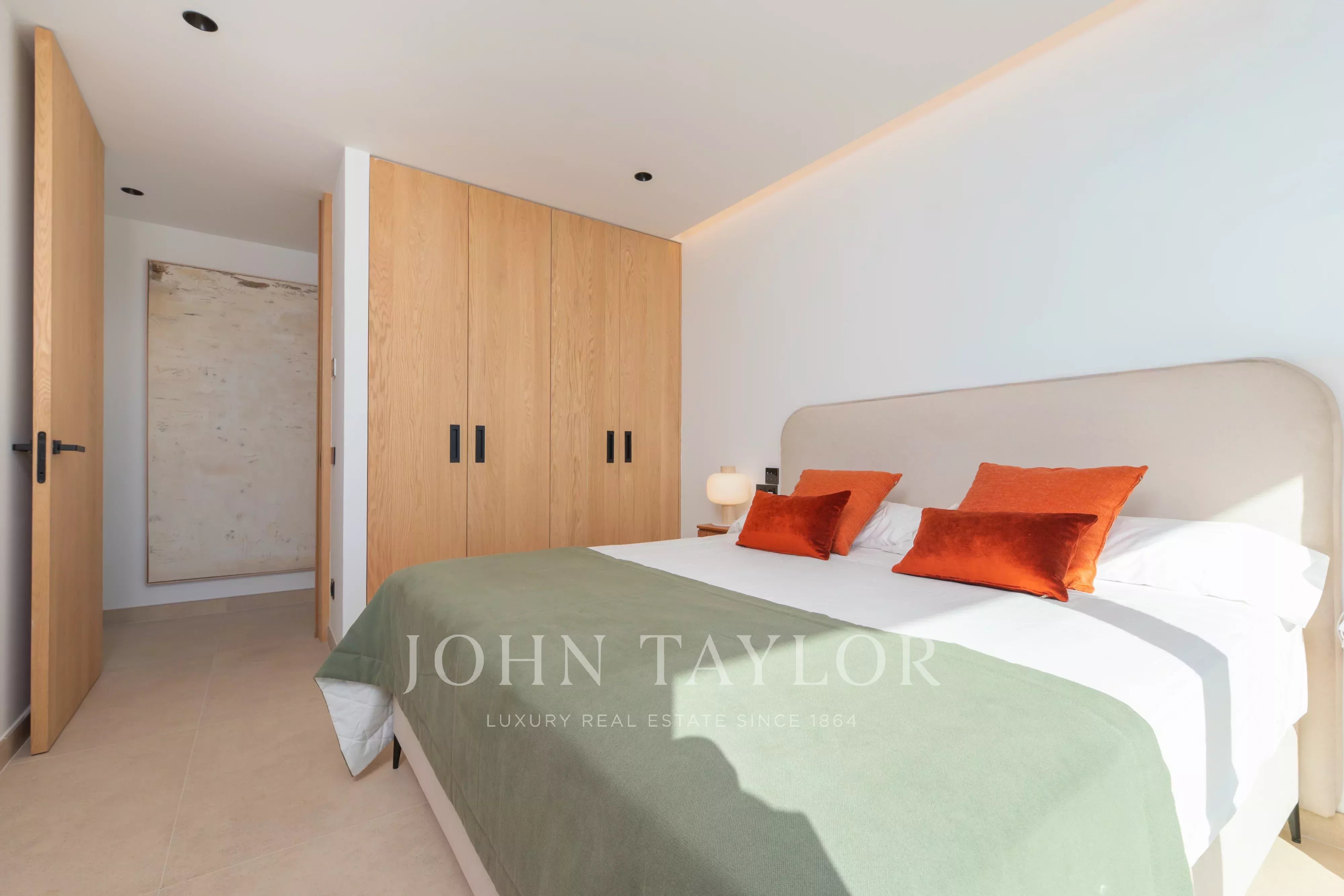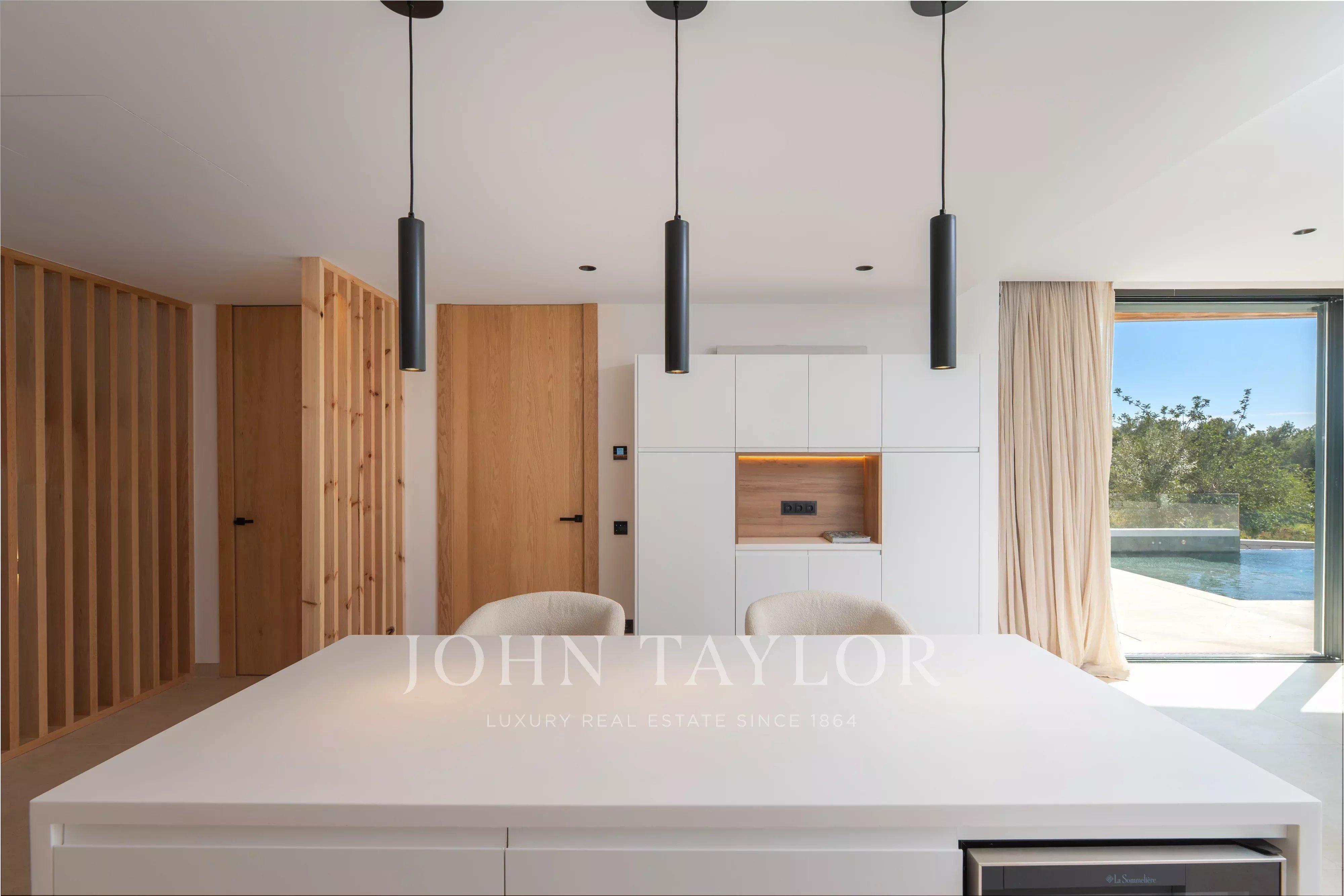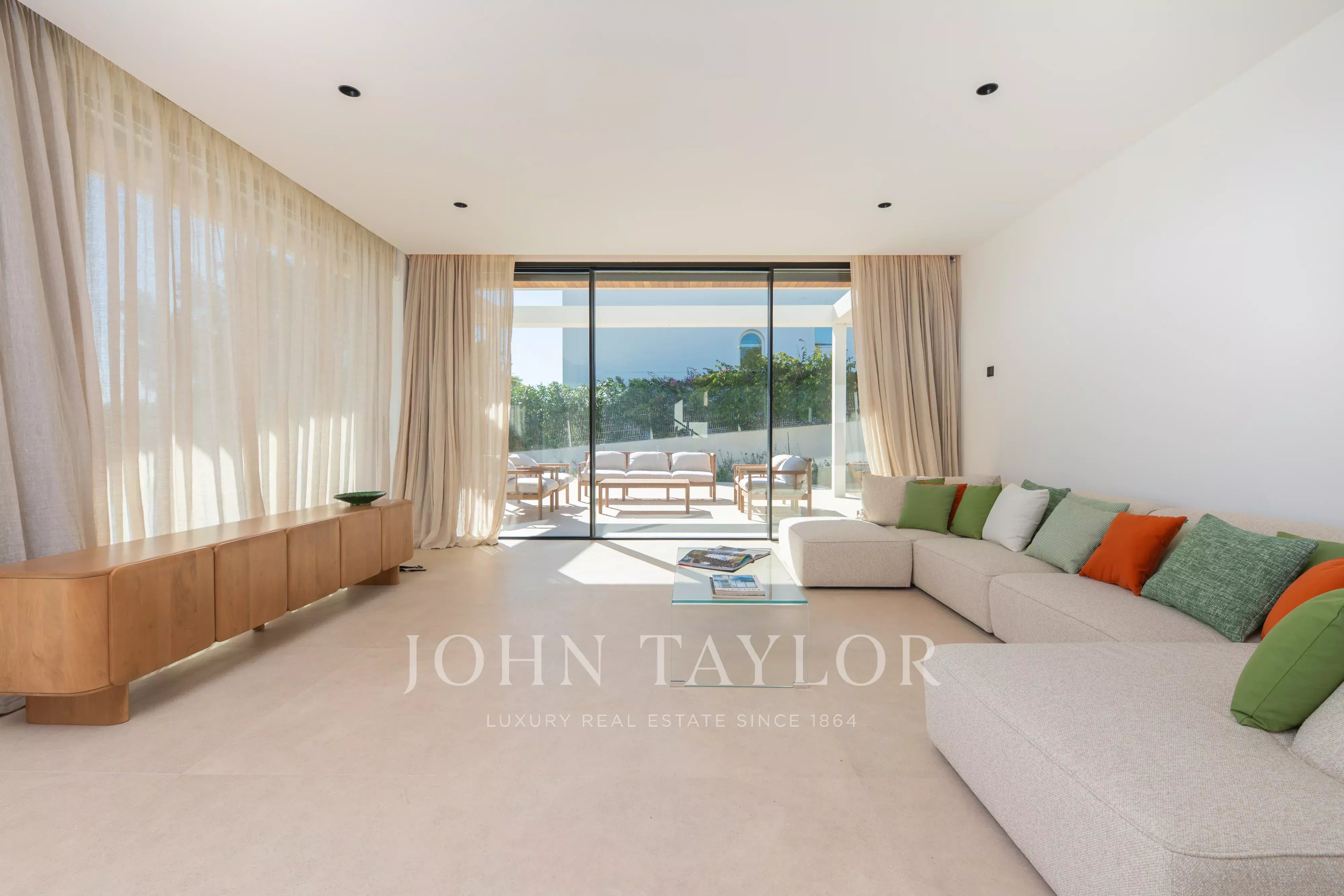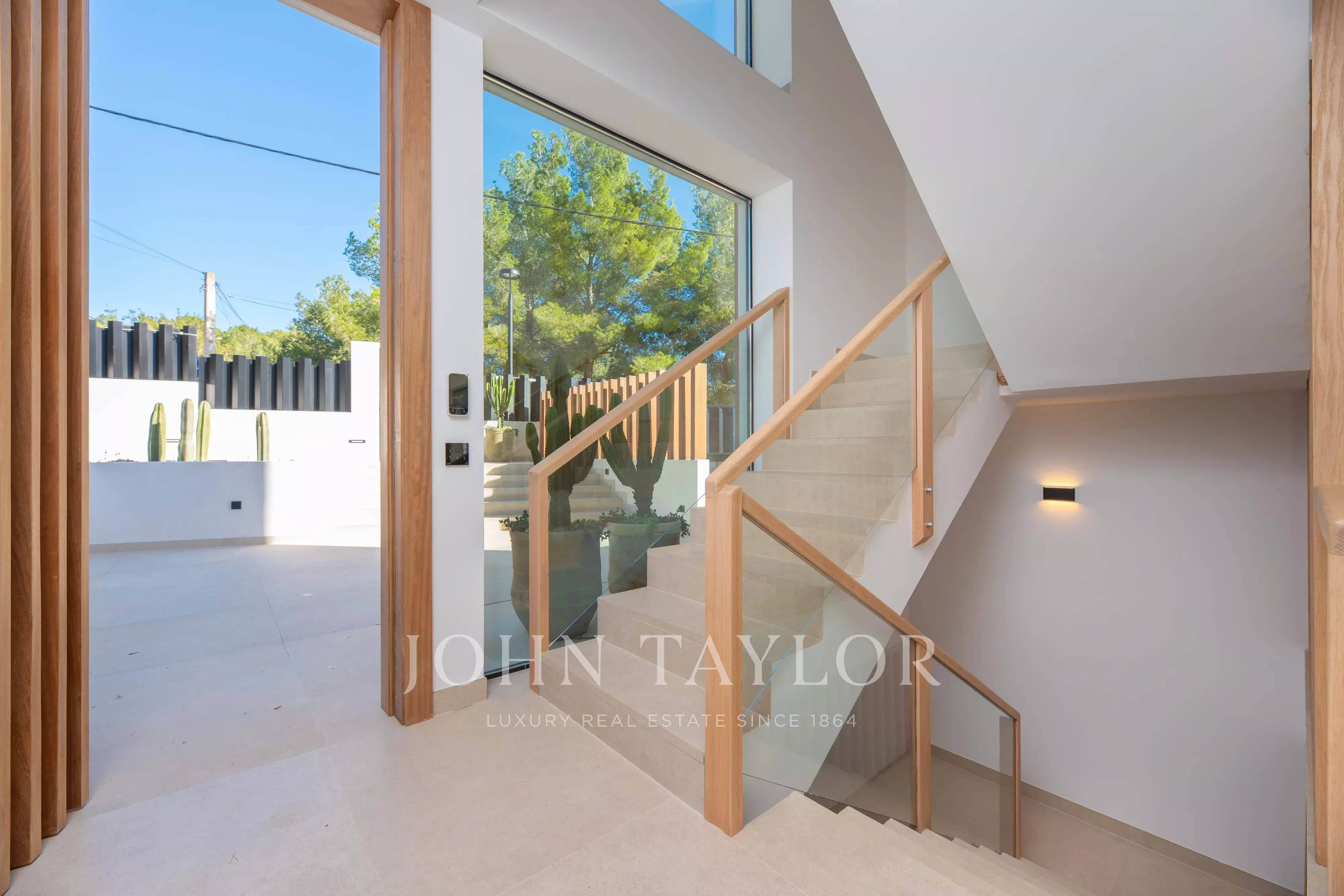 De grandes baies vitrées donnent accès direct à l’extérieur, où se trouvent une agréable terrasse couverte, parfaite pour les repas en plein air, ainsi qu’un bel espace piscine privé, idéal pour profiter du climat d’Ibiza toute l’année.