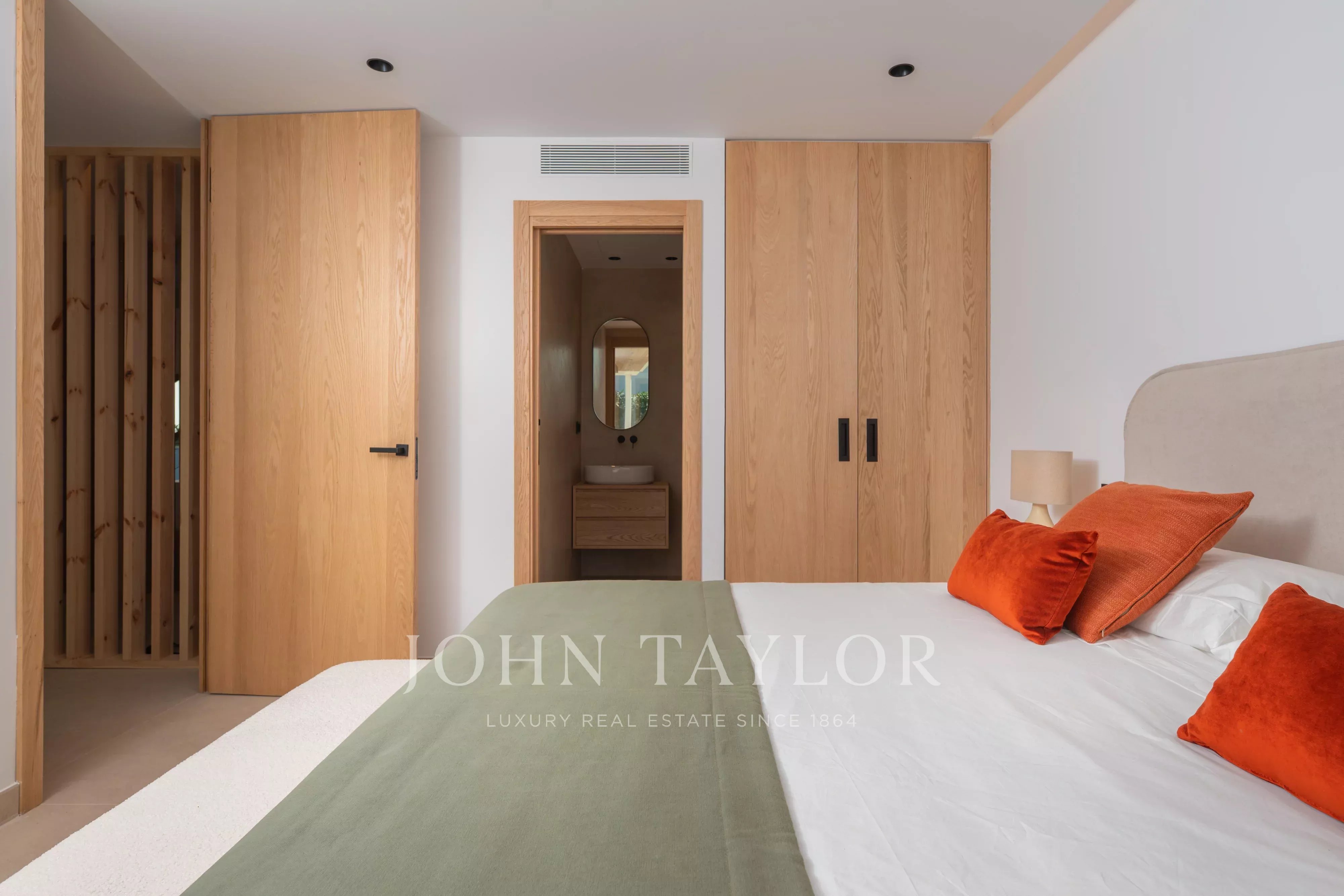 À l’étage, la villa dispose de trois chambres, toutes avec salle de bains en suite, garantissant intimité et confort. La chambre principale bénéficie également d’un dressing. Les trois chambres ont un accès direct à une grande terrasse offrant une vue dégagée sur la campagne, la piscine et une légère vue sur la mer.