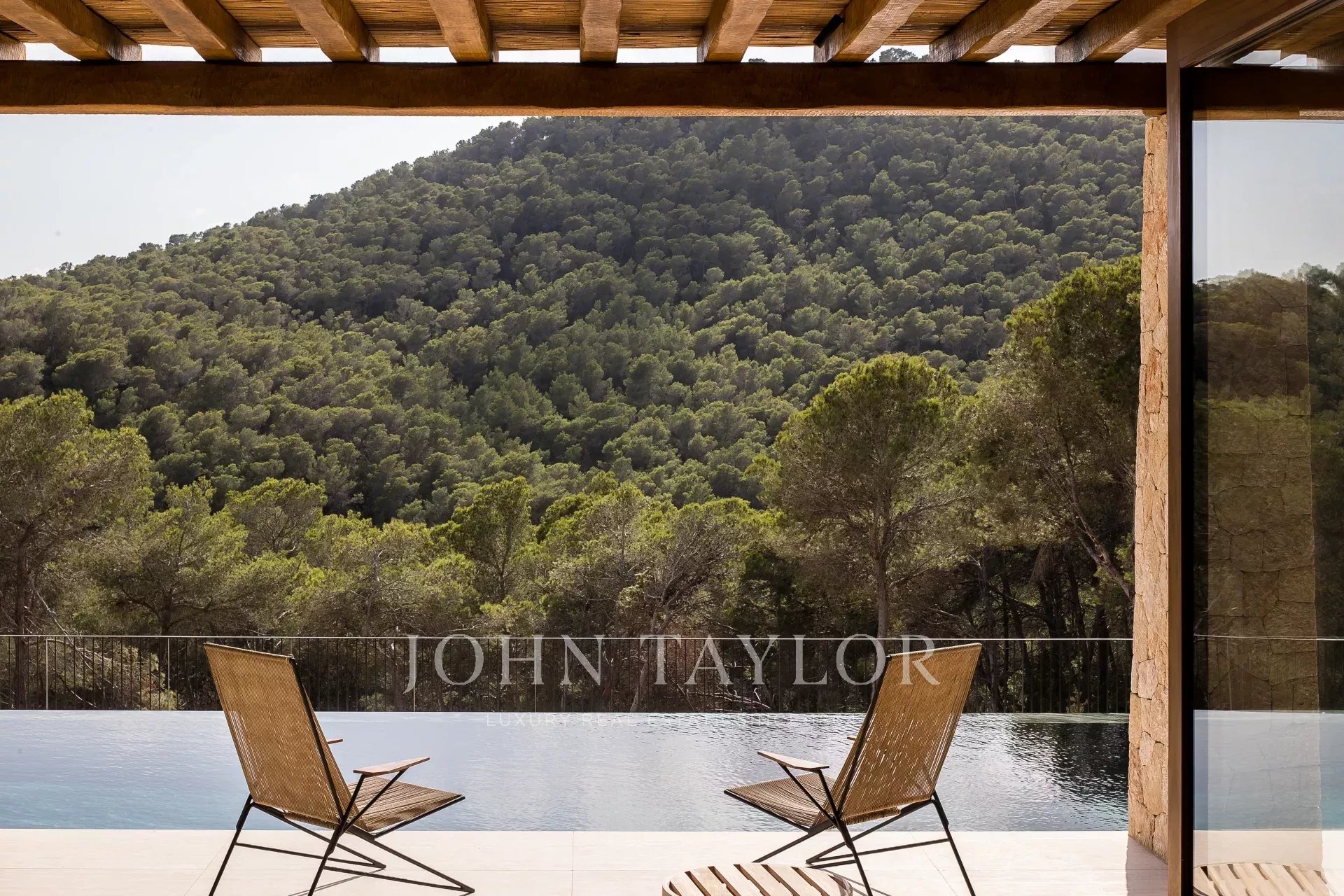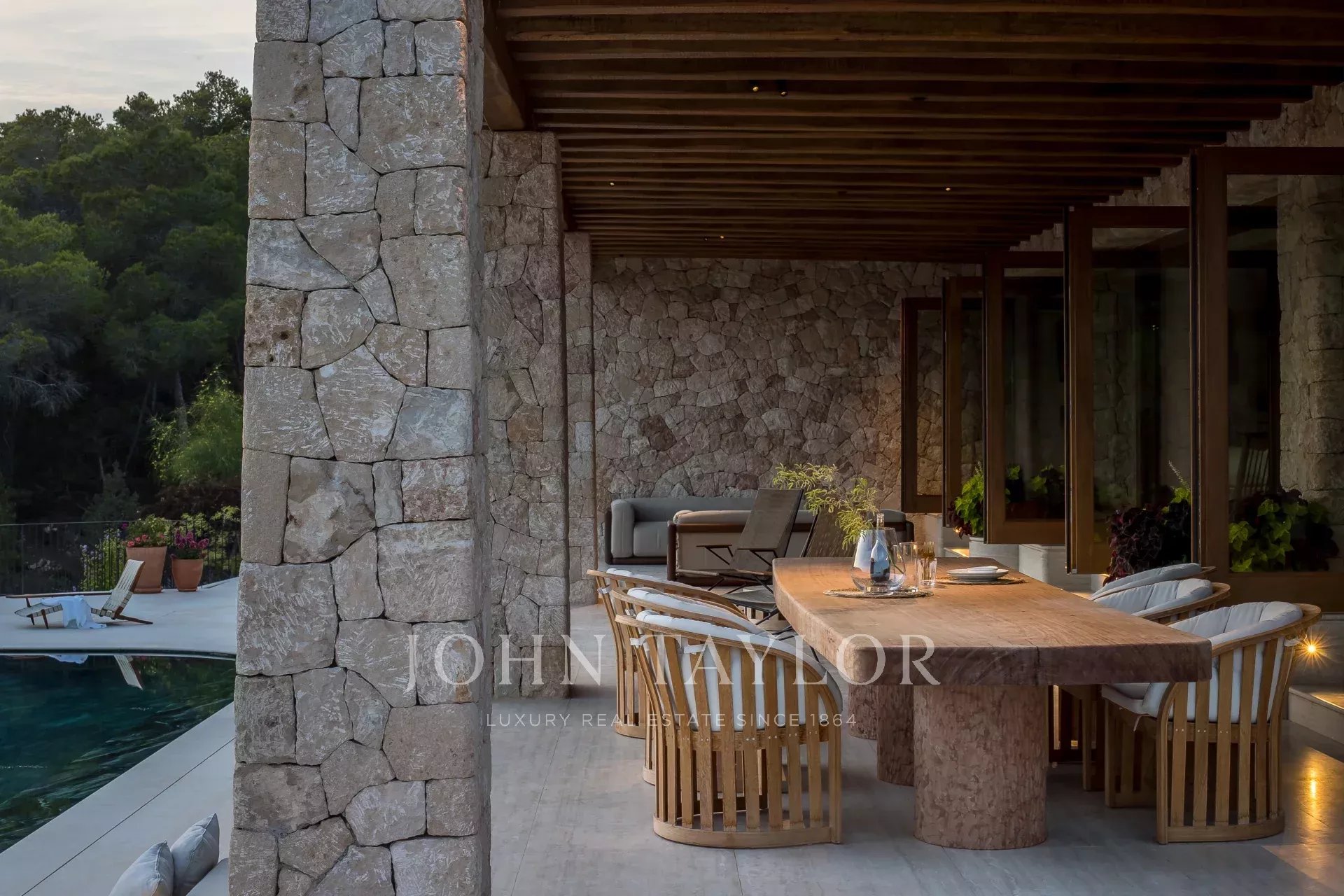 De grandes portes vitrées automatiques mènent à la terrasse, qui offre un vaste espace pour un coin détente ainsi qu’un espace repas en plein air. Les marches reliant la terrasse à la piscine sont soigneusement conçues pour offrir un autre lieu où s’asseoir ou s’allonger et profiter du soleil d’Ibiza, à côté de la magnifique piscine chauffée en marbre Lapponia Verde. Un système audio complet offre une expérience musicale parfaite à l’intérieur comme à l’extérieur.