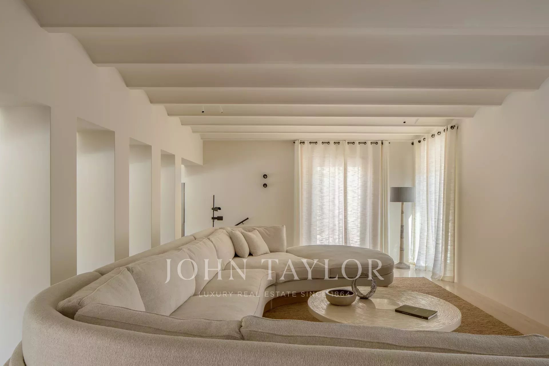 En franchissant la grande porte d’entrée, on découvre le niveau principal lumineux de la maison, avec ses hauts plafonds voûtés qui rappellent les méthodes de construction traditionnelles et intègrent des puits de lumière discrets pour faire entrer la lumière méditerranéenne. On y trouve un vaste salon sur deux niveaux, ainsi qu’une cuisine ouverte sur mesure, réalisée avec des matériaux de la plus haute qualité, alliant élégamment travertin romain, chêne naturel et bronze canon.