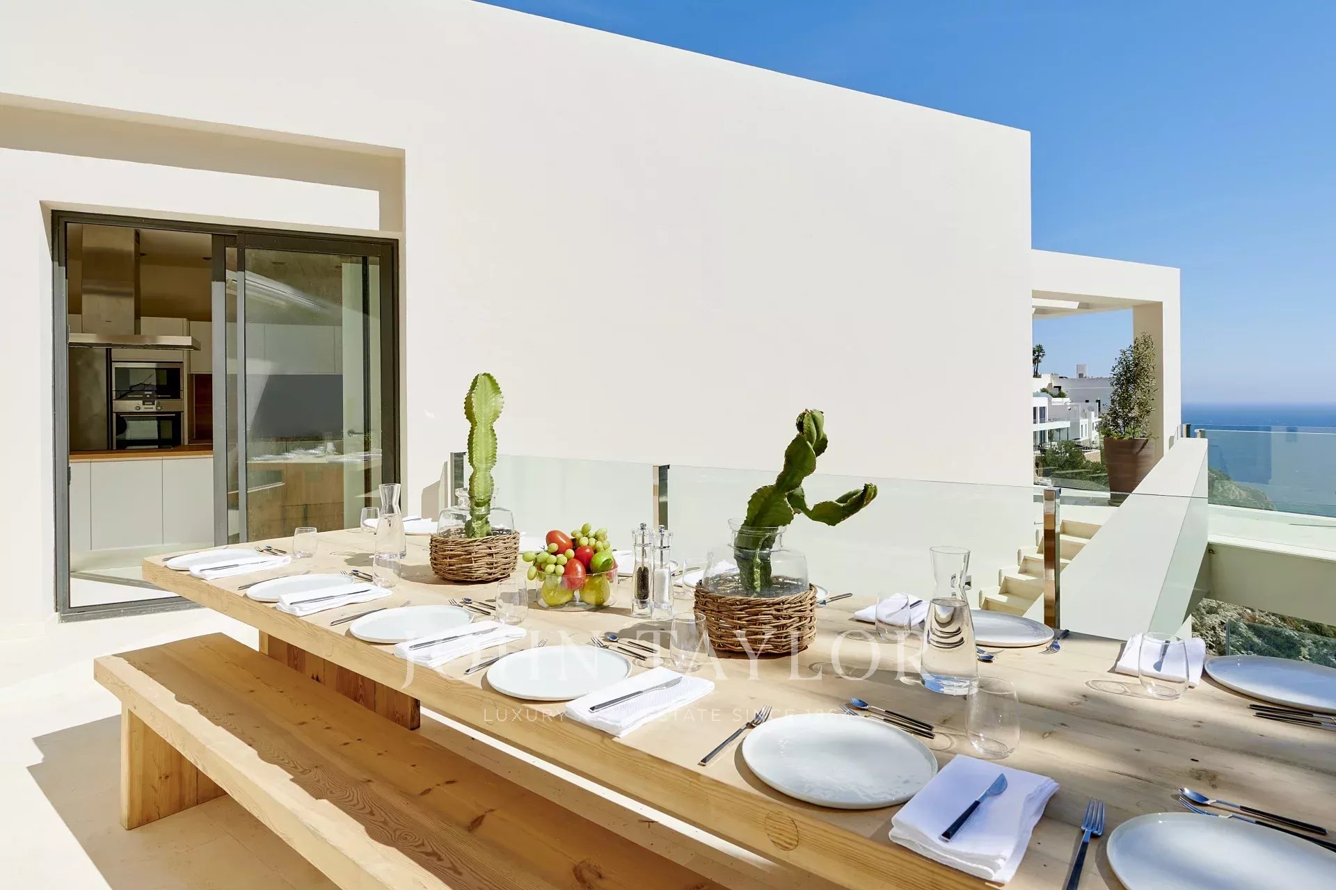 En montant au deuxième niveau, vous découvrirez la luxueuse suite principale, ainsi que deux autres chambres doubles, chacune avec sa propre salle de bain. Toutes les chambres offrent un accès à une grande terrasse, parfaite pour profiter de repas en plein air avec des amis et la famille, pouvant accueillir jusqu'à 16 convives.
