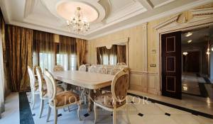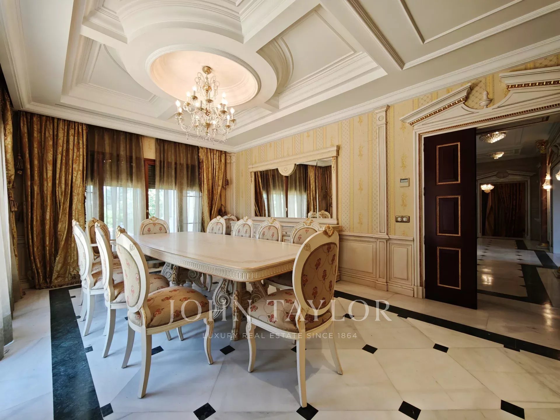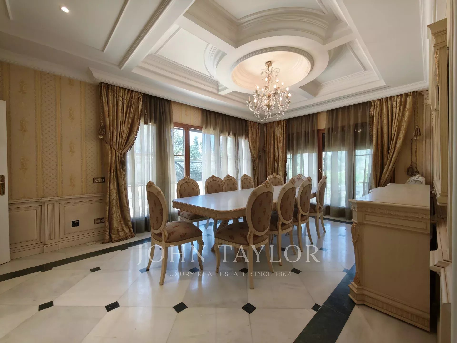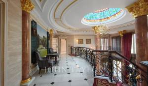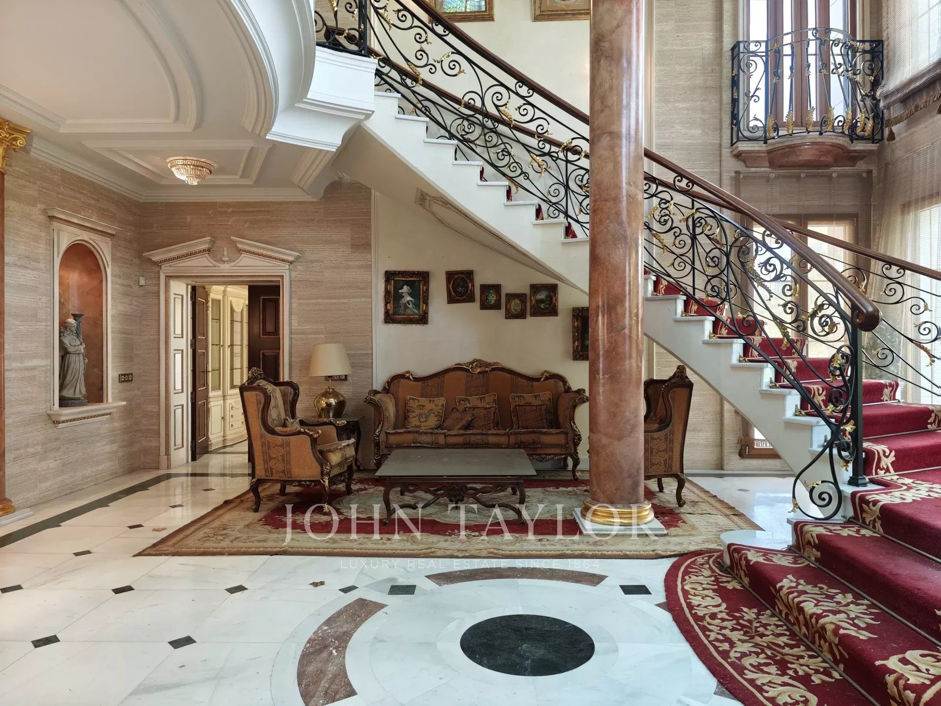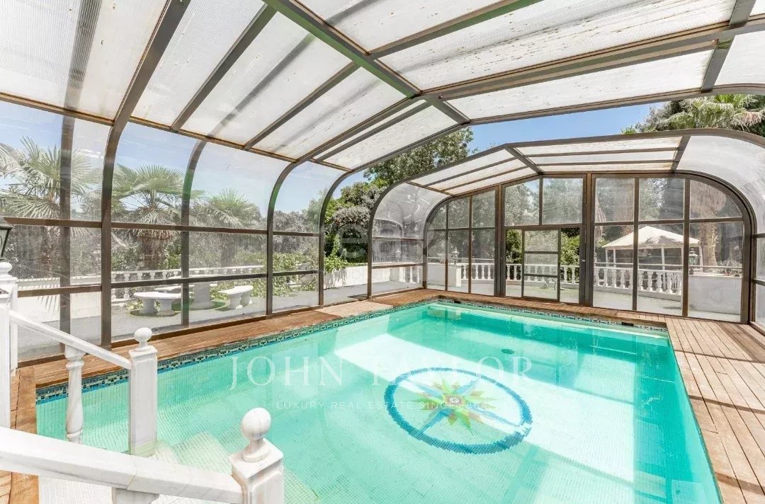 On entre dans un hall grandiose avec double escalier en marbre, le hall présente, le majestueux salon avec de très hauts plafonds, et avec sortie sur les porches et sur la piscine extérieure/couverte, sur le bureau, sur un salon et sur une salle à manger avec des fresques vénitiennes sur les murs. La cuisine à côté de la salle à manger avec des appareils haut de gamme intégrés et des toilettes pour les invités.