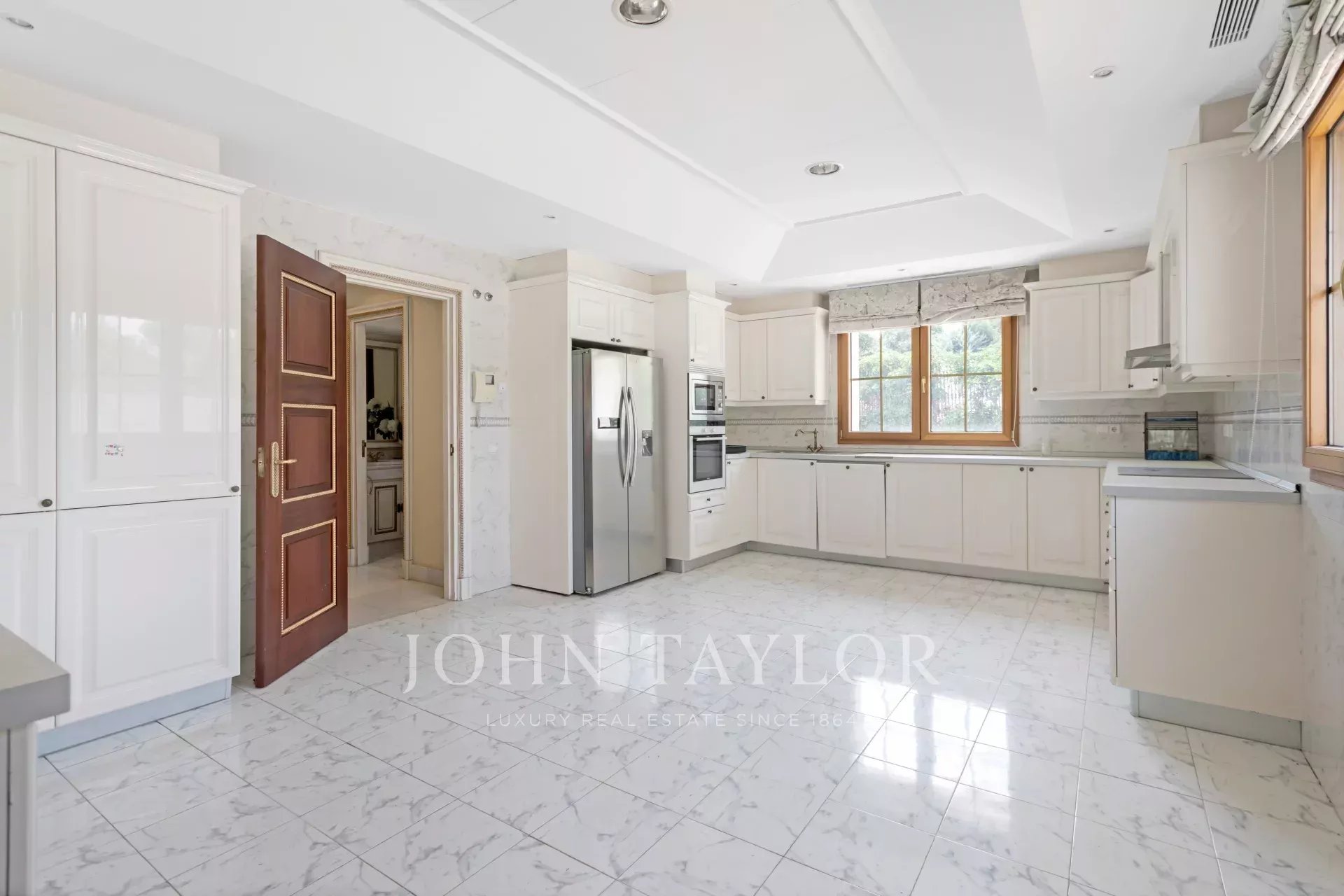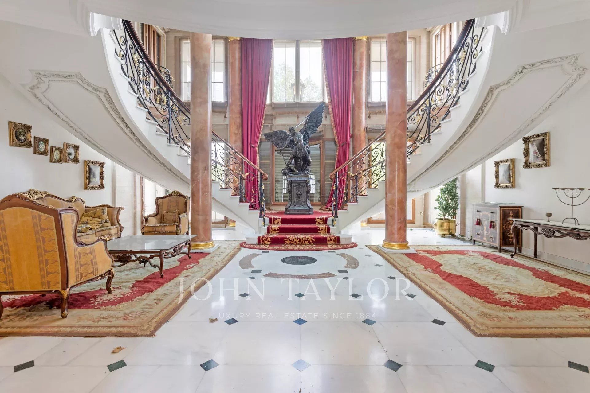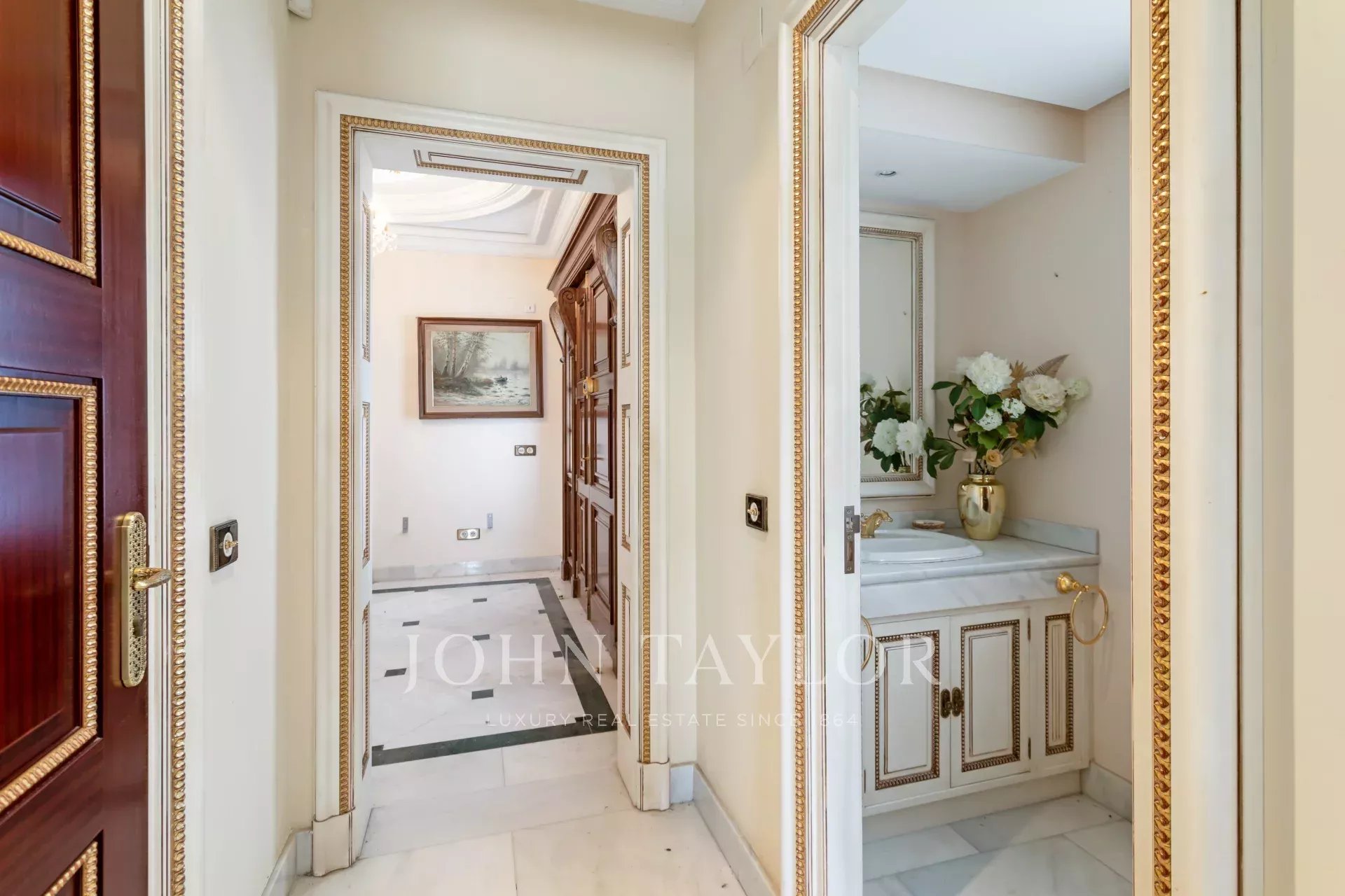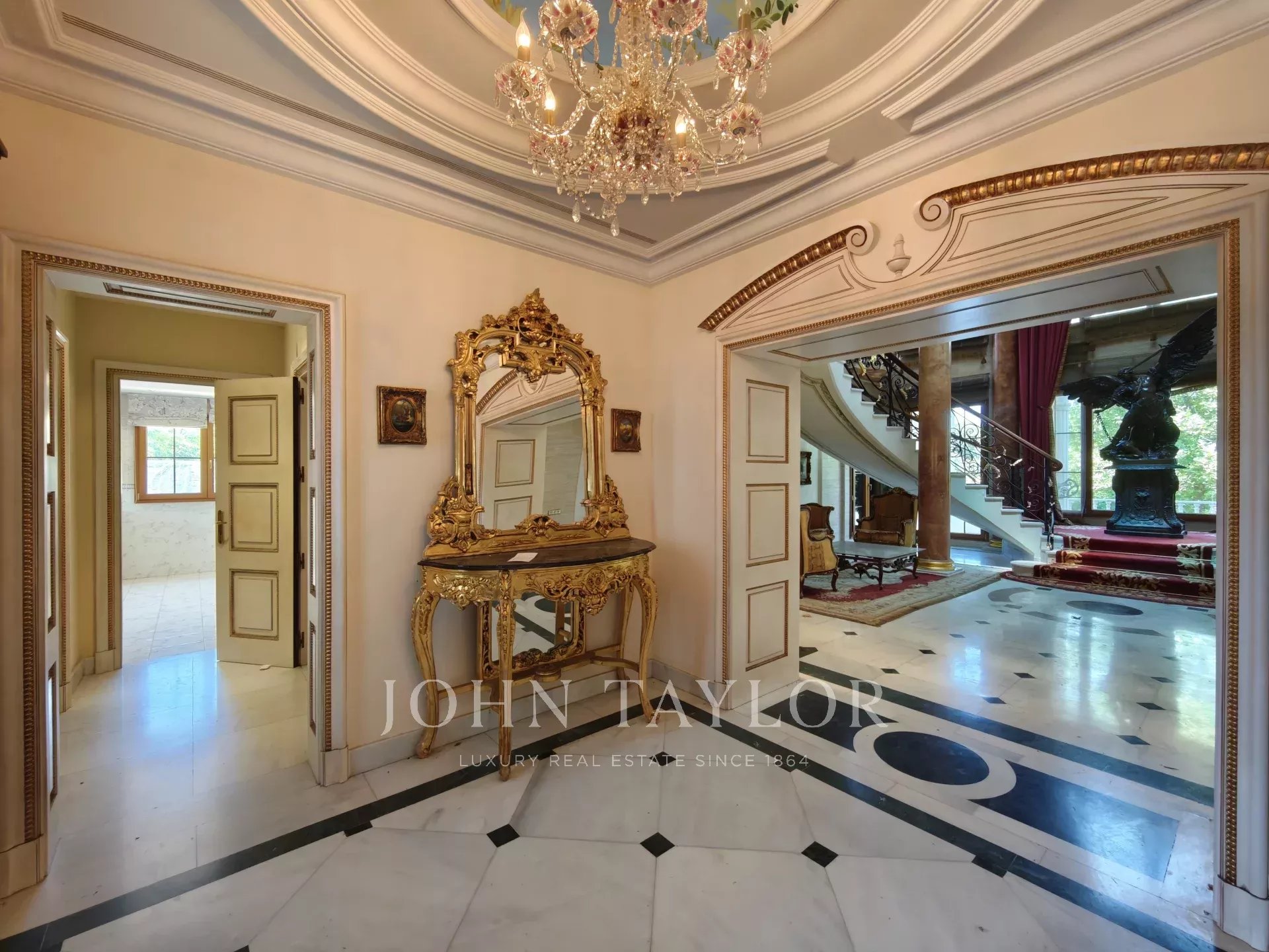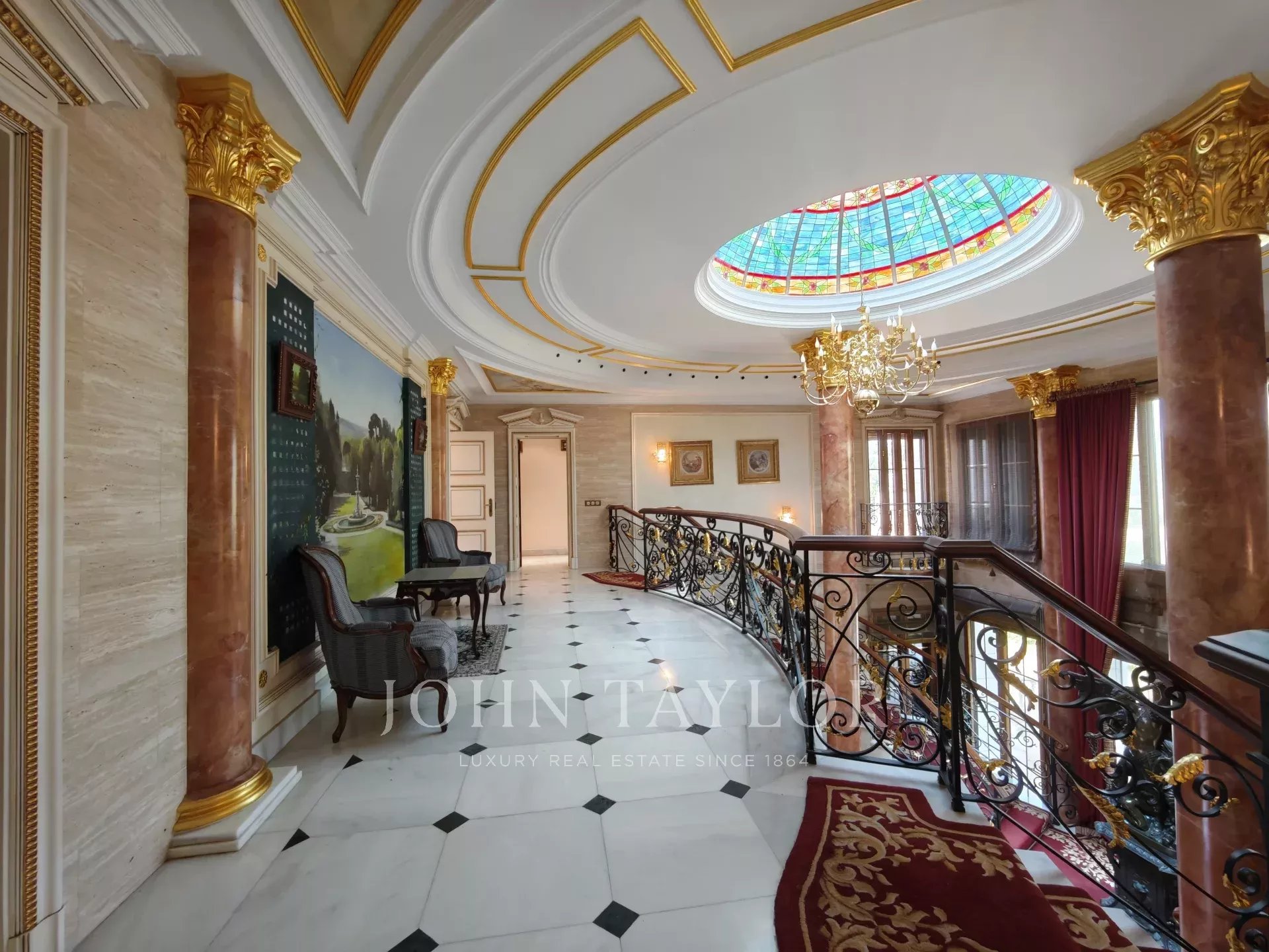On entre dans un hall grandiose avec double escalier en marbre, le hall présente, le majestueux salon avec de très hauts plafonds, et avec sortie sur les porches et sur la piscine extérieure/couverte, sur le bureau, sur un salon et sur une salle à manger avec des fresques vénitiennes sur les murs. La cuisine à côté de la salle à manger avec des appareils haut de gamme intégrés et des toilettes pour les invités.