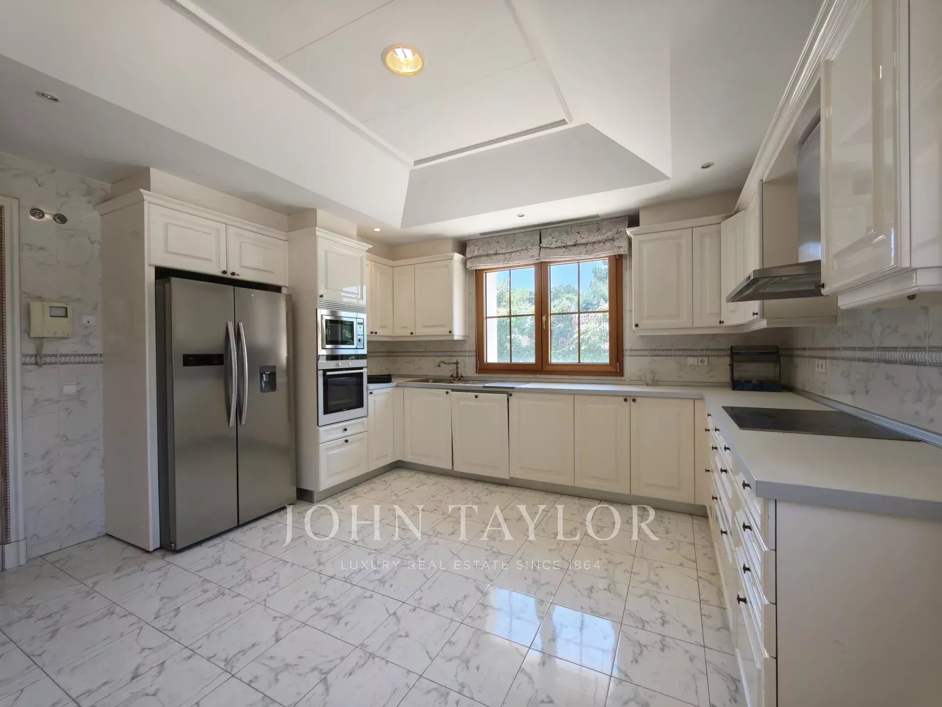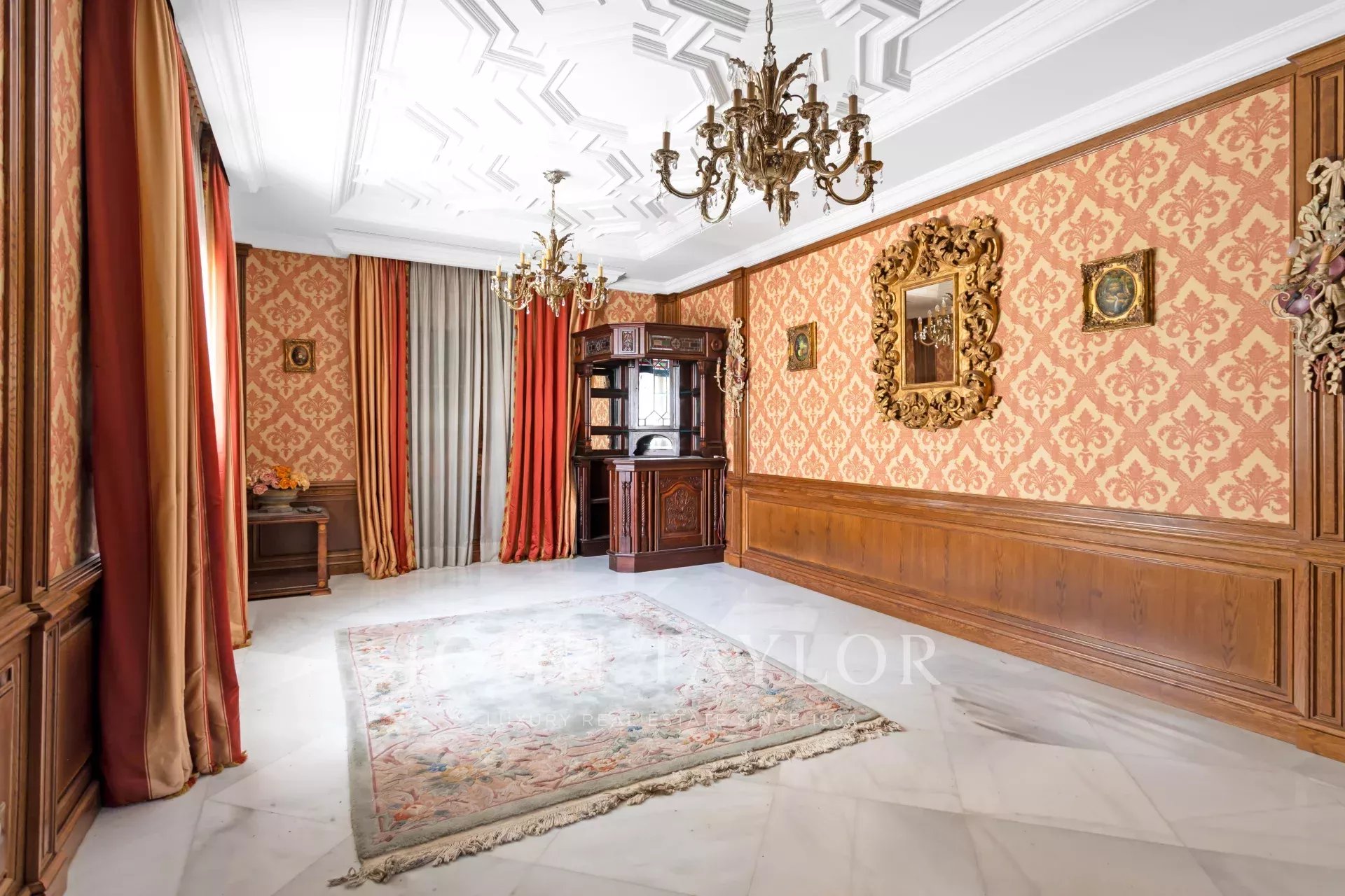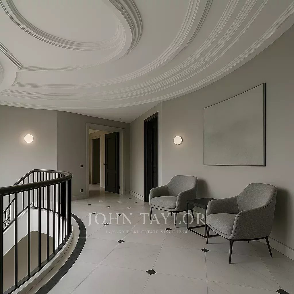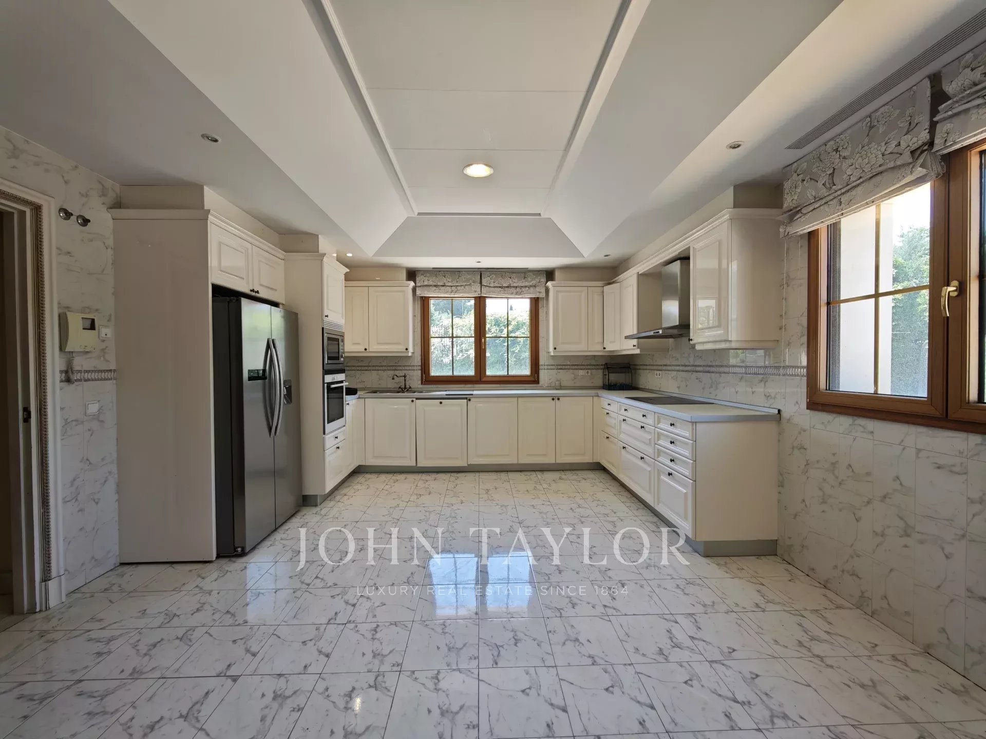 On entre dans un hall grandiose avec double escalier en marbre, le hall présente, le majestueux salon avec de très hauts plafonds, et avec sortie sur les porches et sur la piscine extérieure/couverte, sur le bureau, sur un salon et sur une salle à manger avec des fresques vénitiennes sur les murs. La cuisine à côté de la salle à manger avec des appareils haut de gamme intégrés et des toilettes pour les invités.