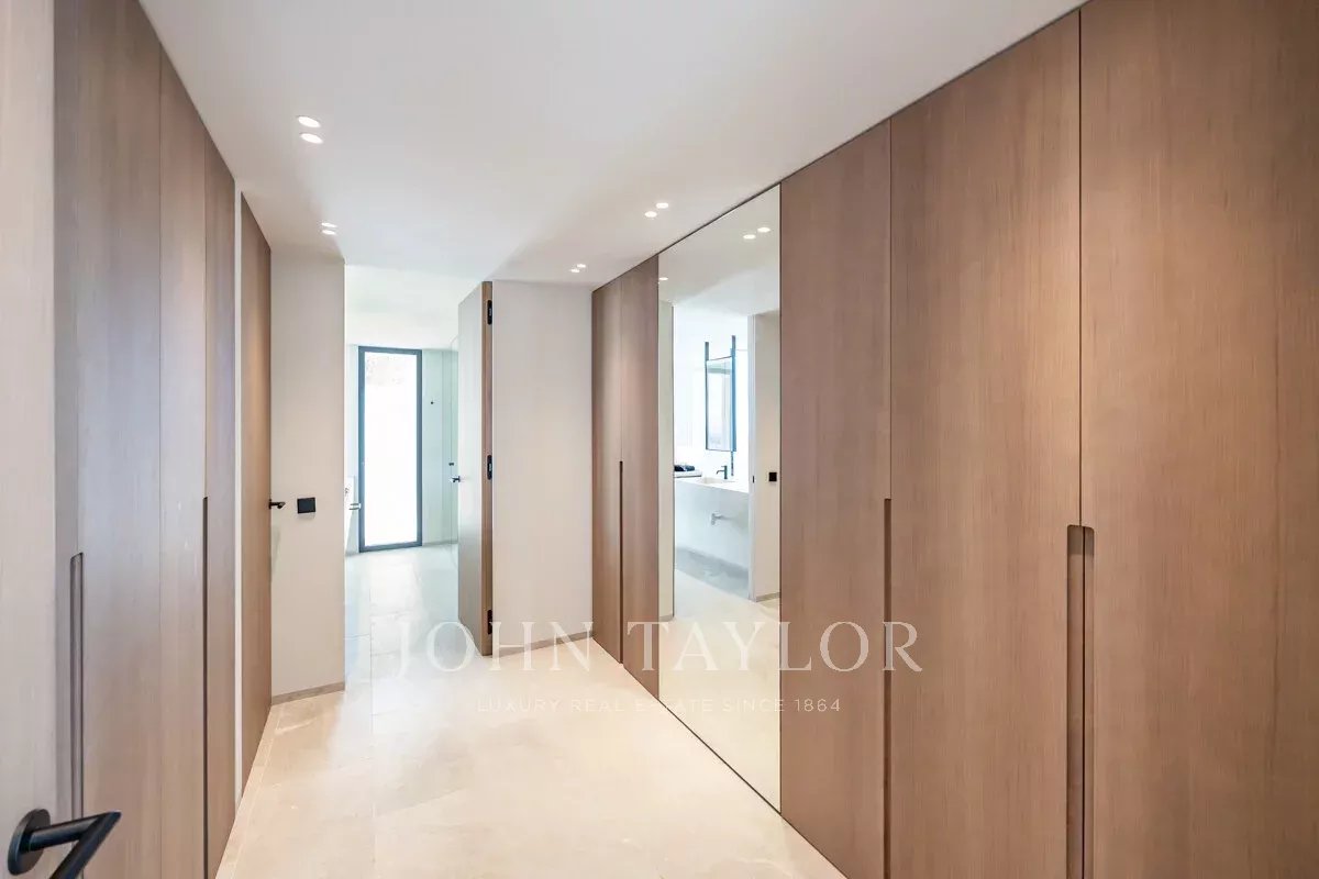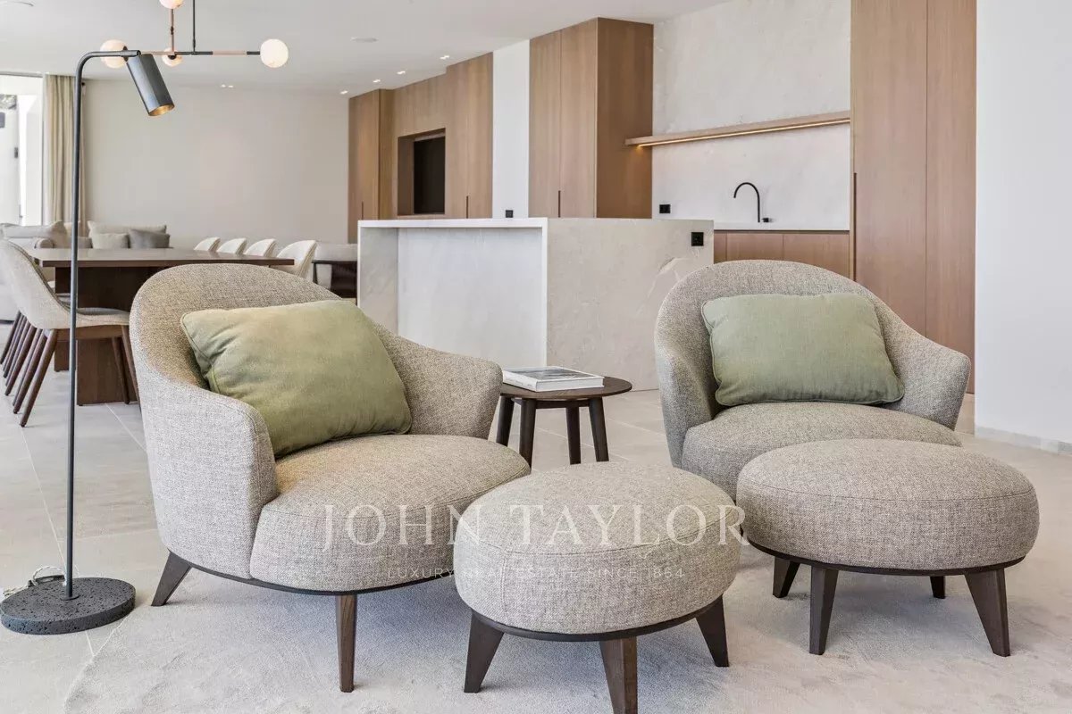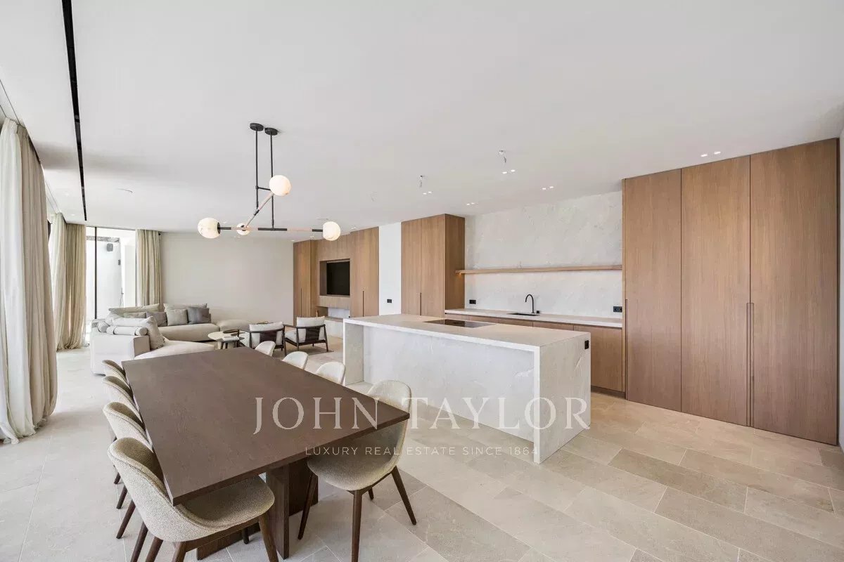 Chaque détail a été conçu selon les normes les plus élevées, avec des menuiseries en chêne fabriquées sur mesure - des portes intérieures discrètes aux armoires de cuisine sur mesure - créant une esthétique raffinée et fluide dans l'ensemble de la maison. Le rez-de-chaussée ouvert présente une cuisine, une salle à manger et un espace de vie élégants et contemporains, tous inondés de lumière naturelle et s'ouvrant directement sur le jardin paysager et la piscine privée.