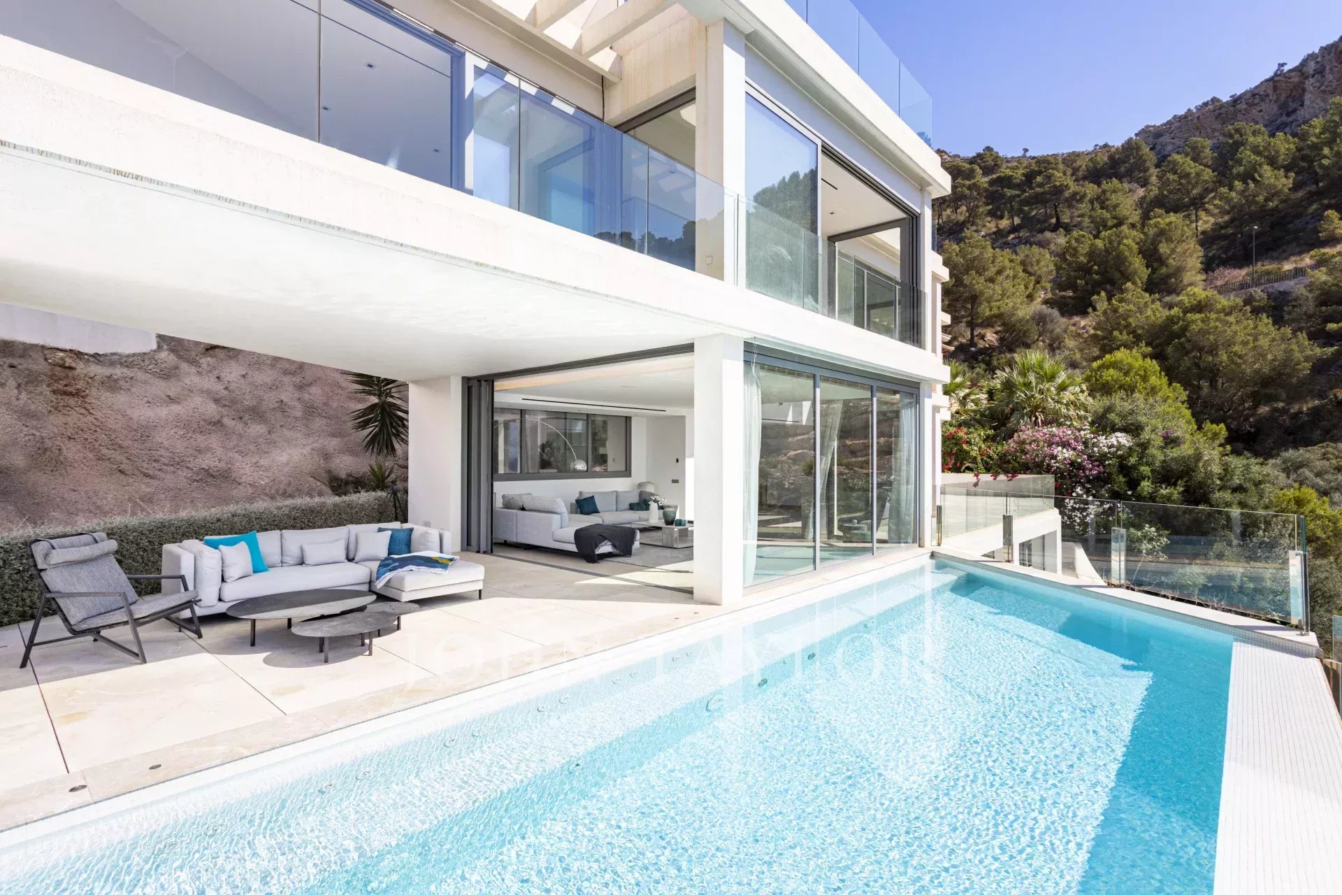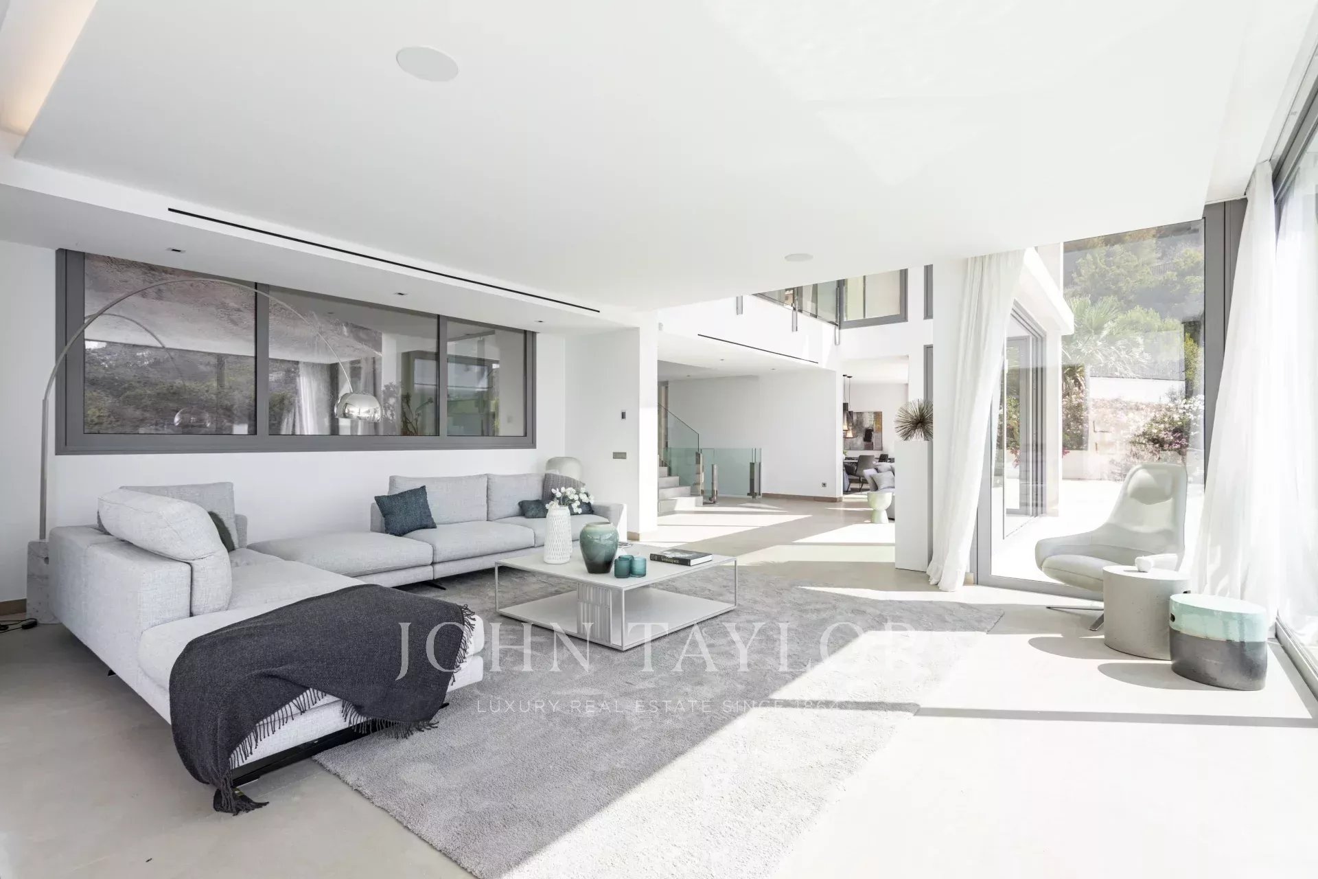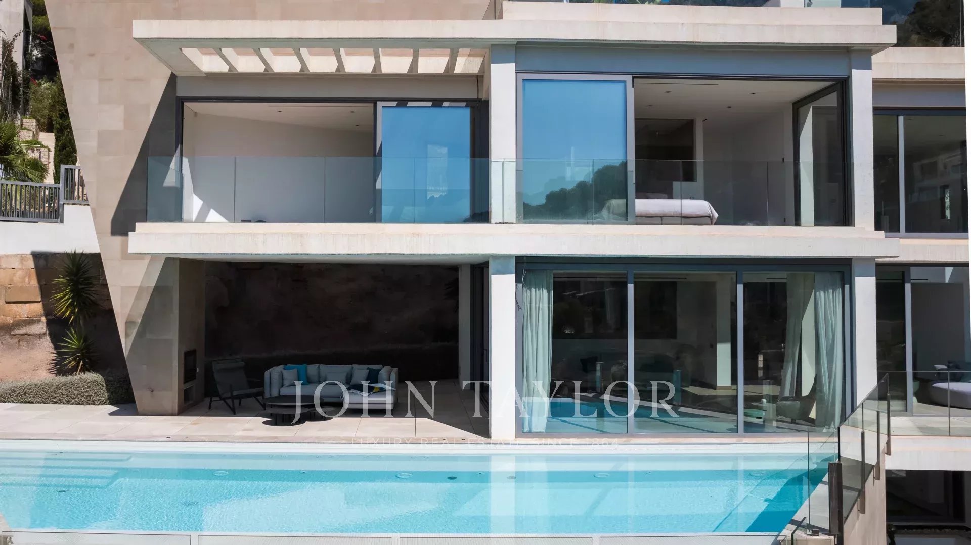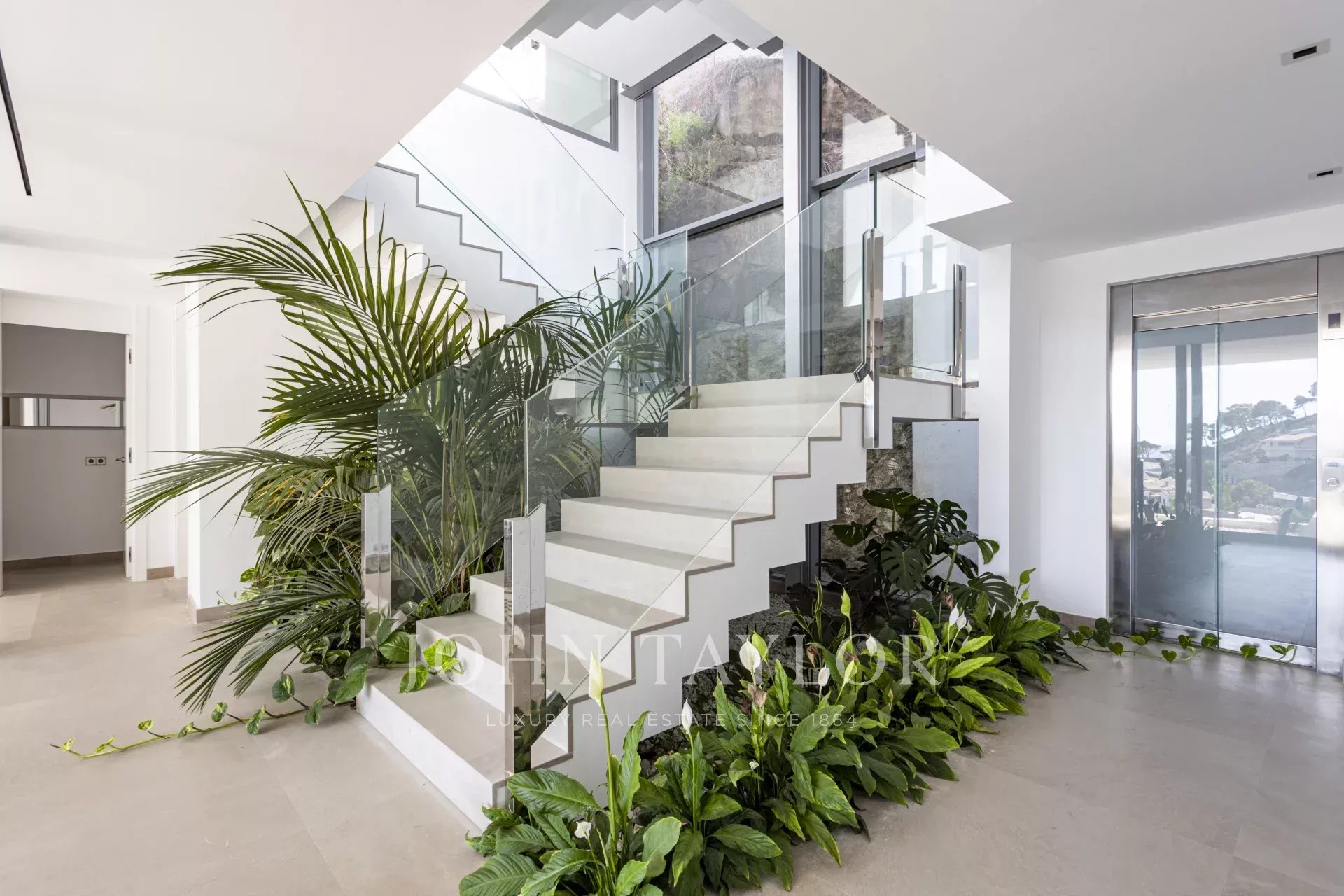 La propriété se distingue par sa conception architecturale imposante et sa façade en verre vers la mer, garantissant un maximum de lumière naturelle et de vues sur la mer dans chaque pièce. En entrant dans le garage privé, on accède aux étages inférieurs par l'ascenseur et l'escalier. Le deuxième niveau comprend trois chambres avec salles de bains attenantes. Le troisième niveau est entièrement dédié à la vie quotidienne. La cuisine entièrement équipée et la salle à manger mènent sans effort au salon et à l'accès direct au salon extérieur avec une cheminée confortable, à la terrasse et à l'espace piscine. Le niveau inférieur comprend l'espace home cinéma et la salle de sport privée. Construite en utilisant les meilleures qualités telles que la climatisation centrale, le chauffage par le sol, le système d'osmose et la domotique.
