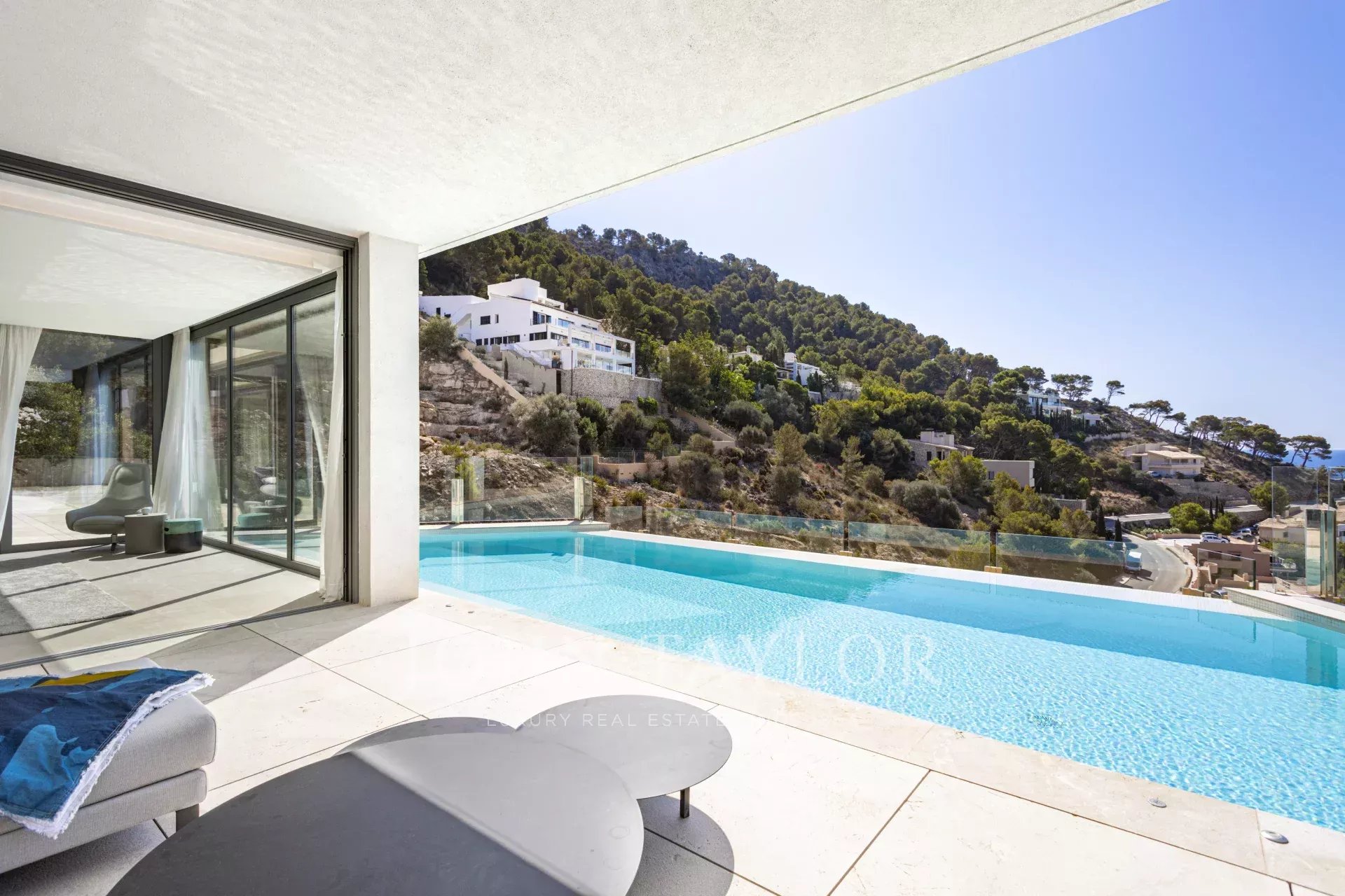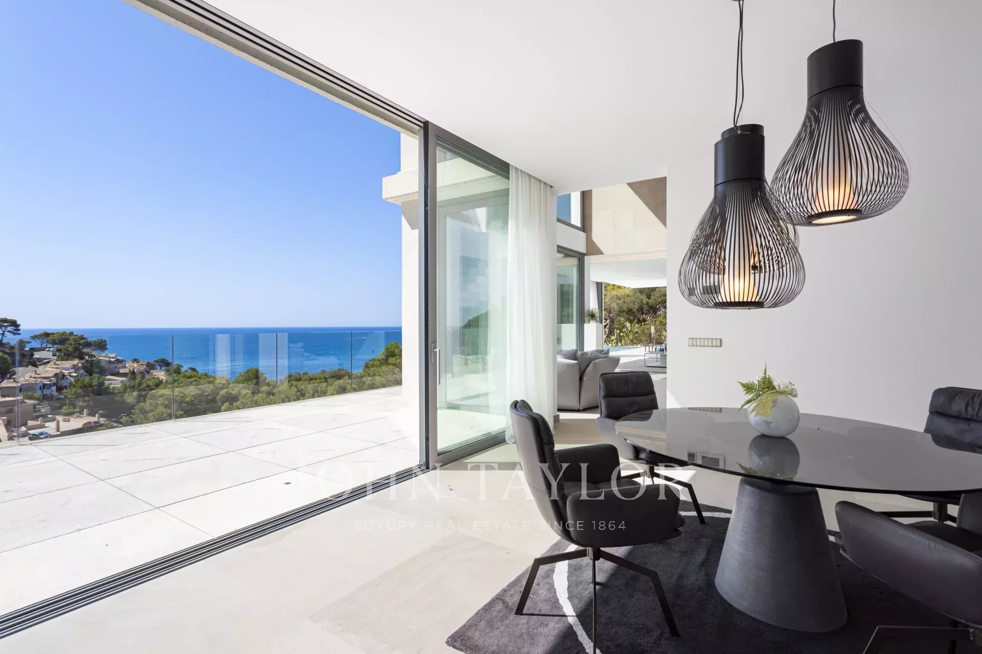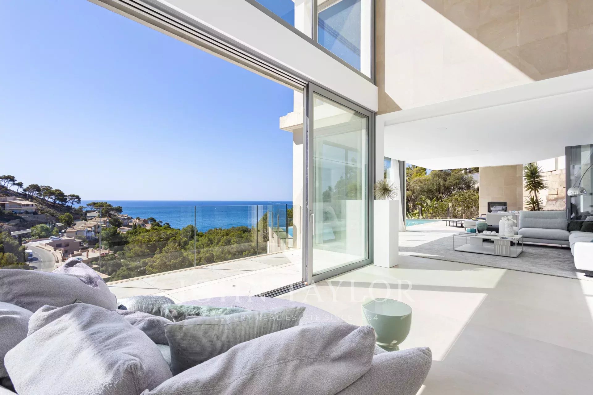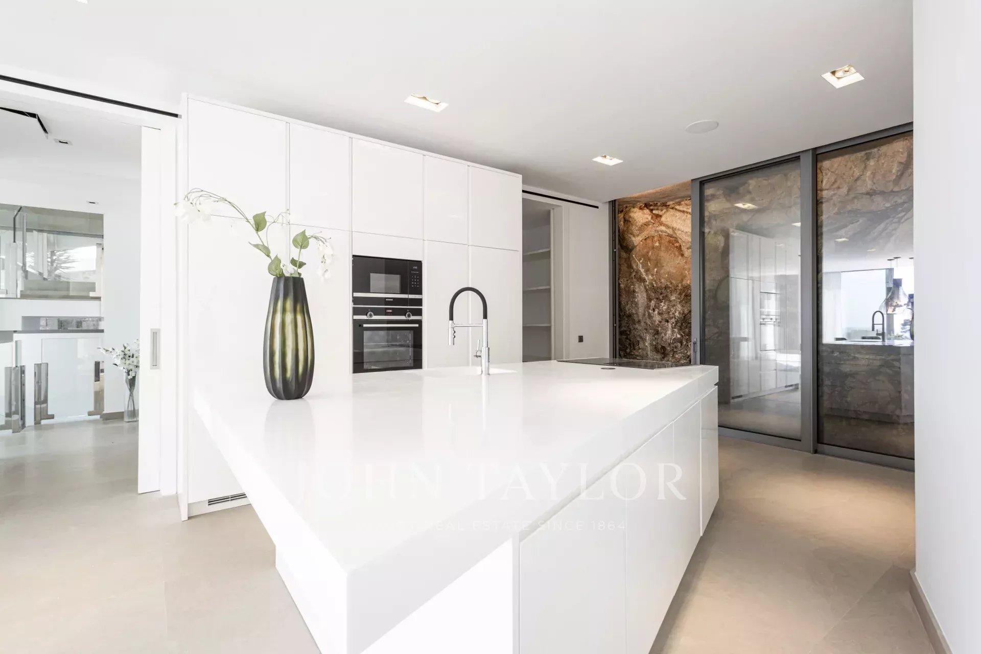 La propriété se distingue par sa conception architecturale imposante et sa façade en verre vers la mer, garantissant un maximum de lumière naturelle et de vues sur la mer dans chaque pièce. En entrant dans le garage privé, on accède aux étages inférieurs par l'ascenseur et l'escalier. Le deuxième niveau comprend trois chambres avec salles de bains attenantes. Le troisième niveau est entièrement dédié à la vie quotidienne. La cuisine entièrement équipée et la salle à manger mènent sans effort au salon et à l'accès direct au salon extérieur avec une cheminée confortable, à la terrasse et à l'espace piscine. Le niveau inférieur comprend l'espace home cinéma et la salle de sport privée. Construite en utilisant les meilleures qualités telles que la climatisation centrale, le chauffage par le sol, le système d'osmose et la domotique.