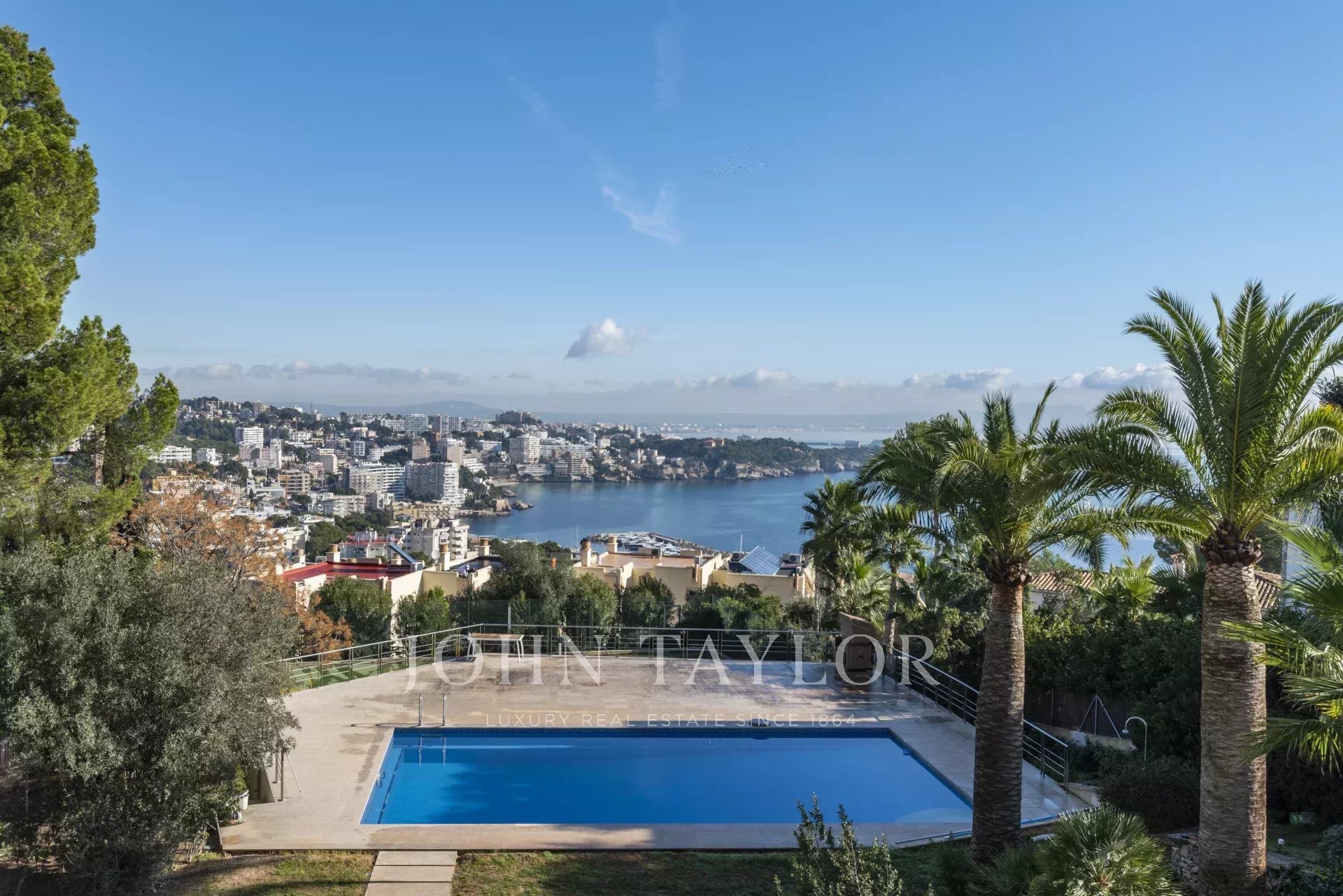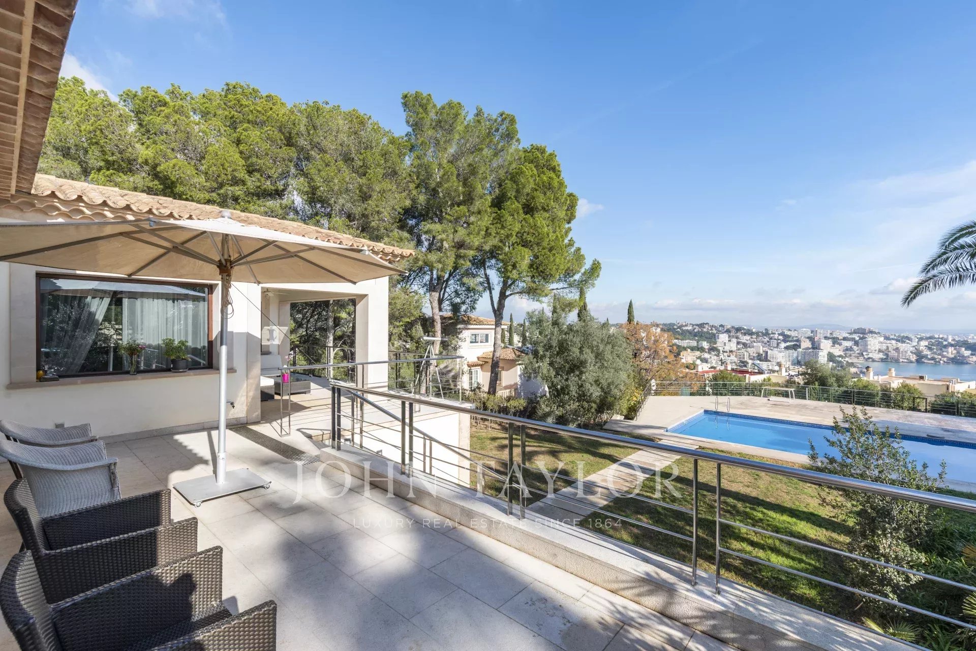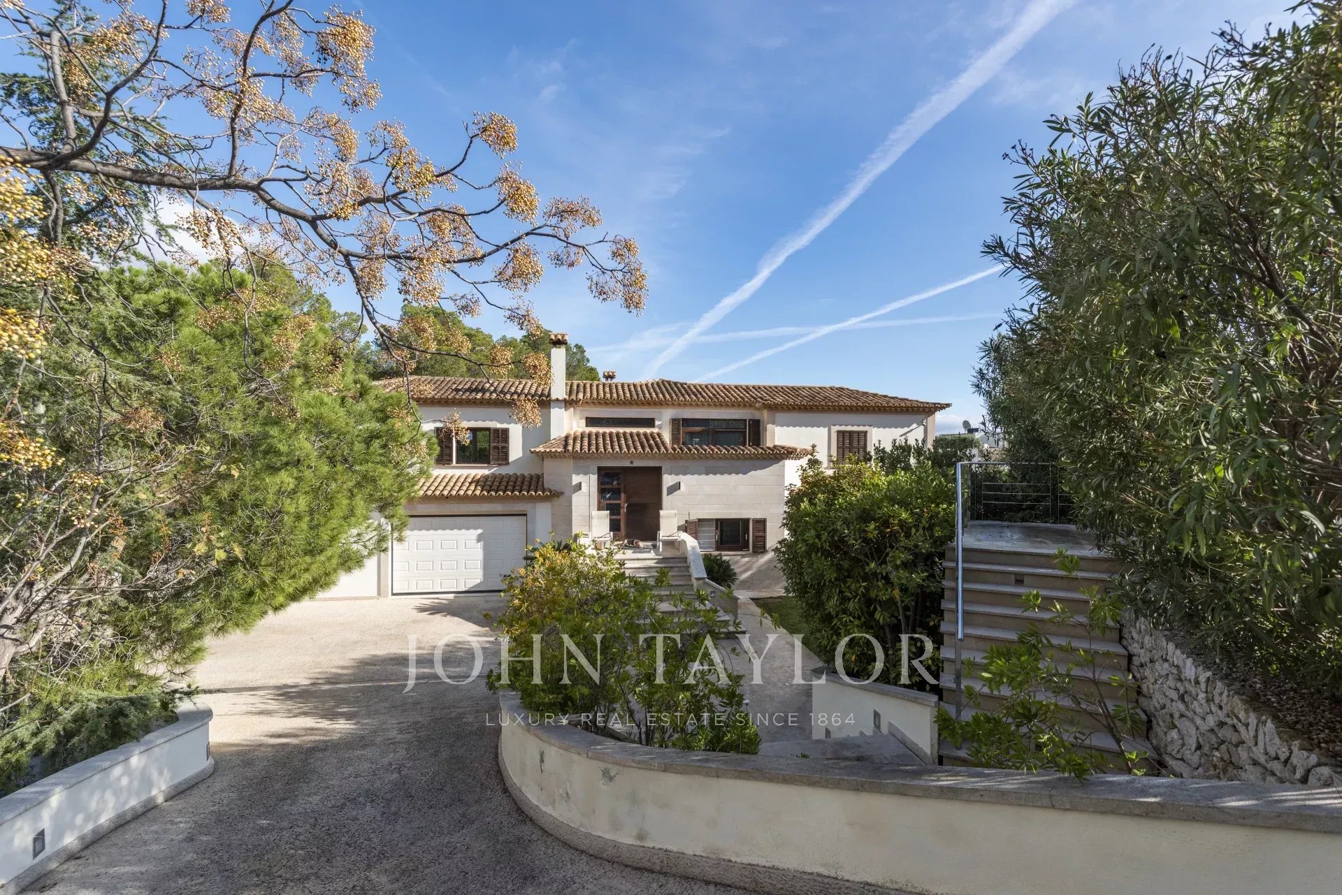 L'étage inférieur comprend un autre salon, une petite cuisine et deux chambres avec salle de bains en suite. L'espace spa et fitness se compose d'un sauna, d'un bain turc, d'une salle de bains et d'une salle de sport équipée de diverses machines. Cette zone est parfaitement reliée à la terrasse avec jacuzzi, d'où l'on peut accéder au grand jardin avec solarium, piscine et terrain multisports. Il y a également un appartement pour le personnel.