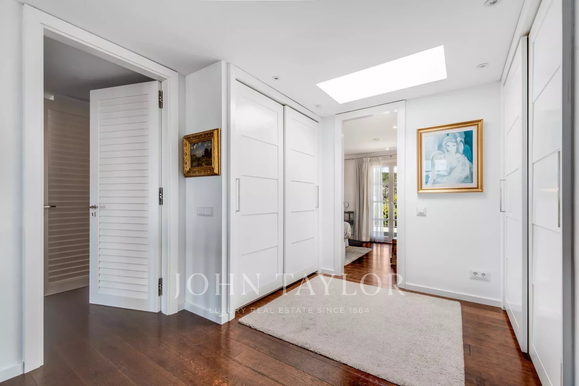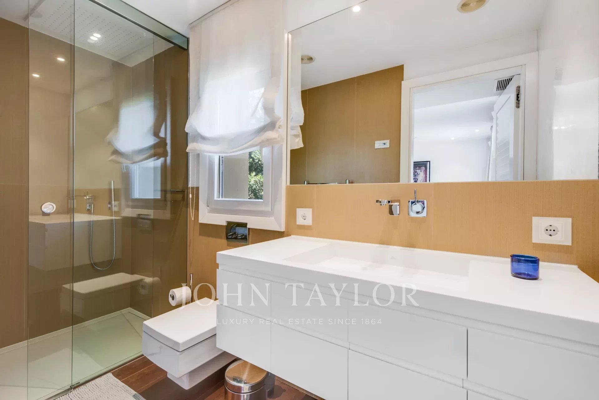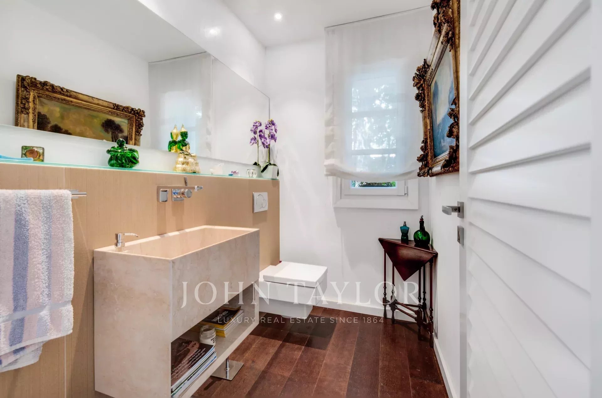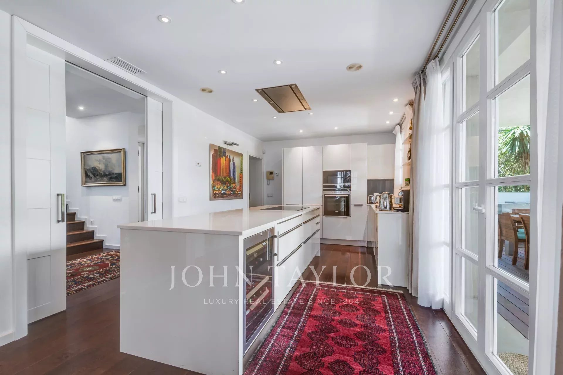 La cuisine de style moderne, élégante et sophistiquée, est équipée d'appareils de haute qualité et de pointe, tels qu'une plaque à induction et un four Siemens, ainsi qu'un réfrigérateur Gaggenau et un réfrigérateur à vin, vous permettant de cuisiner avec confort et professionnalisme. Au rez-de-chaussée, vous trouverez également une chambre avec une salle de bains privative et des toilettes pour les invités.