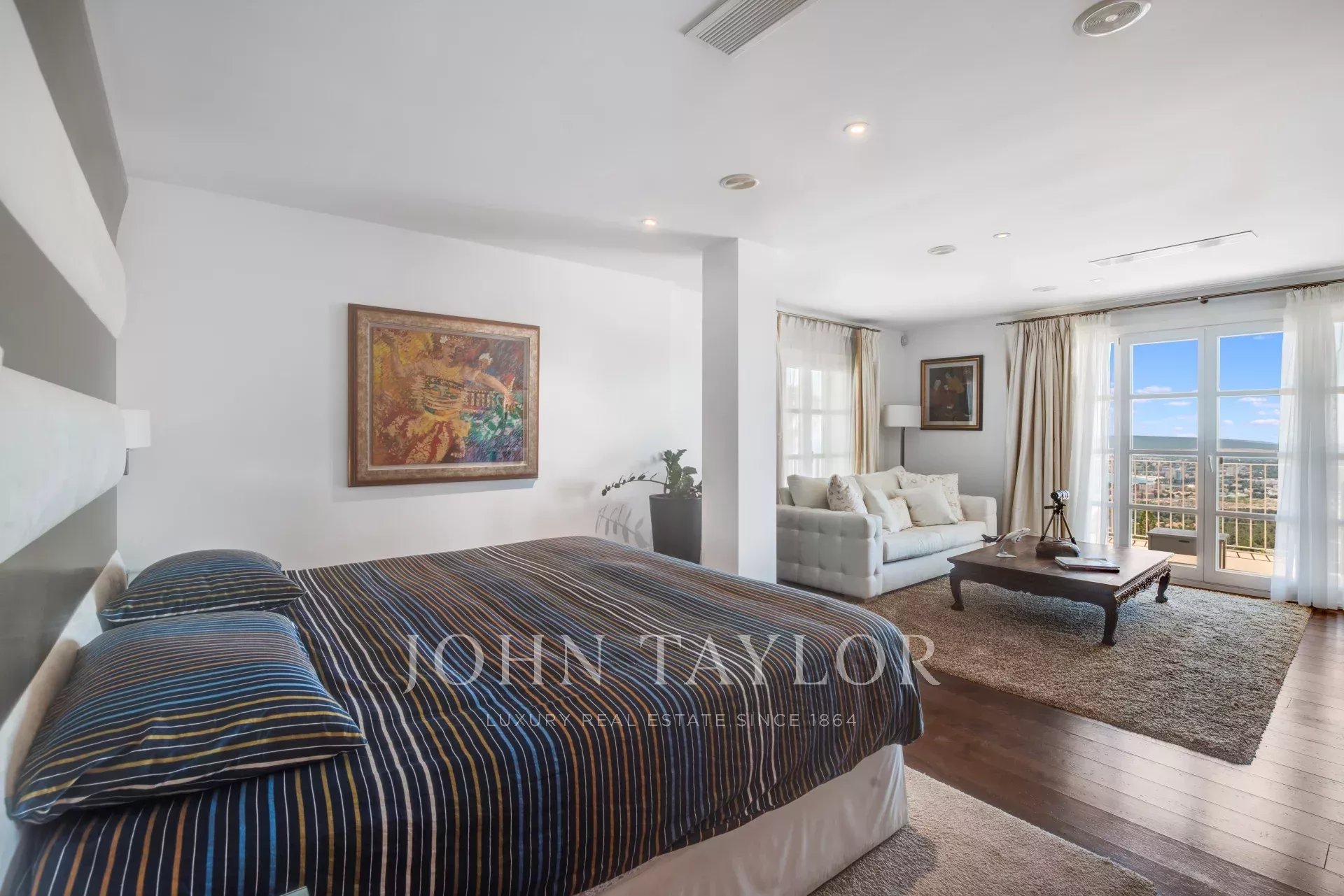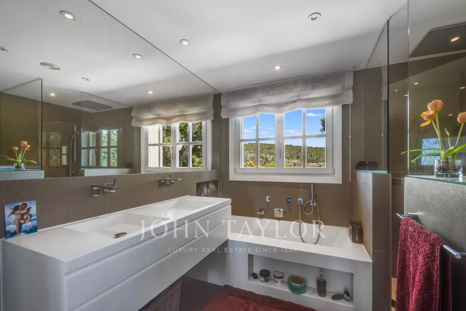 L'étage supérieur comprend la chambre principale avec une salle de bains en suite, un dressing et un balcon avec vue sur la mer, ainsi que deux autres chambres avec chacune une salle de bains en suite.