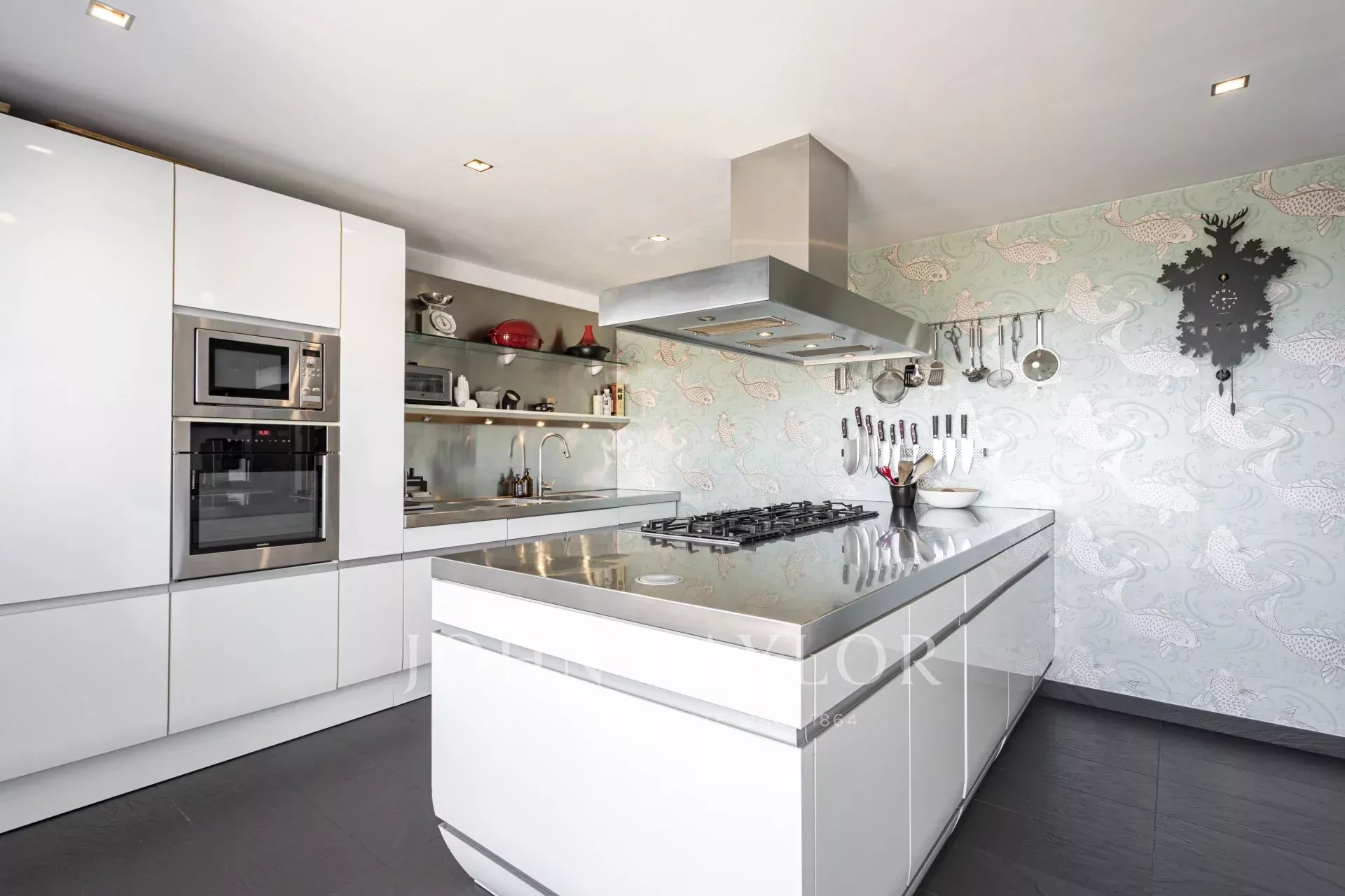 Le style de la maison mêle confort contemporain et détails de design raffinés, notamment les radiateurs muraux de conception belge, à la fois fonctionnels et esthétiques.