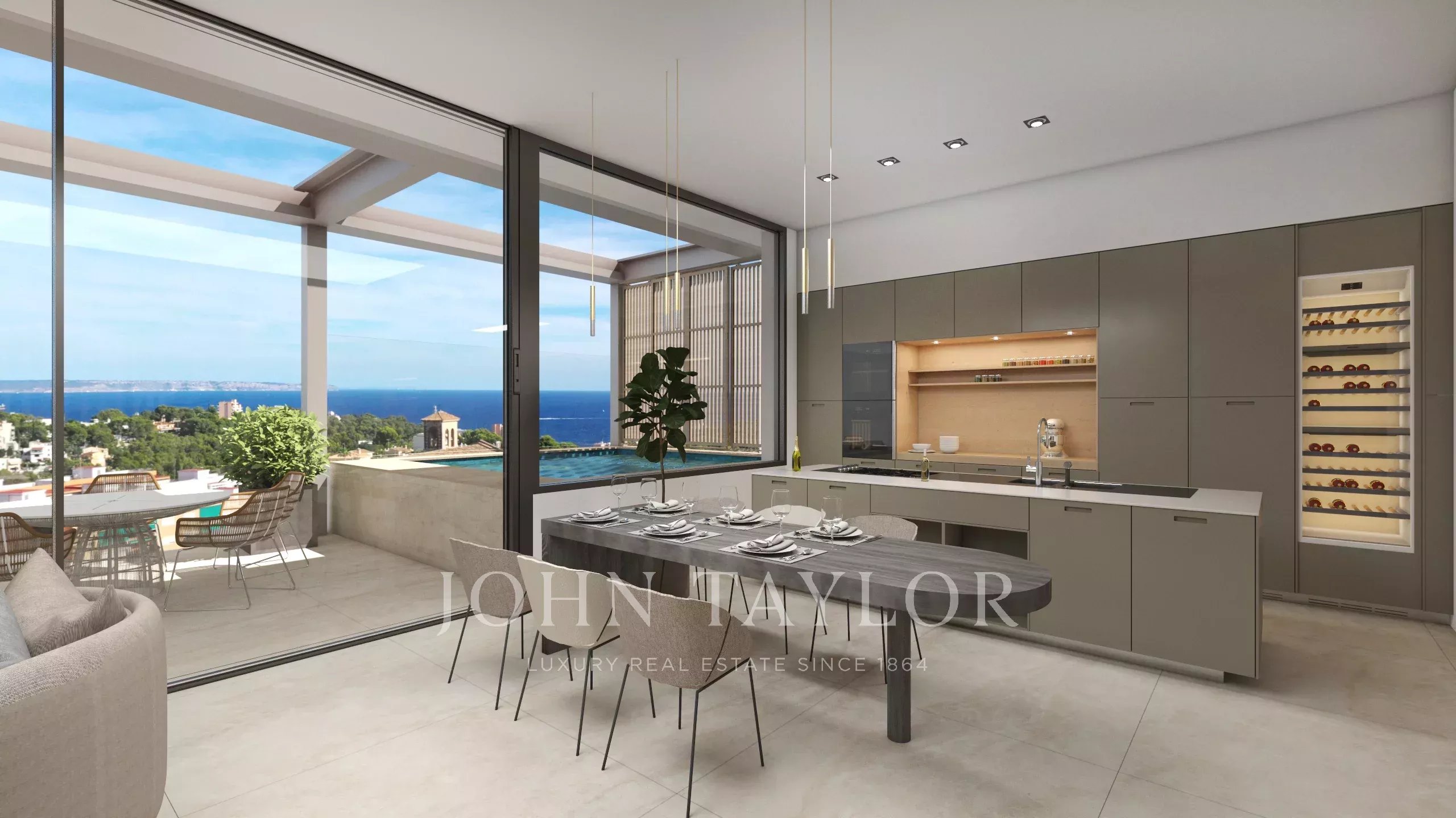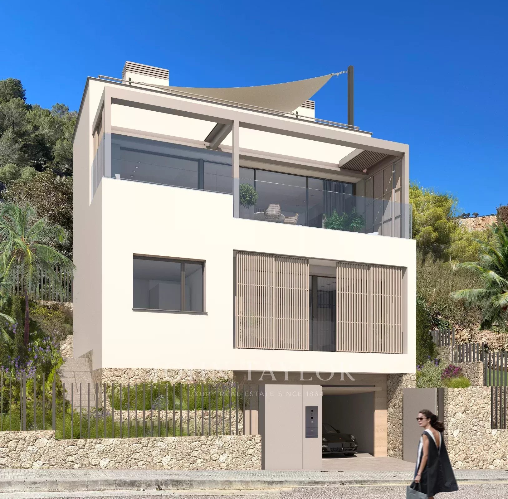 La villa offre environ 228 m² d'espace de vie bien conçu, relié par un escalier et un ascenseur privé pour un maximum de confort et d'accessibilité. L'étage principal constitue le cœur de la maison, avec un élégant salon et une salle à manger ouverts, ainsi qu'une cuisine design entièrement équipée. De grandes portes coulissantes en verre s'ouvrent sur la terrasse, où une piscine privée et un coin salon extérieur vous invitent à profiter du climat exceptionnel de Majorque tout au long de l'année, tandis que la position surélevée garantit une vue dégagée et l'intimité.