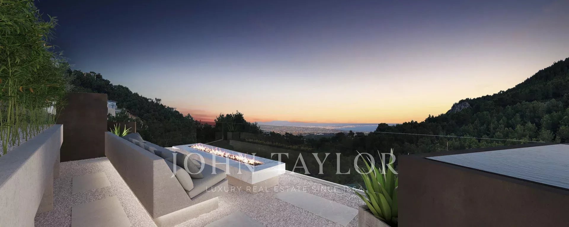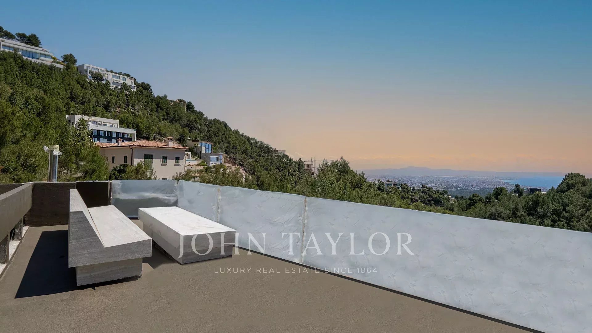 Villa tout juste achevée, d'une qualité et d'un style sans compromis. La conception et la construction révolutionnaires de la villa sont un véritable régal pour les yeux et un exemple pour les futures maisons. Un véritable précurseur ! Profitez d'une intimité totale dans cette propriété exceptionnelle. La porte d'entrée massive vous conduit du niveau de la rue à la zone de vie supérieure, où vous trouverez un salon de détente, un bar et la fantastique piscine à débordement, en partie vitrée. Ici, vous profitez d'une vue à couper le souffle sur la baie de Palma. Cette vue n'est surpassée que par la terrasse sur le toit, à laquelle on accède par un escalier extérieur. La maison est également équipée d'un ascenseur. Sous le niveau de la piscine se trouve l'espace social principal : une cuisine/salle à manger et un salon spacieux et ouvert, avec une transition transparente vers la terrasse généreuse et partiellement couverte. Le niveau inférieur comprend quatre chambres et deux salles de bains partagées en suite par deux chambres chacune. Une grande cave à vin se trouve également à cet endroit. La suite parentale occupe tout le rez-de-chaussée avec un dressing surdimensionné, une salle de bains ouverte, un sauna et un accès direct au jardin où un jacuzzi vous attend. Une piscine intérieure chauffée avec spa et salle de sport se trouve au niveau le plus bas. De nombreuses caractéristiques techniques, telles que le système de circulation de l'air, sont basées sur une conception de l'industrie aéronautique (le promoteur est issu de ce secteur) et les autres caractéristiques sont également extrêmement orientées vers l'avenir et à la pointe de la technologie. Résultat : des économies d'énergie et un confort tout simplement unique.