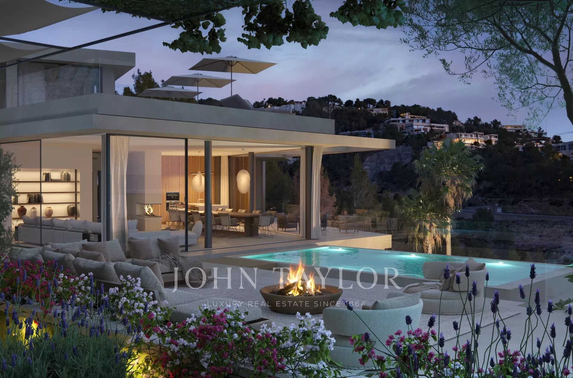 Cette offre comprend un terrain et un projet avec un permis pour une luxueuse villa avec vue sur la mer sur un terrain de 2225m2 avec une surface construite totale de 630m² sur trois étages. Elle n'inclut pas la construction de la villa. Le premier étage se compose d'un salon/salle à manger très spacieux et baigné de lumière, d'une cuisine ouverte, d'une chambre avec salle de bain attenante, d'un dressing, de toilettes pour invités et d'un débarras. L'espace extérieur offre quatre terrasses avec des orientations différentes. Un étage plus bas, le projet propose un total de trois chambres avec trois salles de bains en-suite, un espace bureau avec une quatrième salle de bains, une buanderie et un éventuel sauna. Vous avez accès à deux terrasses et à un patio supplémentaire. Au niveau inférieur, on trouve une grande pièce destinée à un centre de fitness et de bien-être, une salle de bains, des toilettes séparées et le local technique. De la piscine et des différentes terrasses, vous avez une vue fantastique sur Palma et la mer.