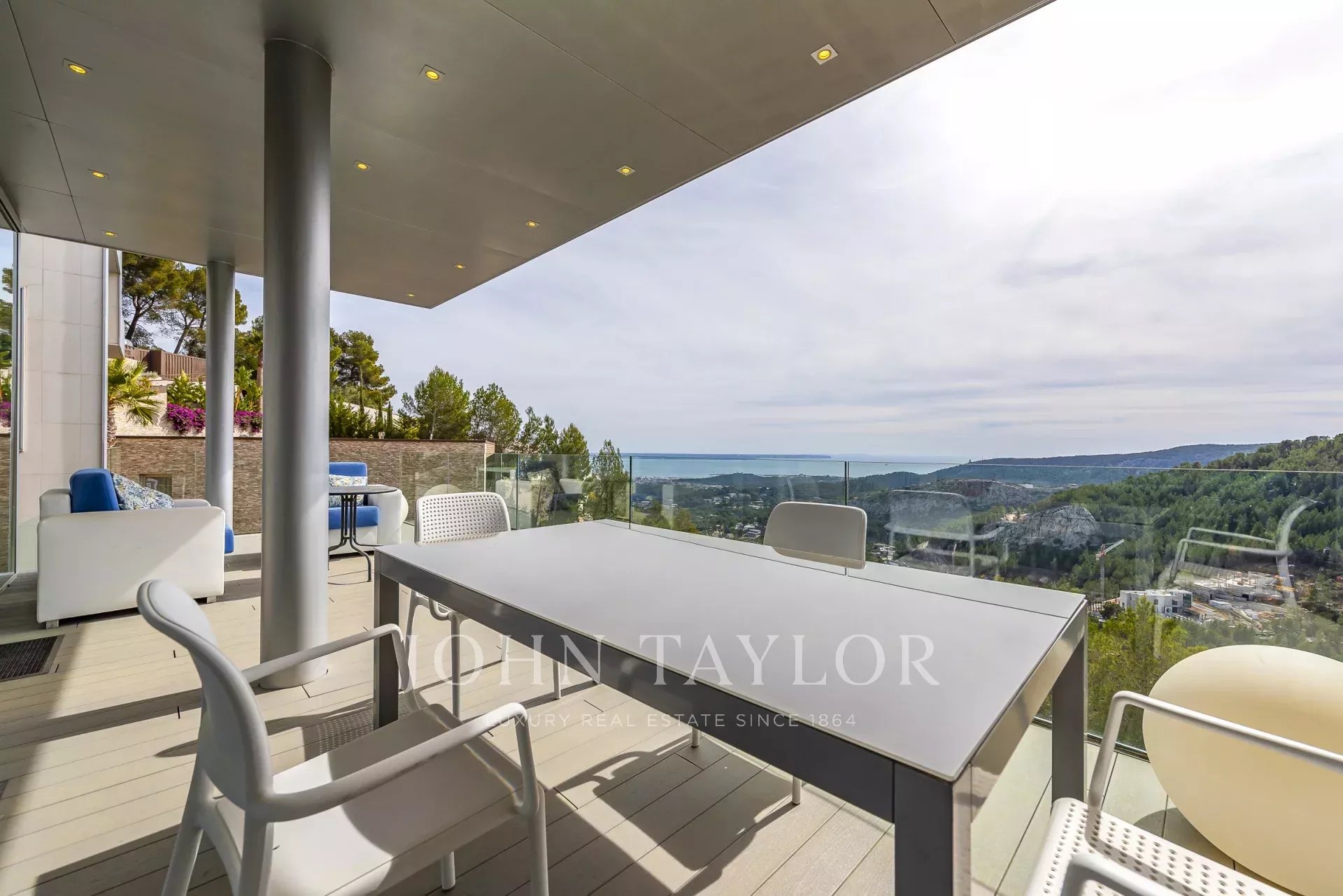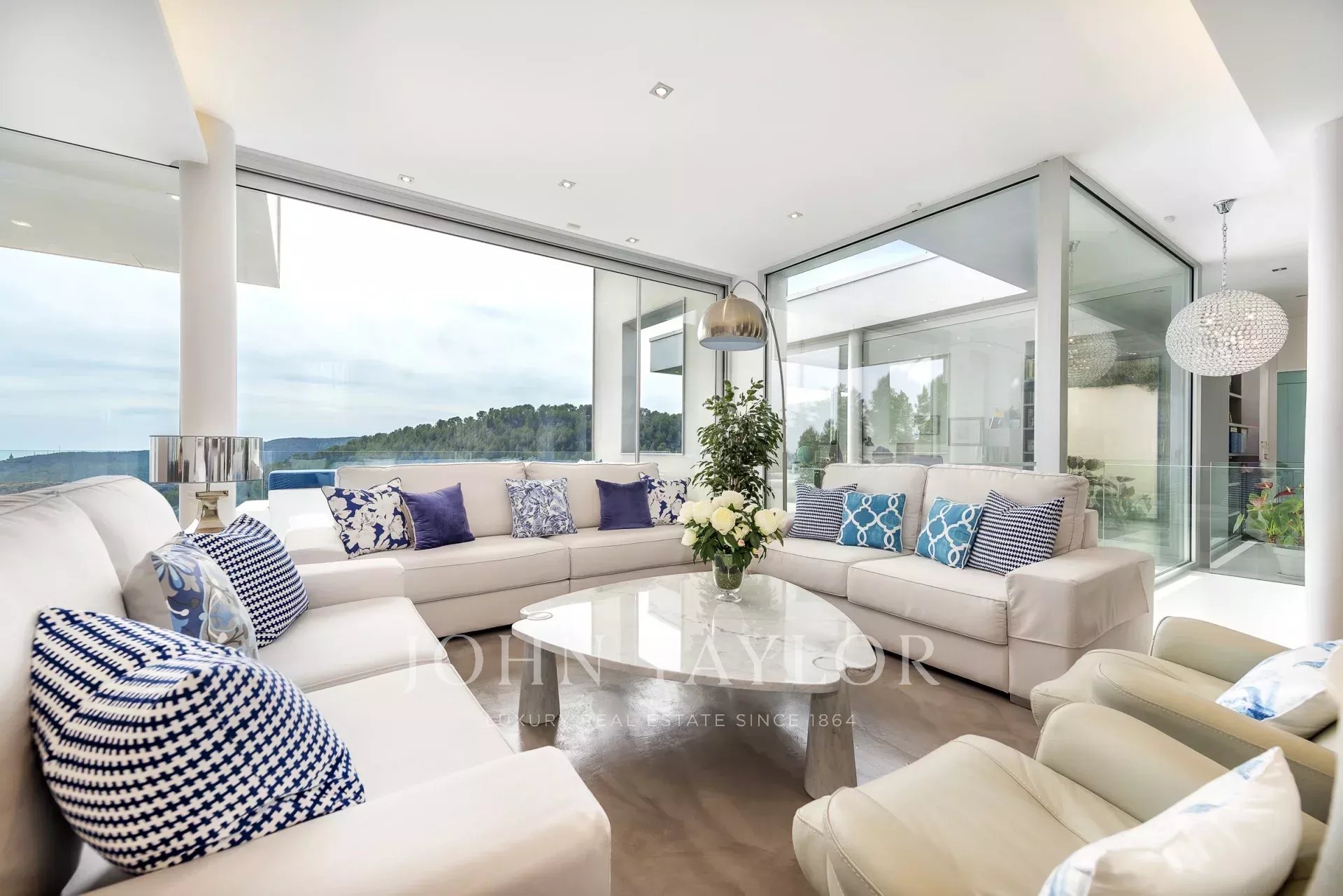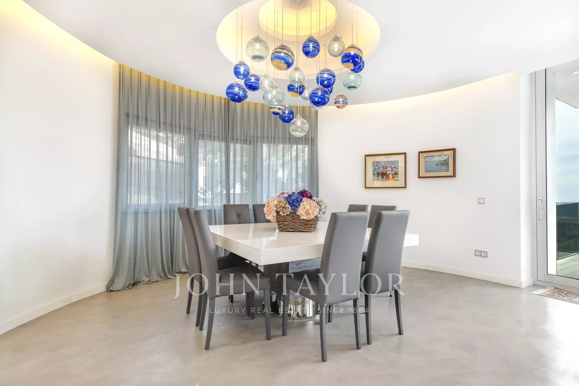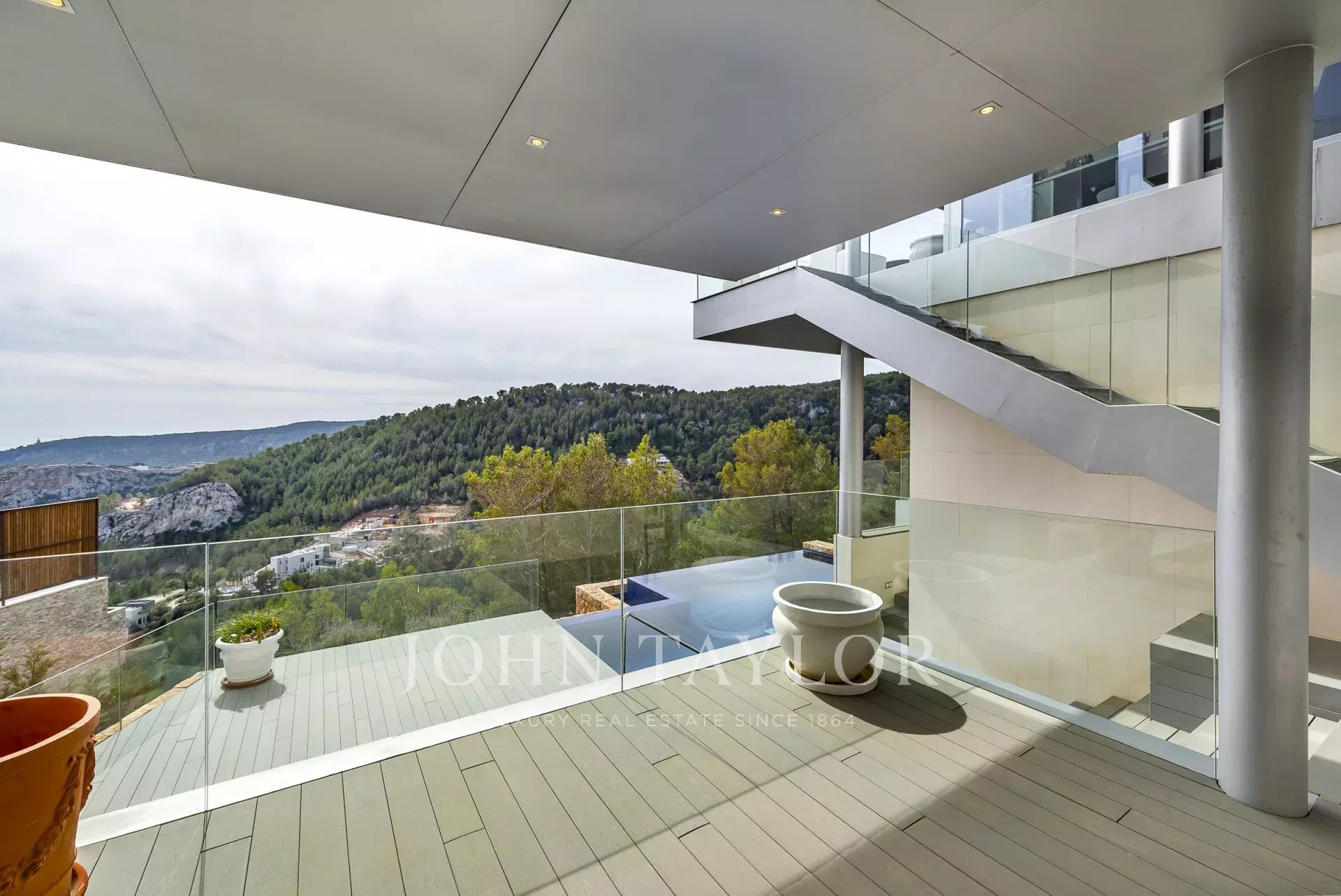 Cette superbe propriété, située dans une rue calme se terminant en cul de sac, offre une expérience de vie unique. Avec des vues panoramiques sur la mer et les montagnes, chaque coin de cette villa a été conçu pour apporter tranquillité et beauté. La villa dispose de 5 chambres et de 5 salles de bains, offrant un espace ample et confortable pour la vie de tous les jours et pour recevoir des invités. En outre, elle dispose d'un studio pour ceux qui recherchent un espace privé pour travailler à domicile, d'une salle de cinéma et d'une salle de sport entièrement équipée pour rester en forme sans quitter la maison. Détendez-vous et revitalisez-vous dans le sauna de la propriété, ou profitez de moments de sérénité dans l'espace chill out avec des vues magnifiques, parfaites pour profiter des couchers de soleil spectaculaires et la villa dispose d'une piscine à débordement. La modernité et l'efficacité énergétique sont des éléments clés de cette propriété, comme les panneaux solaires, le chargeur de voiture électrique, l'adoucisseur d'eau et le système d'osmose. Le système domotique facilite le contrôle et la gestion de la maison, tandis que l'ascenseur permet d'accéder à toutes les zones. Le chauffage/refroidissement par le sol assure un confort optimal à toutes les saisons de l'année, créant une atmosphère douillette et agréable dans tous les coins de la villa.