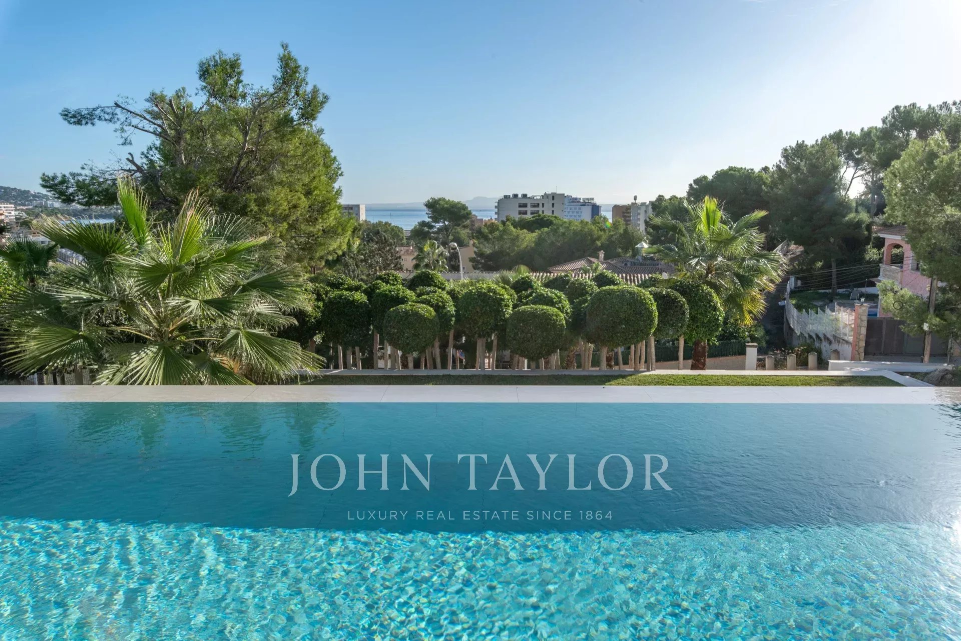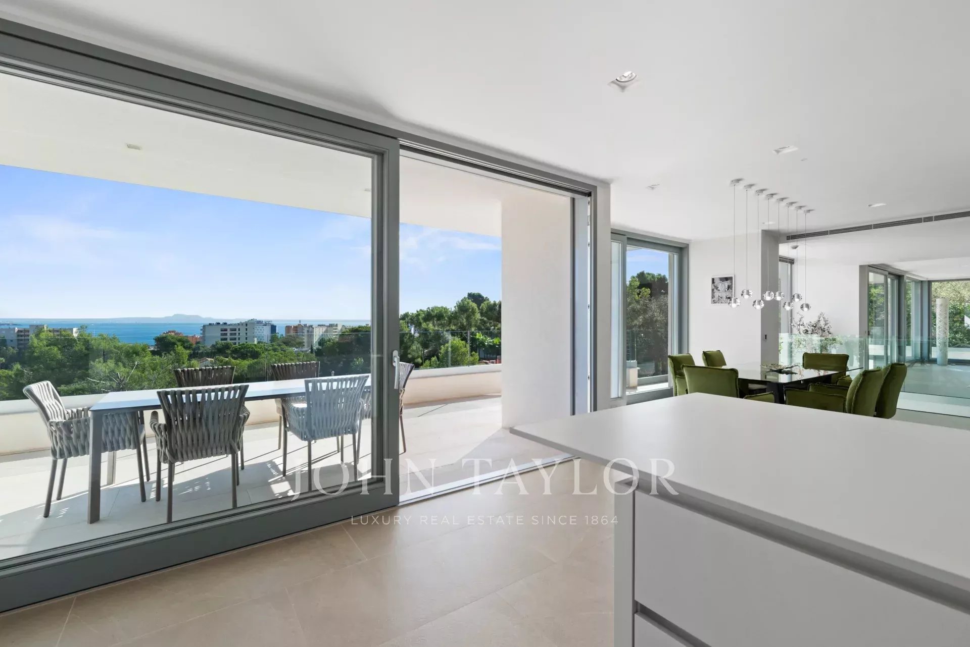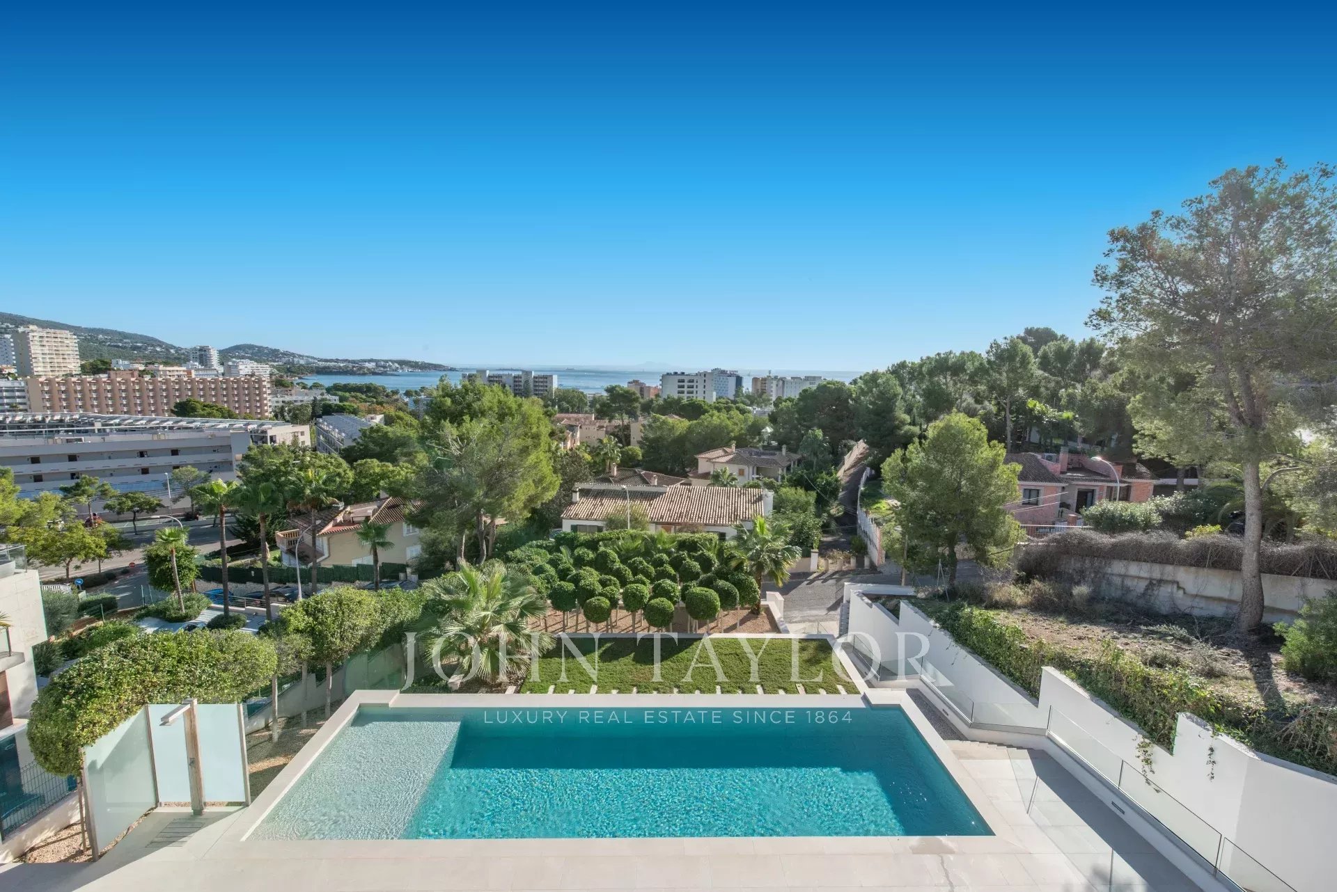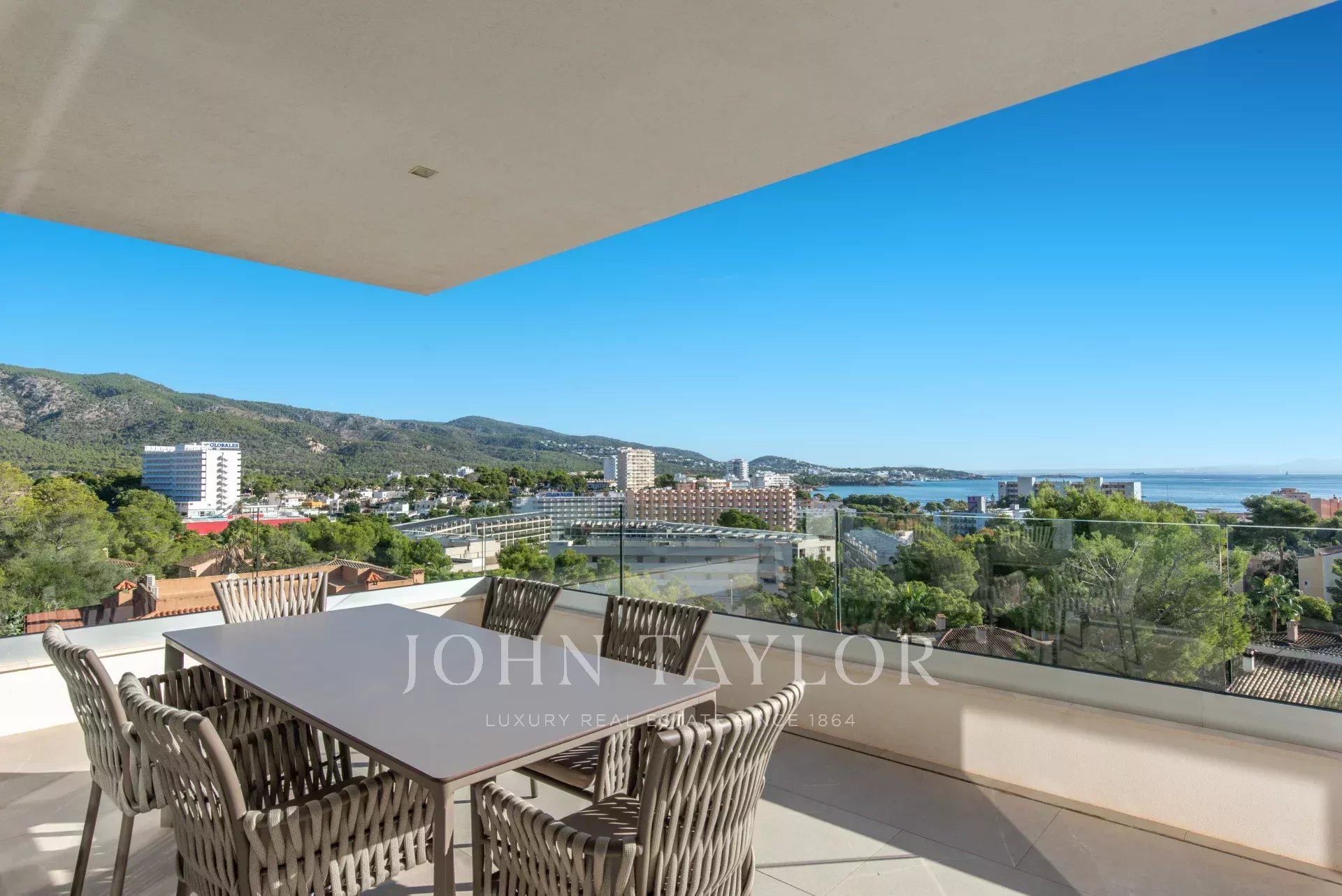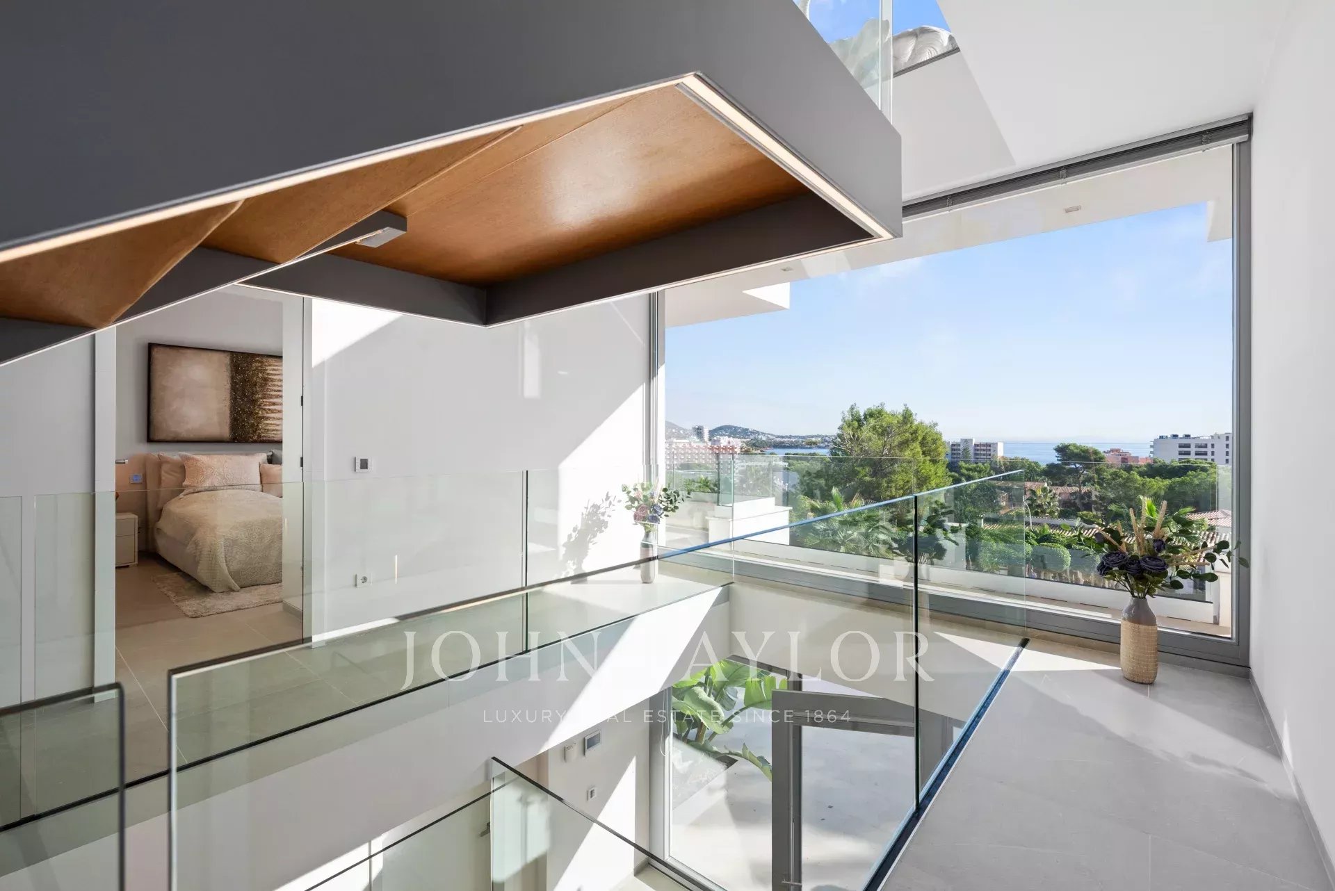 Surélevée et entourée de tranquillité, cette villa de luxe de style minimaliste est un havre de design et de confort dans un cul-de-sac exclusif à proximité d'une zone verte. Son orientation sud-est lui permet de bénéficier de la lumière du soleil tout au long de la journée et d'une vue partielle sur la mer pour une atmosphère méditerranéenne inégalée. Située sur un généreux terrain d'environ 1 220 m², elle n'est qu'à quelques minutes à pied du centre animé de Palmanova et de ses trois plages de sable fin. Construite en 2020, la propriété allie l'élégance contemporaine à des matériaux de qualité supérieure et à une technologie avancée. L'étage supérieur vous invite à profiter d'un espace de vie ouvert et lumineux, où le salon, la salle à manger et la cuisine design sur mesure sont parfaitement intégrés. Depuis la grande terrasse couverte, on accède au toit-terrasse avec pré-installation pour une cuisine extérieure, idéale pour des soirées inoubliables en plein air. L'étage principal abrite quatre chambres à coucher, toutes dotées d'une salle de bains privative et d'un accès à la terrasse couverte qui entoure la maison. Au niveau de la piscine, une cinquième chambre - actuellement un gymnase - complète le confort de la villa, ainsi qu'un double garage, une buanderie, un local technique et une salle de bains supplémentaire. Un ascenseur panoramique relie élégamment tous les niveaux de la maison. La villa offre le plus haut niveau de confort avec piscine d'eau salée, chauffage au sol, climatisation chaud/froid, pompe à chaleur, système domotique, alarme et ascenseur avec accès à tous les étages. Une résidence moderne, dans un environnement serein mais parfaitement communicant - à seulement quelques minutes des magasins, des restaurants et de la mer - qui incarne parfaitement le style de vie méditerranéen le plus sophistiqué.