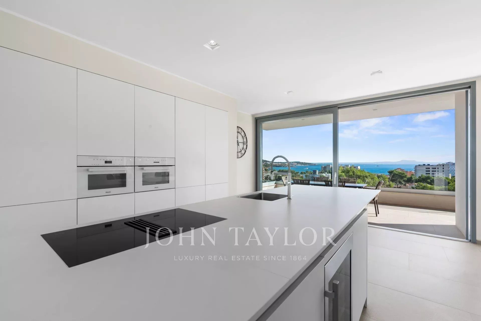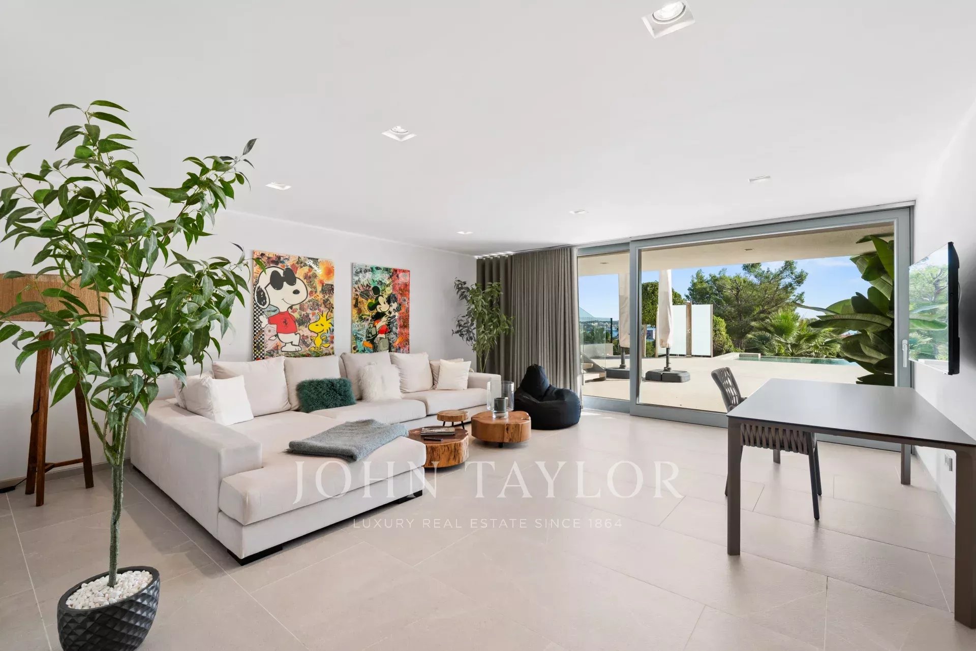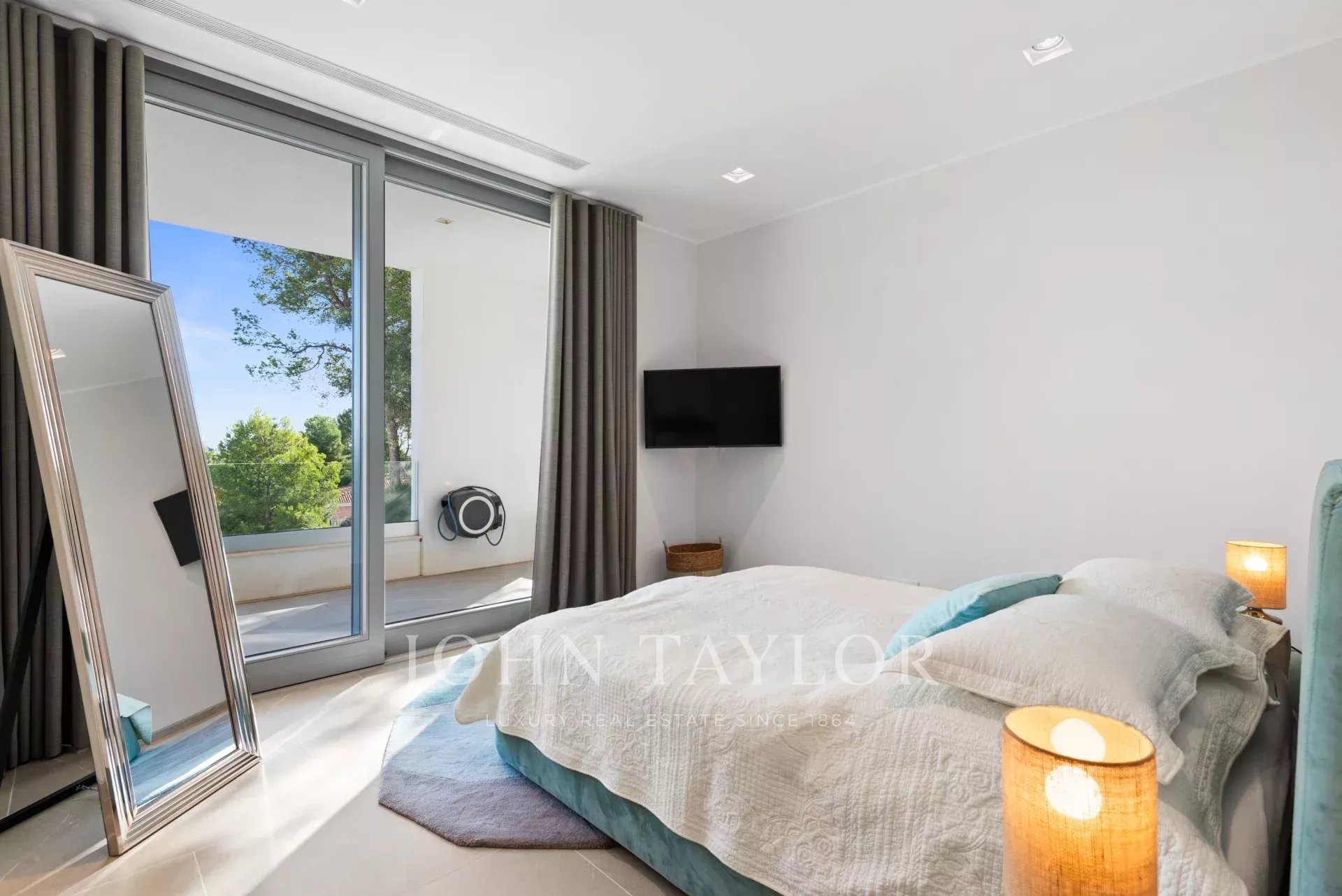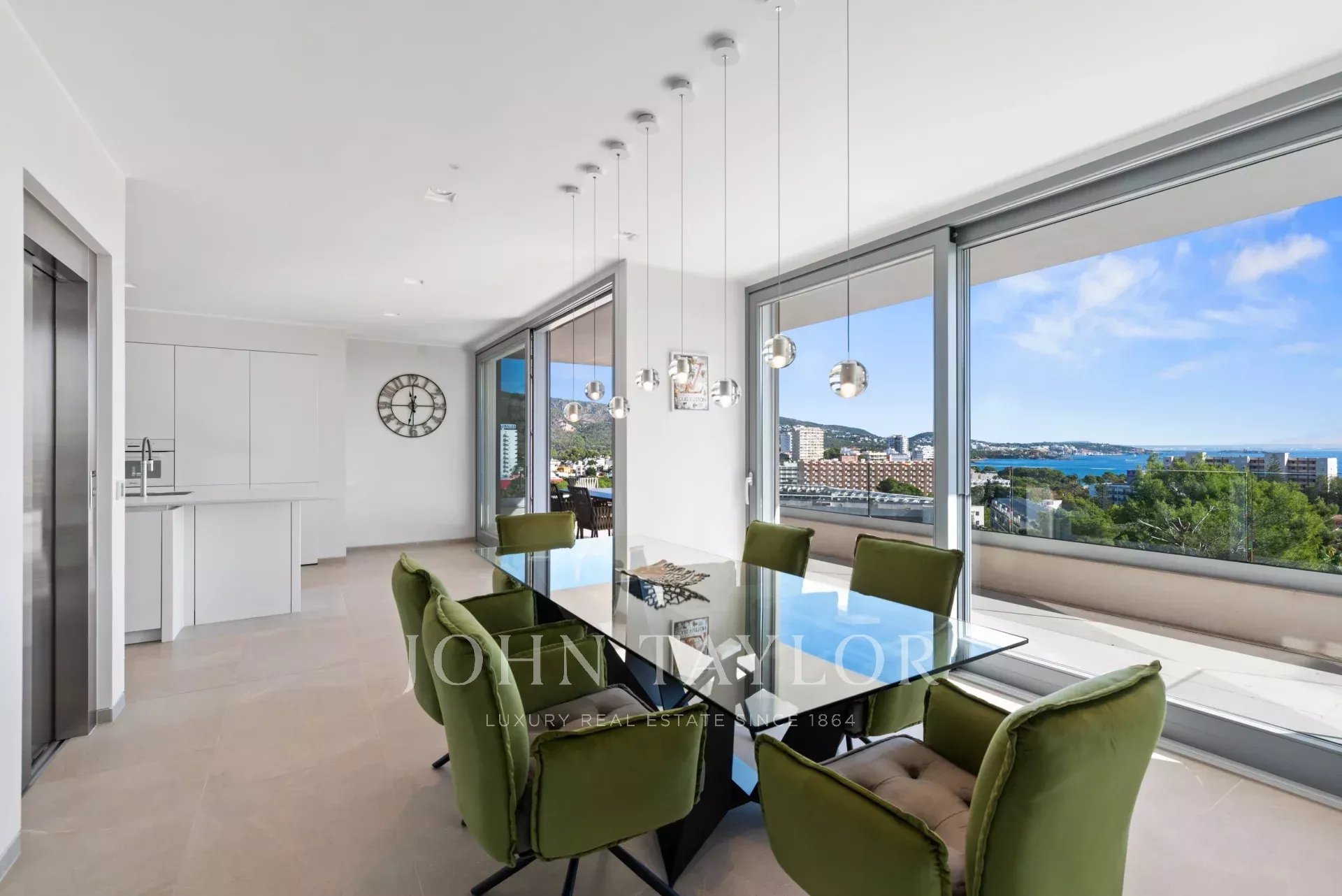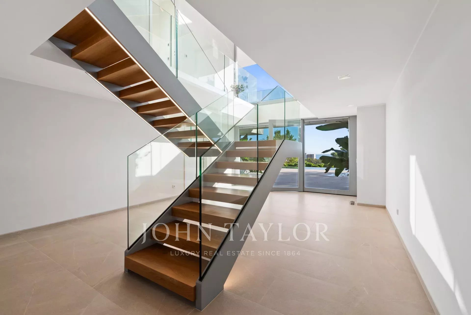 Surélevée et entourée de tranquillité, cette villa de luxe de style minimaliste est un havre de design et de confort dans un cul-de-sac exclusif à proximité d'une zone verte. Son orientation sud-est lui permet de bénéficier de la lumière du soleil tout au long de la journée et d'une vue partielle sur la mer pour une atmosphère méditerranéenne inégalée. Située sur un généreux terrain d'environ 1 220 m², elle n'est qu'à quelques minutes à pied du centre animé de Palmanova et de ses trois plages de sable fin. Construite en 2020, la propriété allie l'élégance contemporaine à des matériaux de qualité supérieure et à une technologie avancée. L'étage supérieur vous invite à profiter d'un espace de vie ouvert et lumineux, où le salon, la salle à manger et la cuisine design sur mesure sont parfaitement intégrés. Depuis la grande terrasse couverte, on accède au toit-terrasse avec pré-installation pour une cuisine extérieure, idéale pour des soirées inoubliables en plein air. L'étage principal abrite quatre chambres à coucher, toutes dotées d'une salle de bains privative et d'un accès à la terrasse couverte qui entoure la maison. Au niveau de la piscine, une cinquième chambre - actuellement un gymnase - complète le confort de la villa, ainsi qu'un double garage, une buanderie, un local technique et une salle de bains supplémentaire. Un ascenseur panoramique relie élégamment tous les niveaux de la maison. La villa offre le plus haut niveau de confort avec piscine d'eau salée, chauffage au sol, climatisation chaud/froid, pompe à chaleur, système domotique, alarme et ascenseur avec accès à tous les étages. Une résidence moderne, dans un environnement serein mais parfaitement communicant - à seulement quelques minutes des magasins, des restaurants et de la mer - qui incarne parfaitement le style de vie méditerranéen le plus sophistiqué.