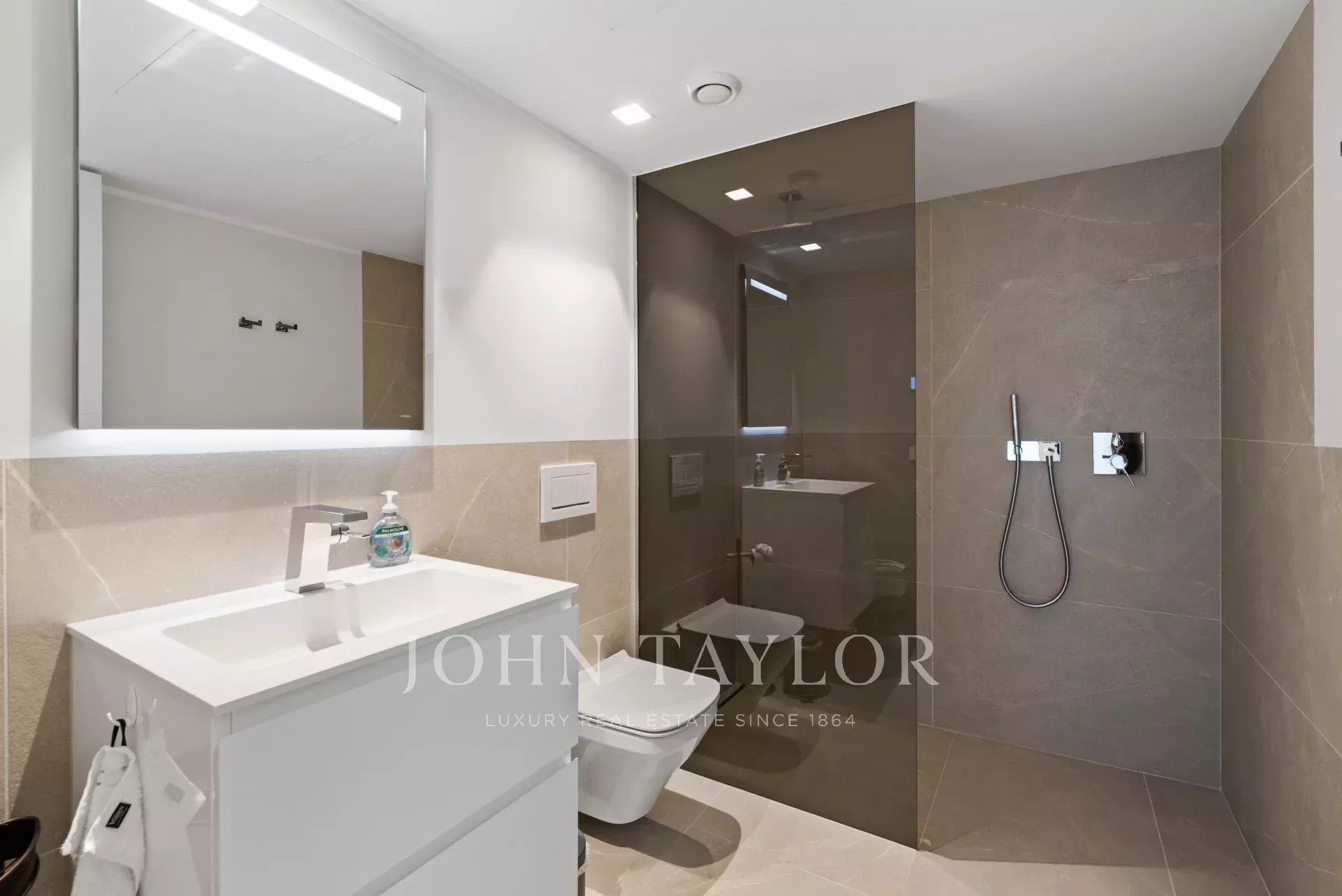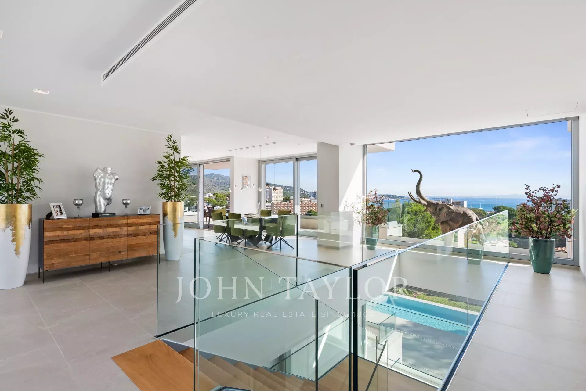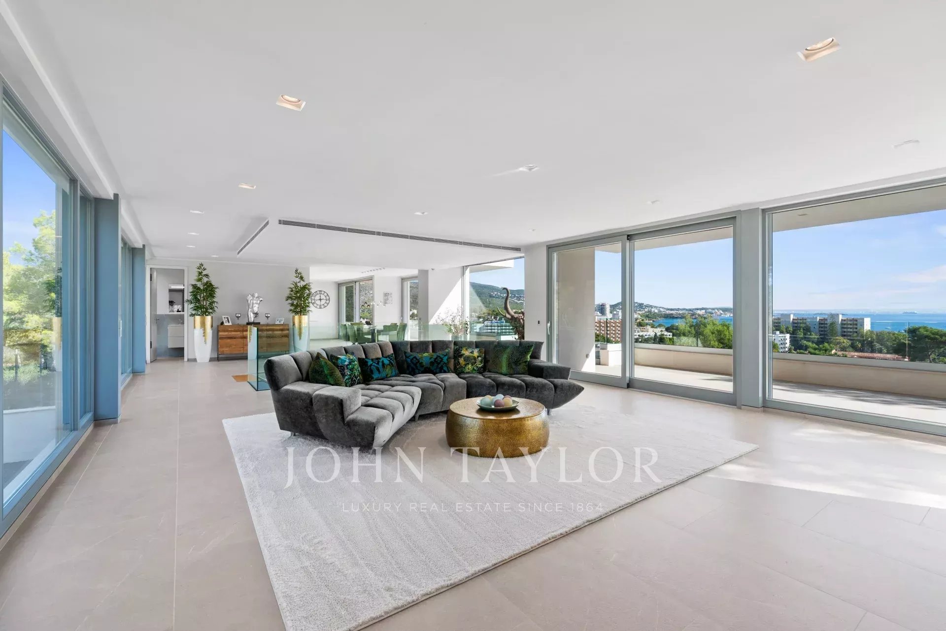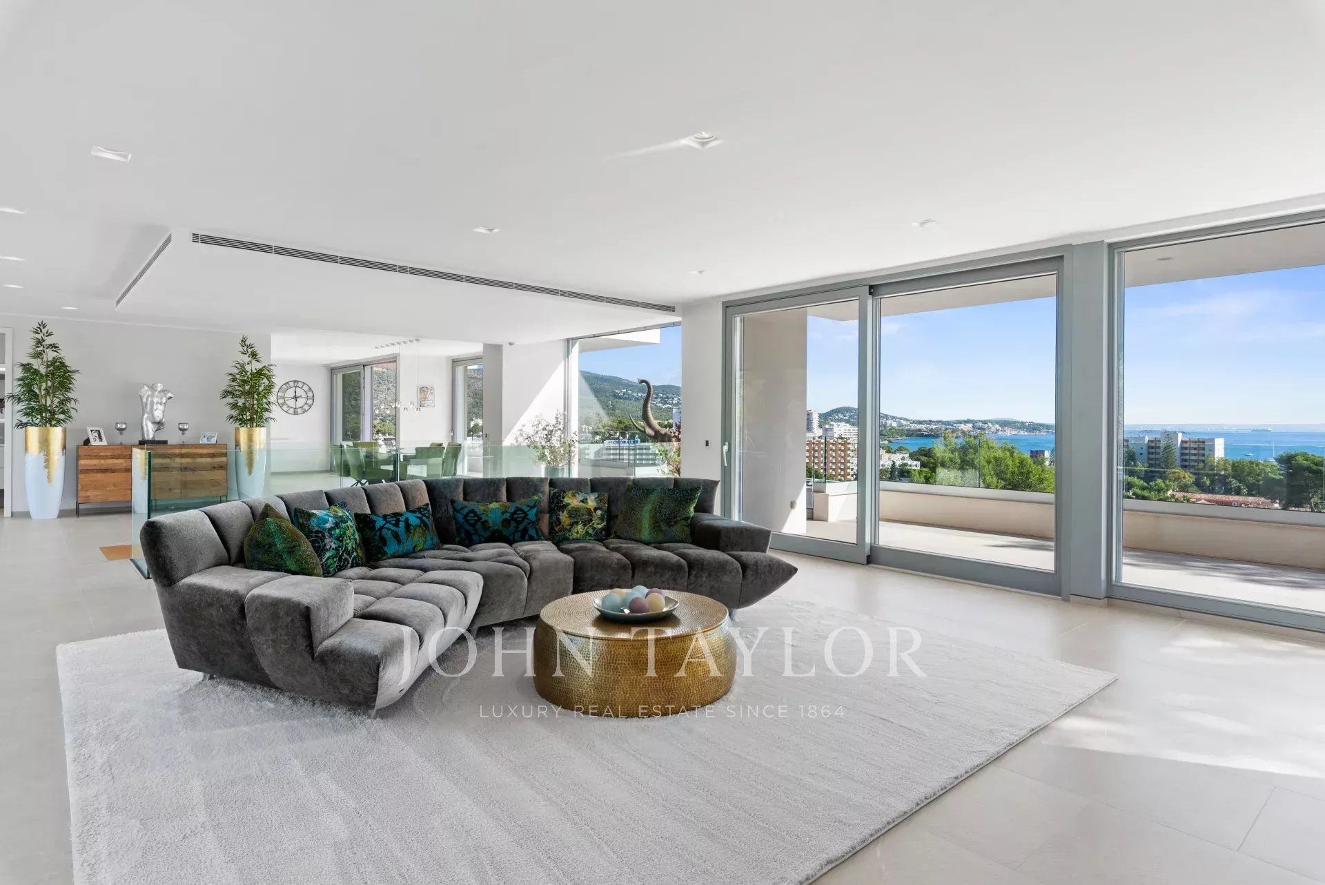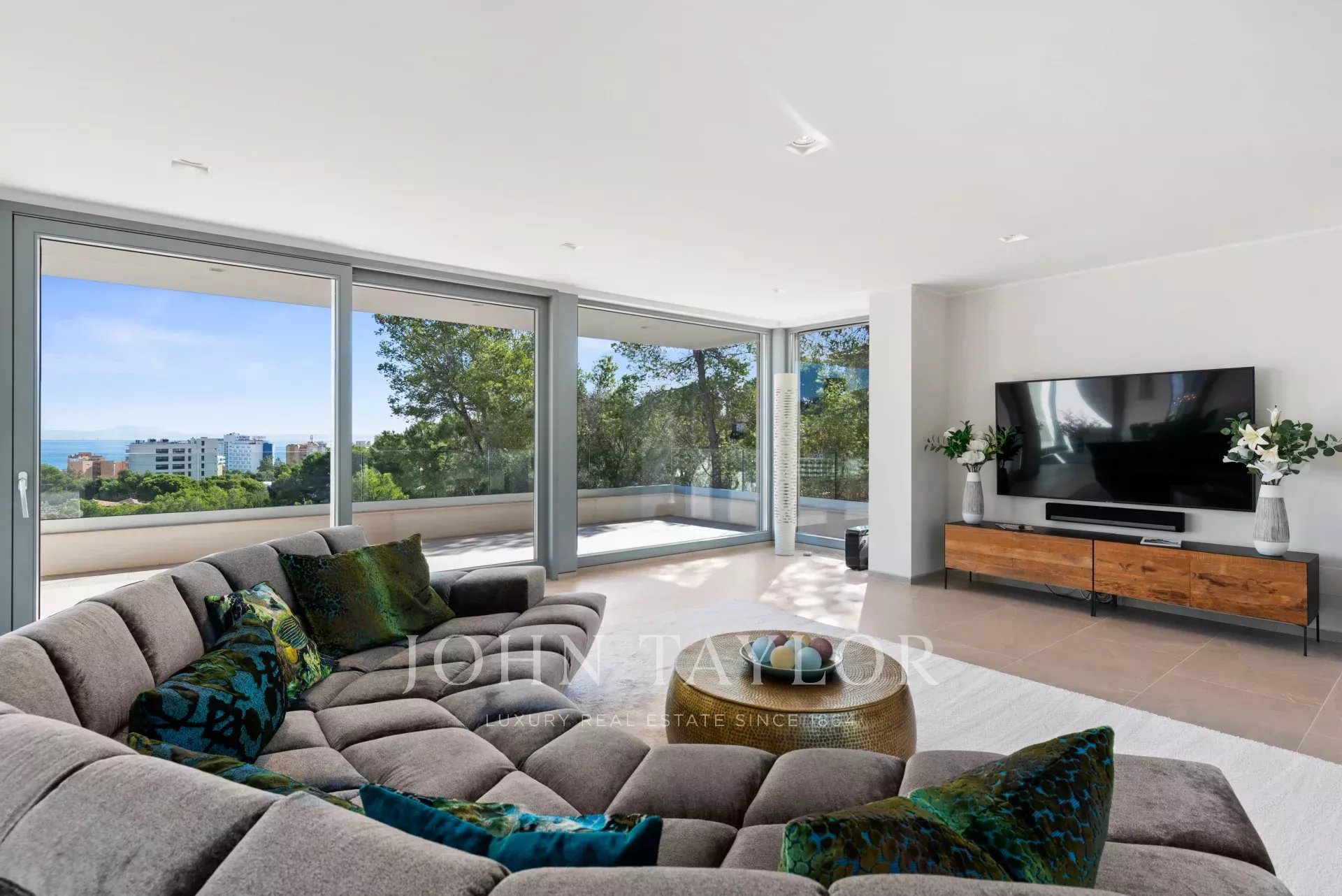 Surélevée et entourée de tranquillité, cette villa de luxe de style minimaliste est un havre de design et de confort dans un cul-de-sac exclusif à proximité d'une zone verte. Son orientation sud-est lui permet de bénéficier de la lumière du soleil tout au long de la journée et d'une vue partielle sur la mer pour une atmosphère méditerranéenne inégalée. Située sur un généreux terrain d'environ 1 220 m², elle n'est qu'à quelques minutes à pied du centre animé de Palmanova et de ses trois plages de sable fin. Construite en 2020, la propriété allie l'élégance contemporaine à des matériaux de qualité supérieure et à une technologie avancée. L'étage supérieur vous invite à profiter d'un espace de vie ouvert et lumineux, où le salon, la salle à manger et la cuisine design sur mesure sont parfaitement intégrés. Depuis la grande terrasse couverte, on accède au toit-terrasse avec pré-installation pour une cuisine extérieure, idéale pour des soirées inoubliables en plein air. L'étage principal abrite quatre chambres à coucher, toutes dotées d'une salle de bains privative et d'un accès à la terrasse couverte qui entoure la maison. Au niveau de la piscine, une cinquième chambre - actuellement un gymnase - complète le confort de la villa, ainsi qu'un double garage, une buanderie, un local technique et une salle de bains supplémentaire. Un ascenseur panoramique relie élégamment tous les niveaux de la maison. La villa offre le plus haut niveau de confort avec piscine d'eau salée, chauffage au sol, climatisation chaud/froid, pompe à chaleur, système domotique, alarme et ascenseur avec accès à tous les étages. Une résidence moderne, dans un environnement serein mais parfaitement communicant - à seulement quelques minutes des magasins, des restaurants et de la mer - qui incarne parfaitement le style de vie méditerranéen le plus sophistiqué.