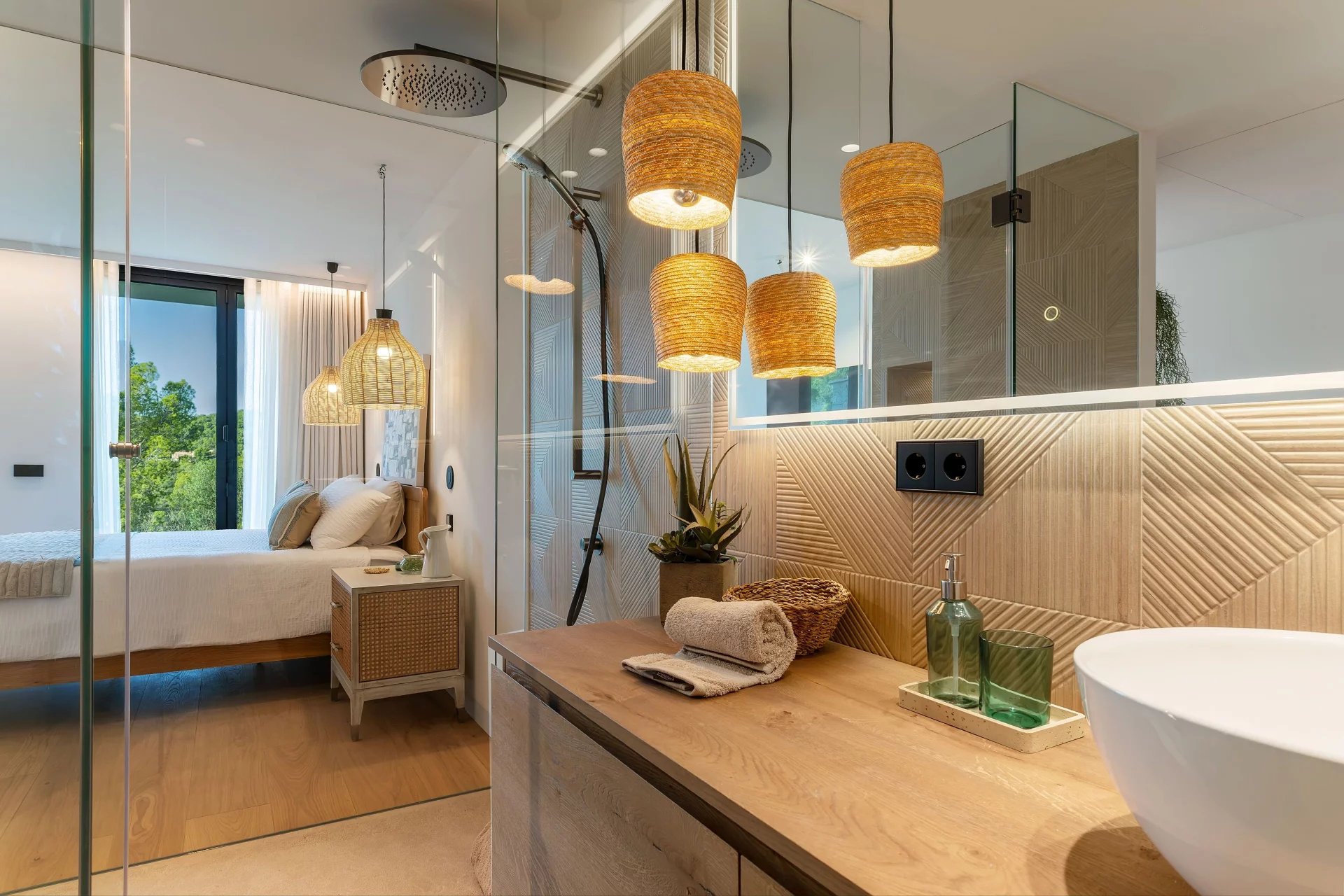Le design se prolonge à l'extérieur avec plusieurs terrasses qui profitent au maximum du soleil de Majorque, créant des espaces de vie extérieurs parfaits pour les soirées étoilées ou les réunions en plein air. La piscine à débordement, telle une oasis de tranquillité, contraste avec le ciel vibrant et offre un cadre parfait pour se détendre, tandis qu'un bureau privé ou une bibliothèque avec une vue imprenable ajoute une touche de sophistication à l'environnement.
