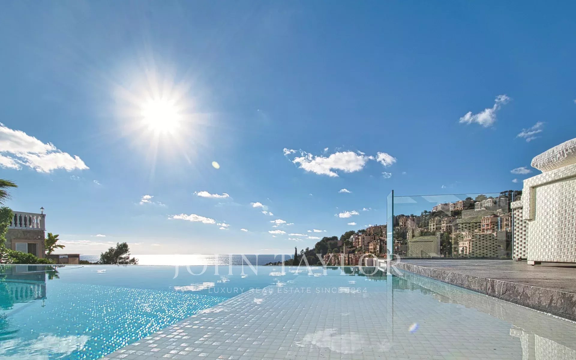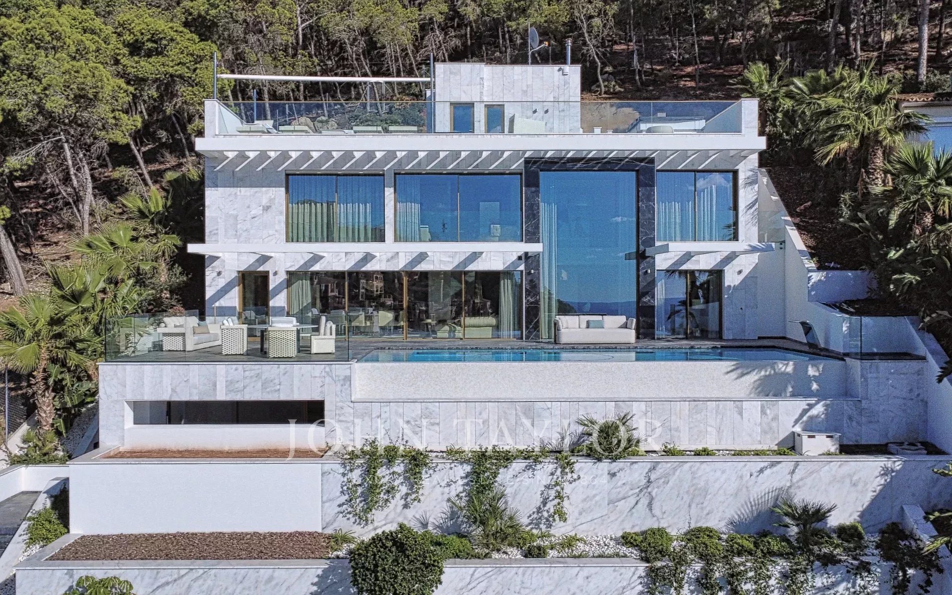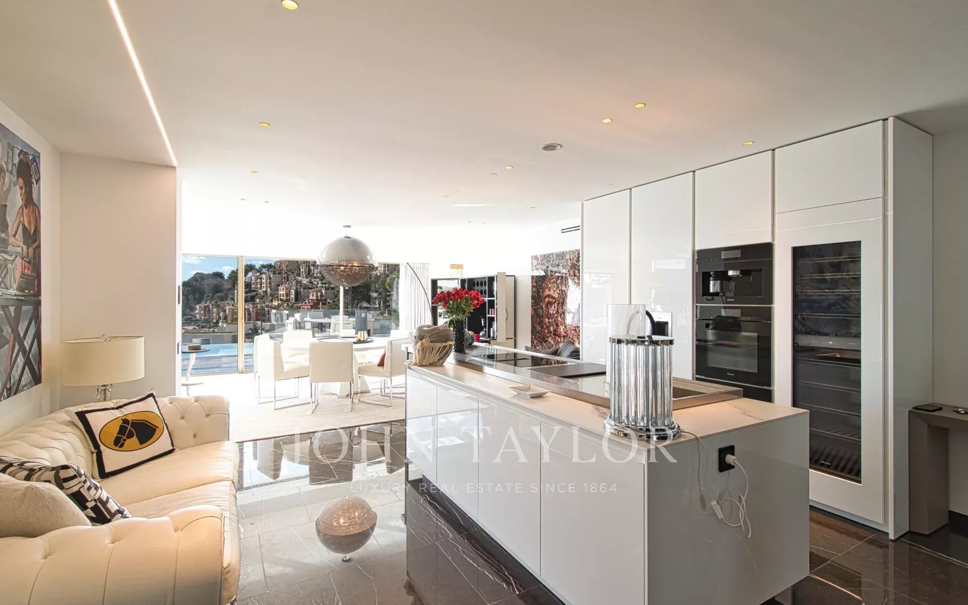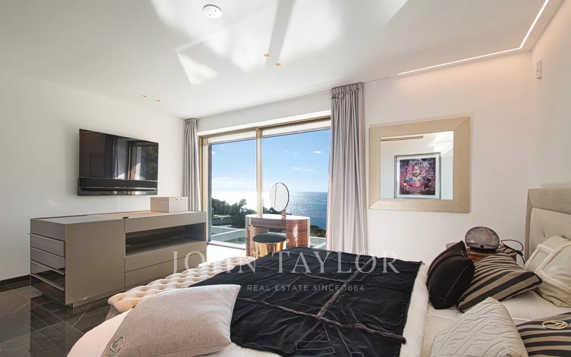 À l'intérieur, 532 m² de pièces raffinées se déploient sur trois niveaux : un monde de sophistication sereine et de vues sur la mer à couper le souffle. L'étage principal s'ouvre sur un vaste salon lumineux dont les grandes baies vitrées encadrent l'horizon méditerranéen. Une cuisine design signée Poliform allie forme et fonction avec des appareils Miele, Gaggenau et Bora, tandis que l'accès direct à la terrasse vous invite à vivre l'ultime fusion entre l'intérieur et l'extérieur. La piscine à débordement semble se fondre dans la mer, créant une atmosphère de sérénité infinie.