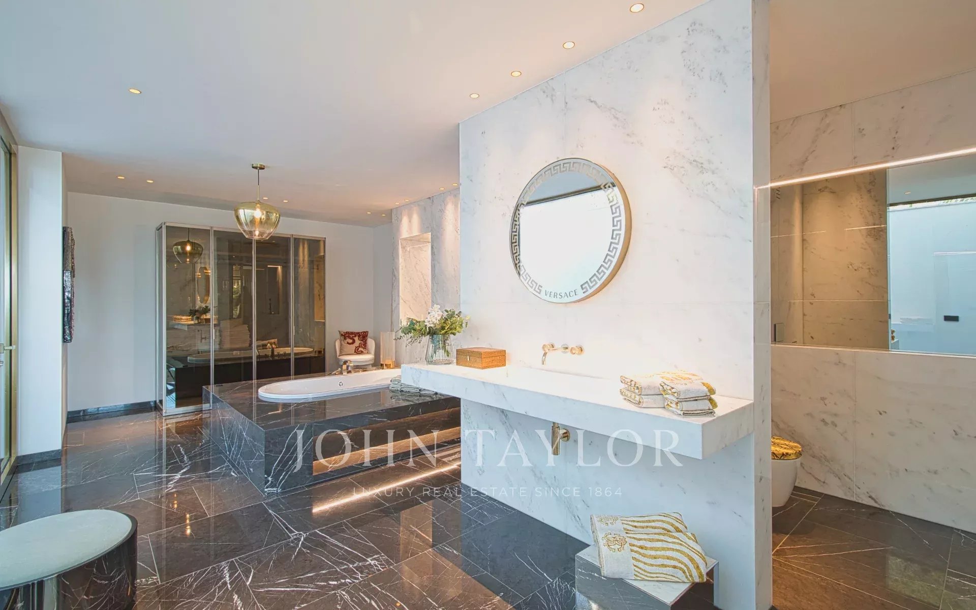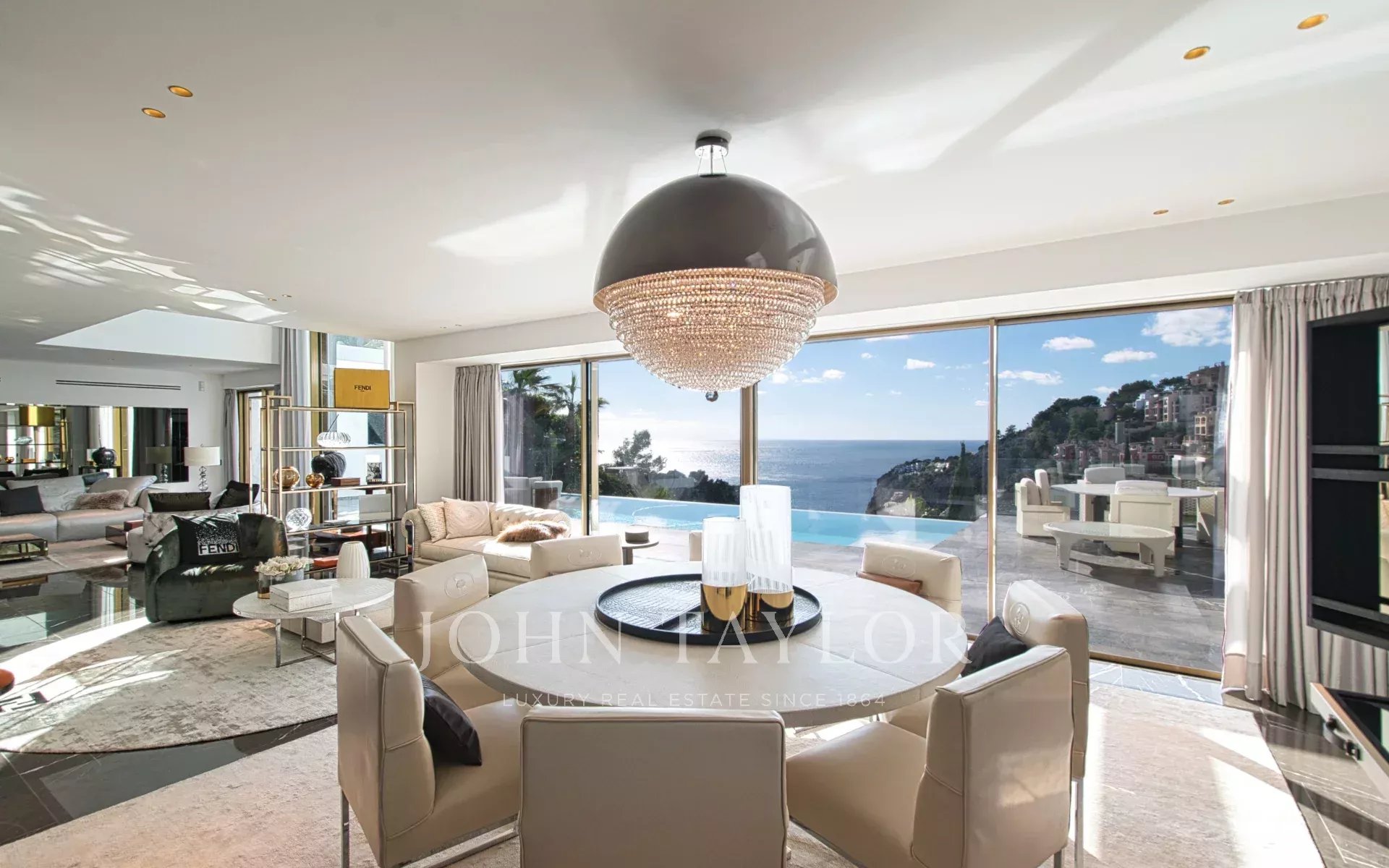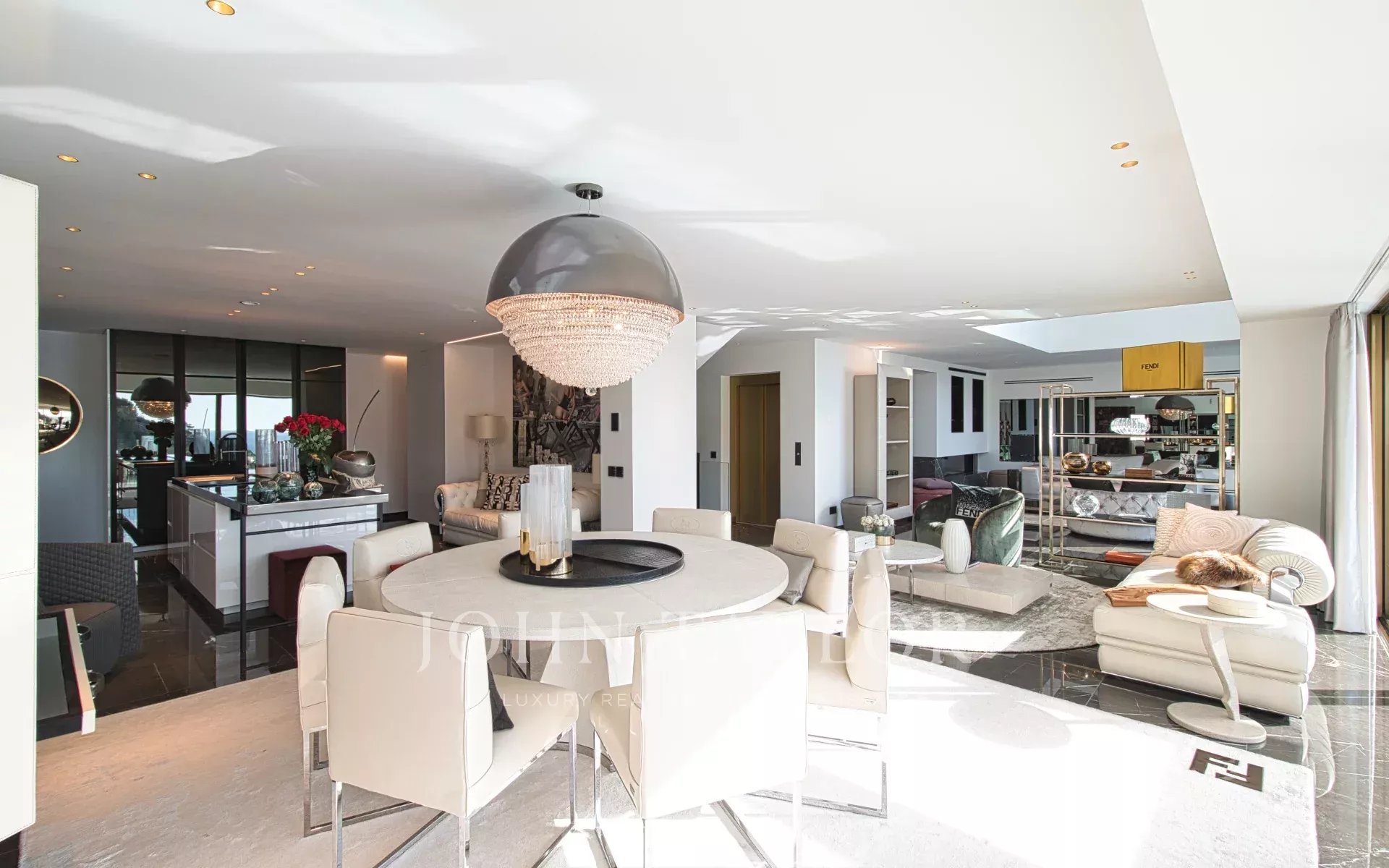 Trois variétés exceptionnelles de marbre définissent l'esthétique distinctive de la villa. Le mobilier de Fendi Casa et Bentley Home (d'une valeur de 1,2 million d'euros) complète ce chef-d'œuvre de design intérieur contemporain.