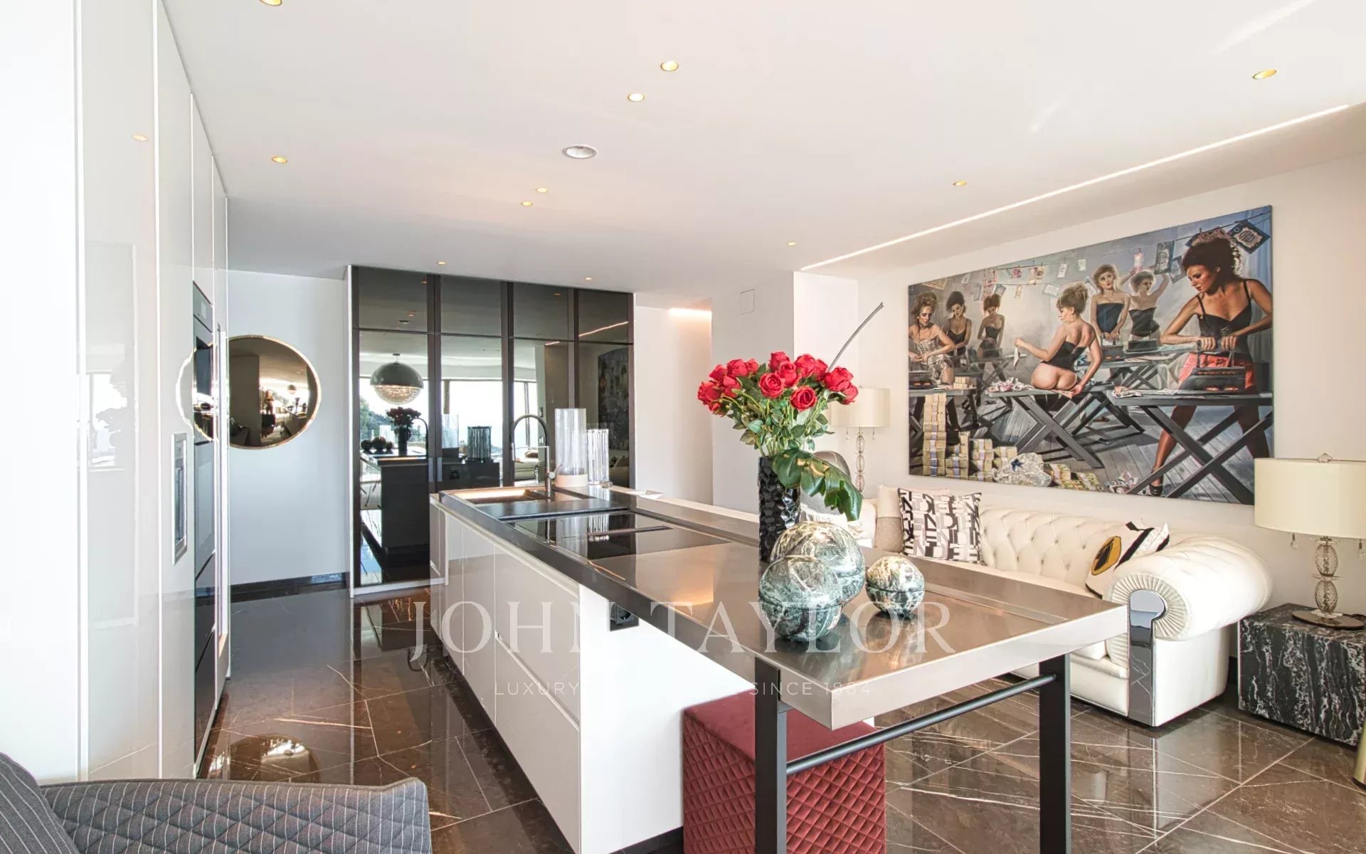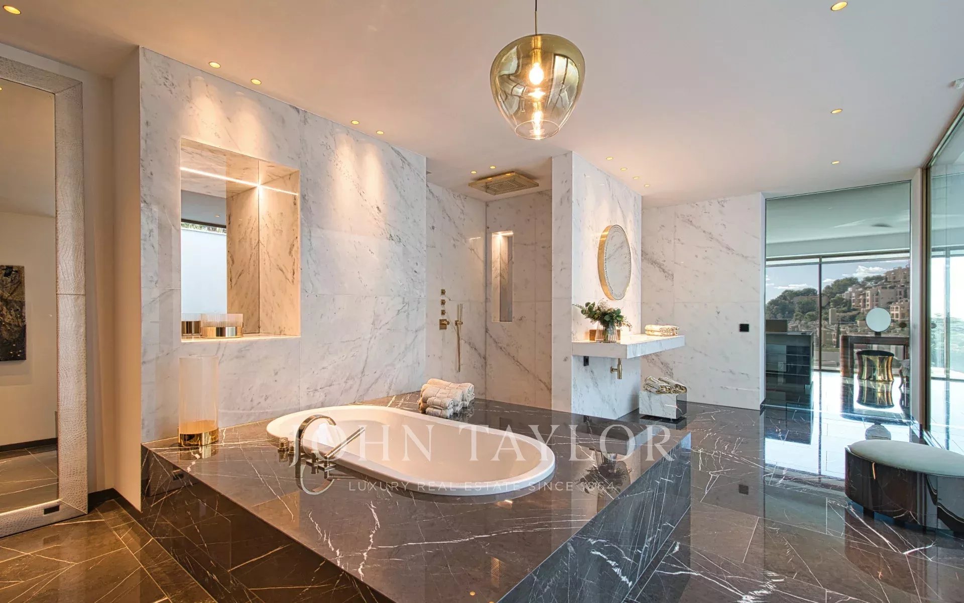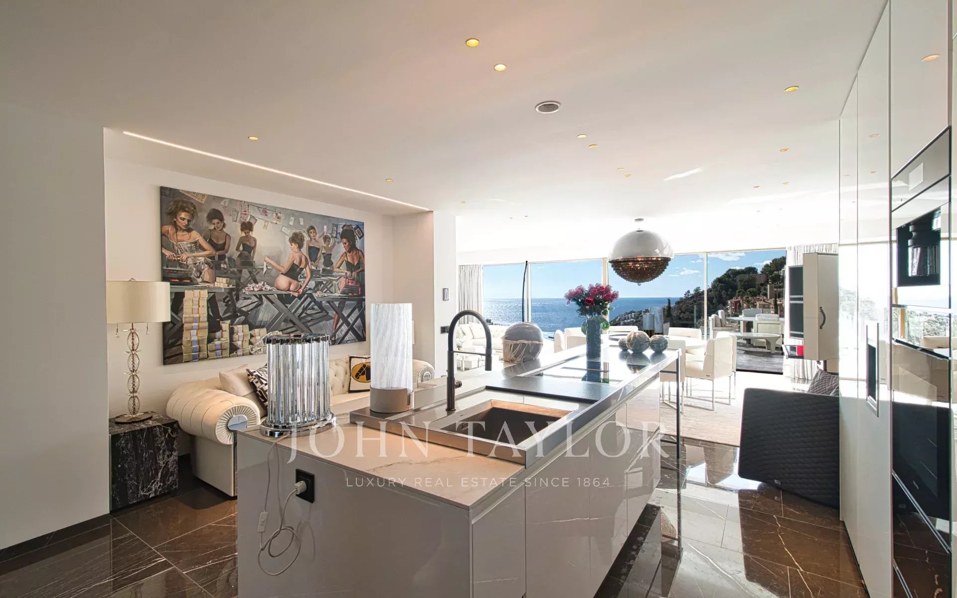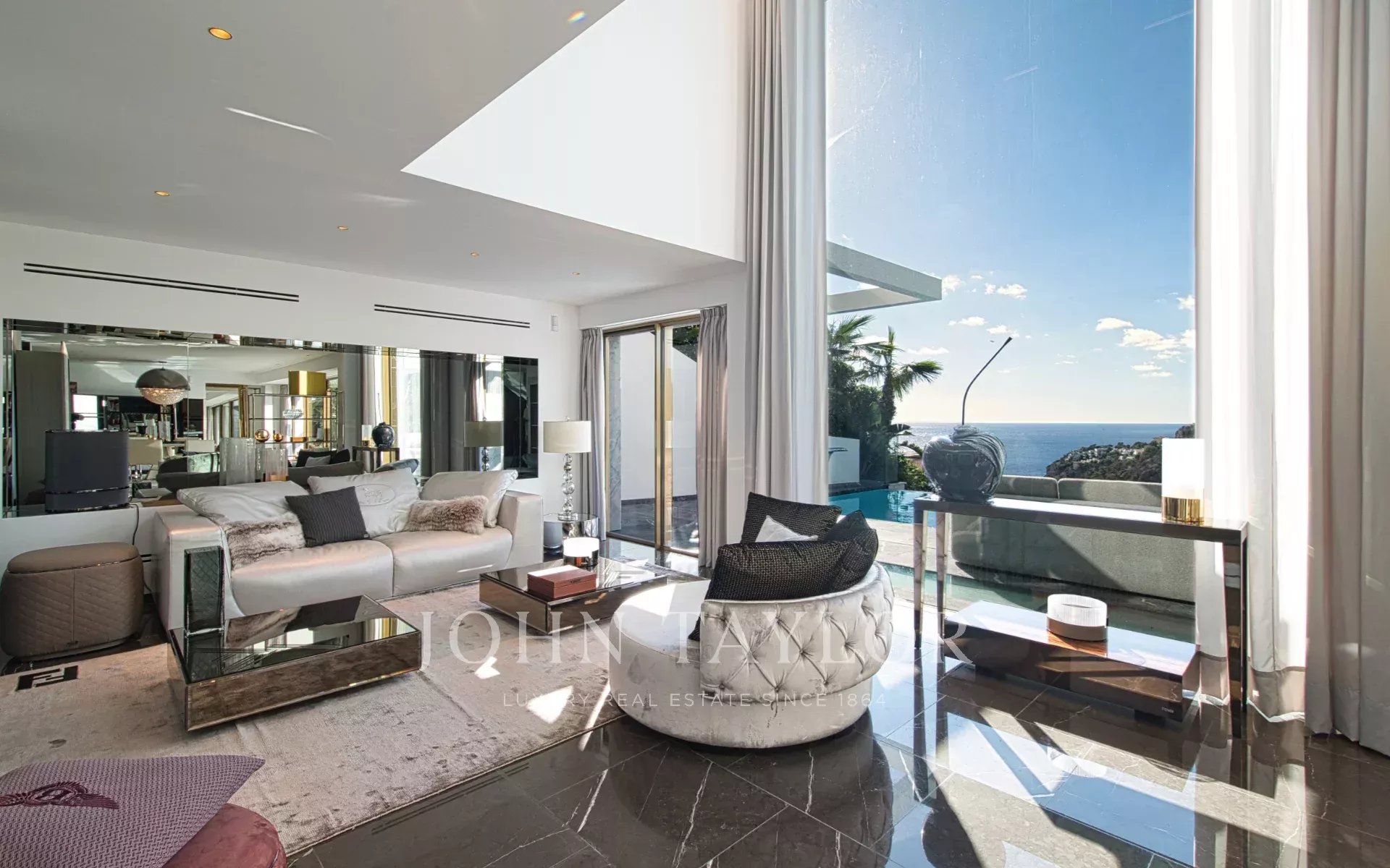 Trois variétés exceptionnelles de marbre définissent l'esthétique distinctive de la villa. Le mobilier de Fendi Casa et Bentley Home (d'une valeur de 1,2 million d'euros) complète ce chef-d'œuvre de design intérieur contemporain.