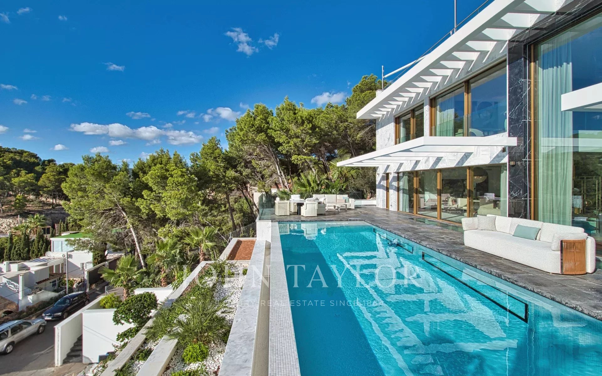 À l'étage, trois suites offrent des sanctuaires privés de confort et de tranquillité. Chacune dispose d'une salle de bains privative, d'armoires Poliform sur mesure et de terrasses privées surplombant la mer d'un bleu profond. Ici, le luxe n'est pas un concept, mais un mode de vie qui se vit intimement au quotidien.