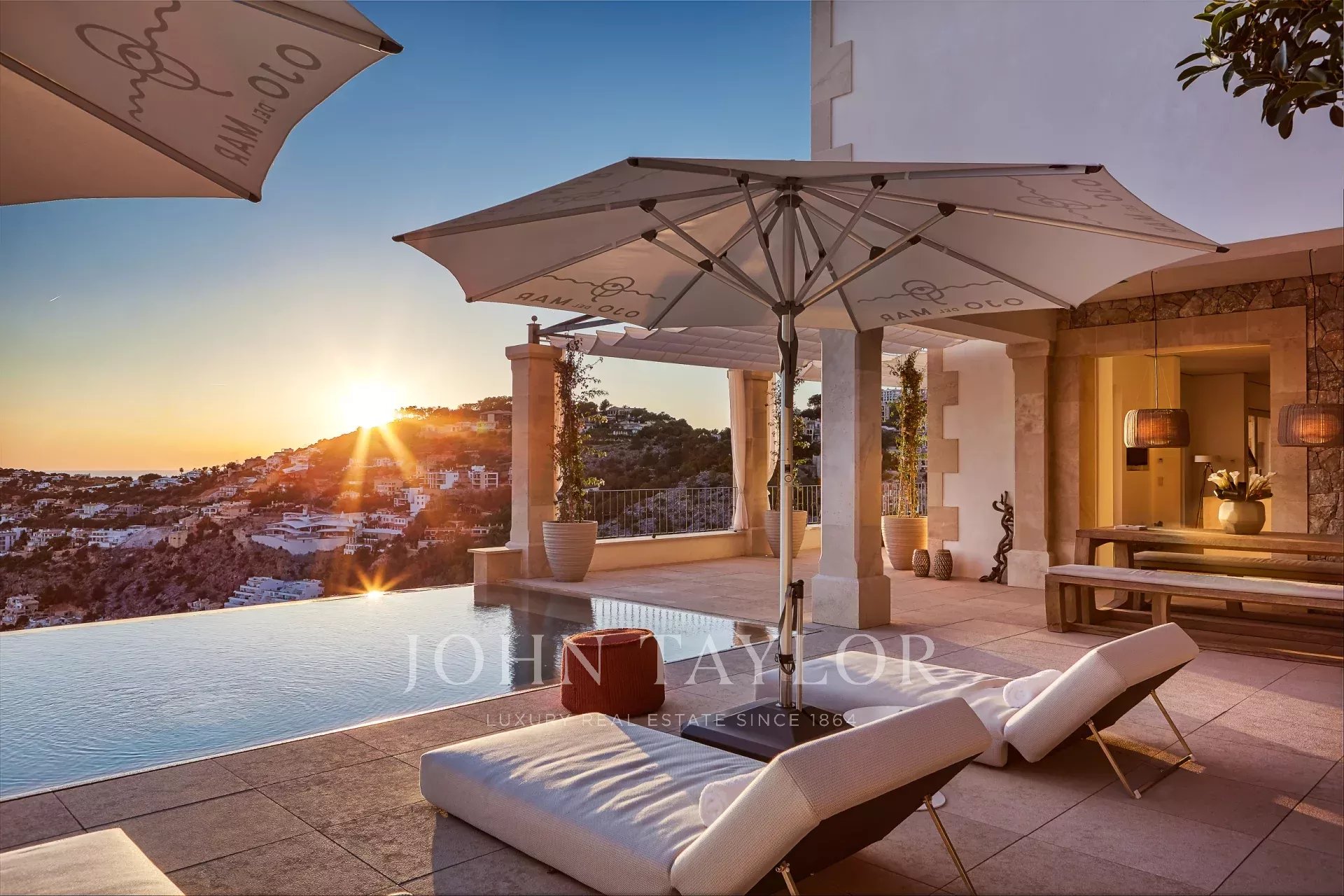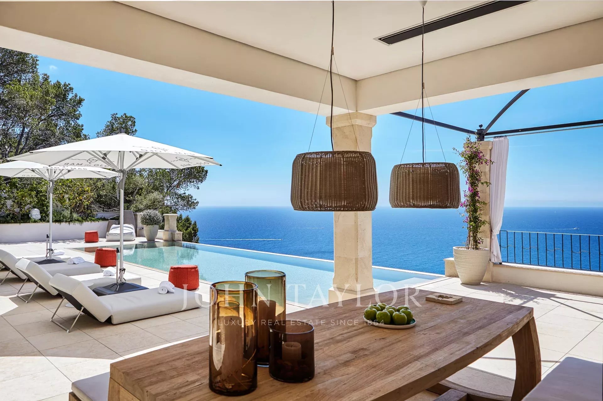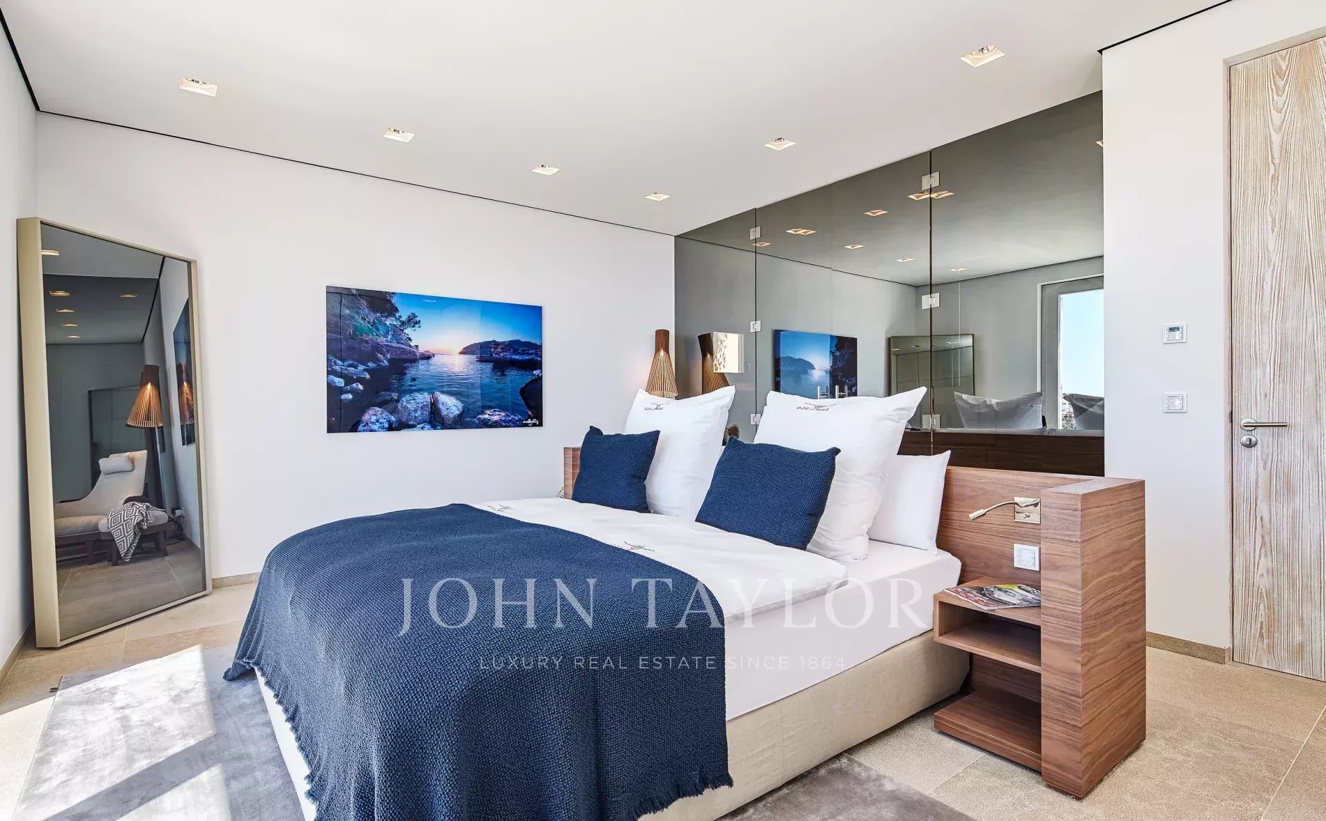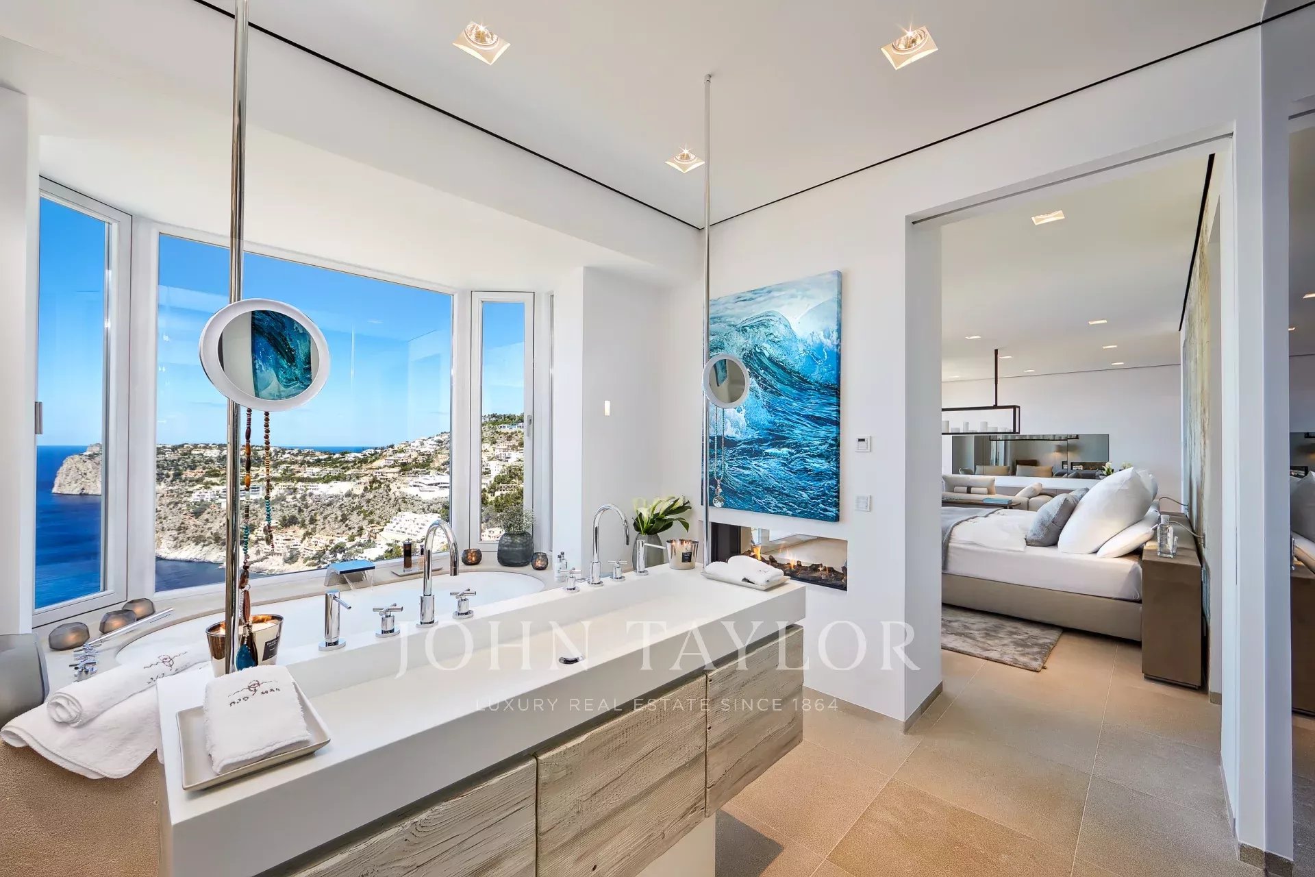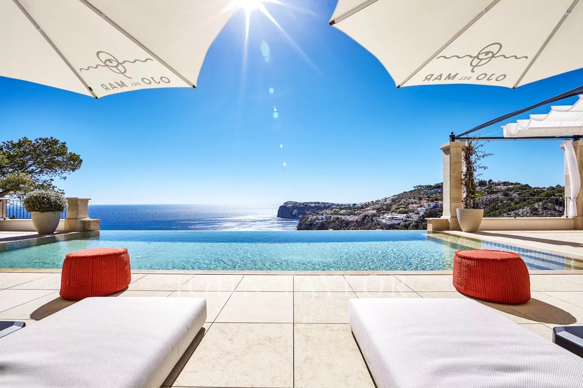 Cette luxueuse propriété est située dans un endroit recherché au-dessus de la baie de Cala Llamp et offre des vues panoramiques sur la mer à couper le souffle. La villa a une surface construite de 700m2 sur trois niveaux. Au rez-de-chaussée, un élégant hall d'entrée mène au salon de télévision, au salon, à la salle à manger et à la cuisine. L'espace de vie spacieux se prolonge à travers les pergolas sur les terrasses, où se trouvent deux cuisines extérieures avec des grilles de barbecue et une grande table à manger, ainsi qu'une salle de bains. La piscine à débordement de 60 m2 est un autre point fort. L'espace extérieur est conçu pour vous permettre de profiter parfaitement du climat méditerranéen. L'étage supérieur est accessible par l'ascenseur ou par l'escalier élégamment éclairé, où se trouve le coin nuit. Il se compose de deux chambres avec salle de bains privative et d'une confortable suite parentale. Cette dernière se compose d'une antichambre, d'un espace de couchage spacieux et d'une luxueuse salle de bains avec baignoire dans la baie vitrée. Au sous-sol, en plus du garage de 100m2, qui offre de l'espace pour au moins 5 voitures, il y a une bodega, une zone de fitness avec sauna, un home cinéma, une chambre de service avec salle de bain en-suite, une autre salle de bain, une buanderie, une salle de service et une salle de stockage. La propriété sera vendue avec le mobilier.