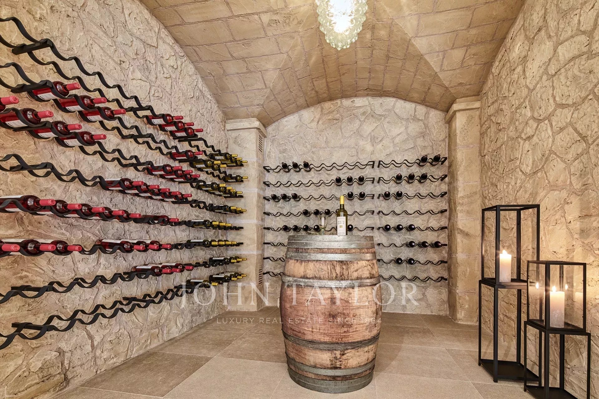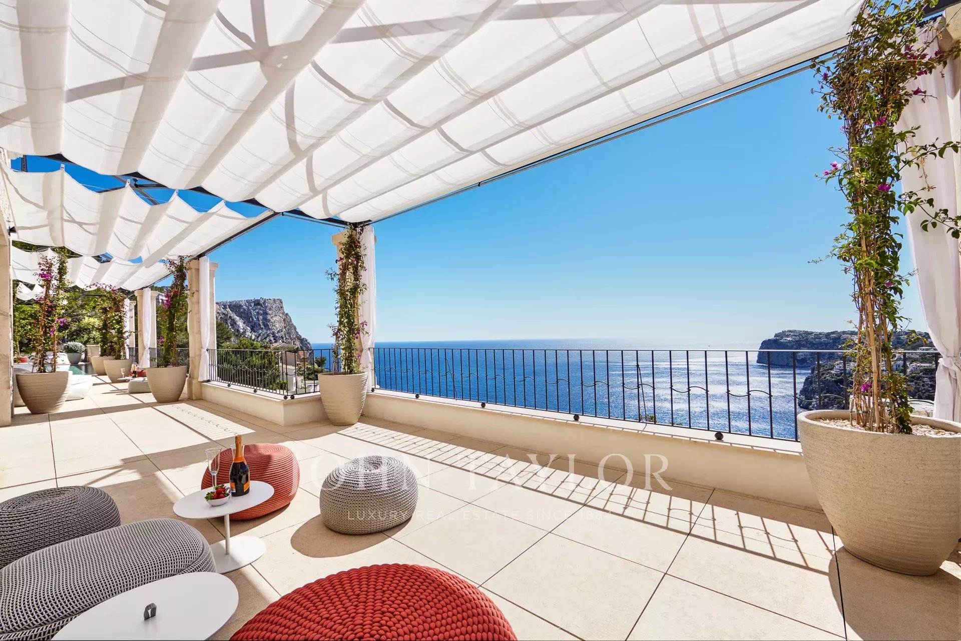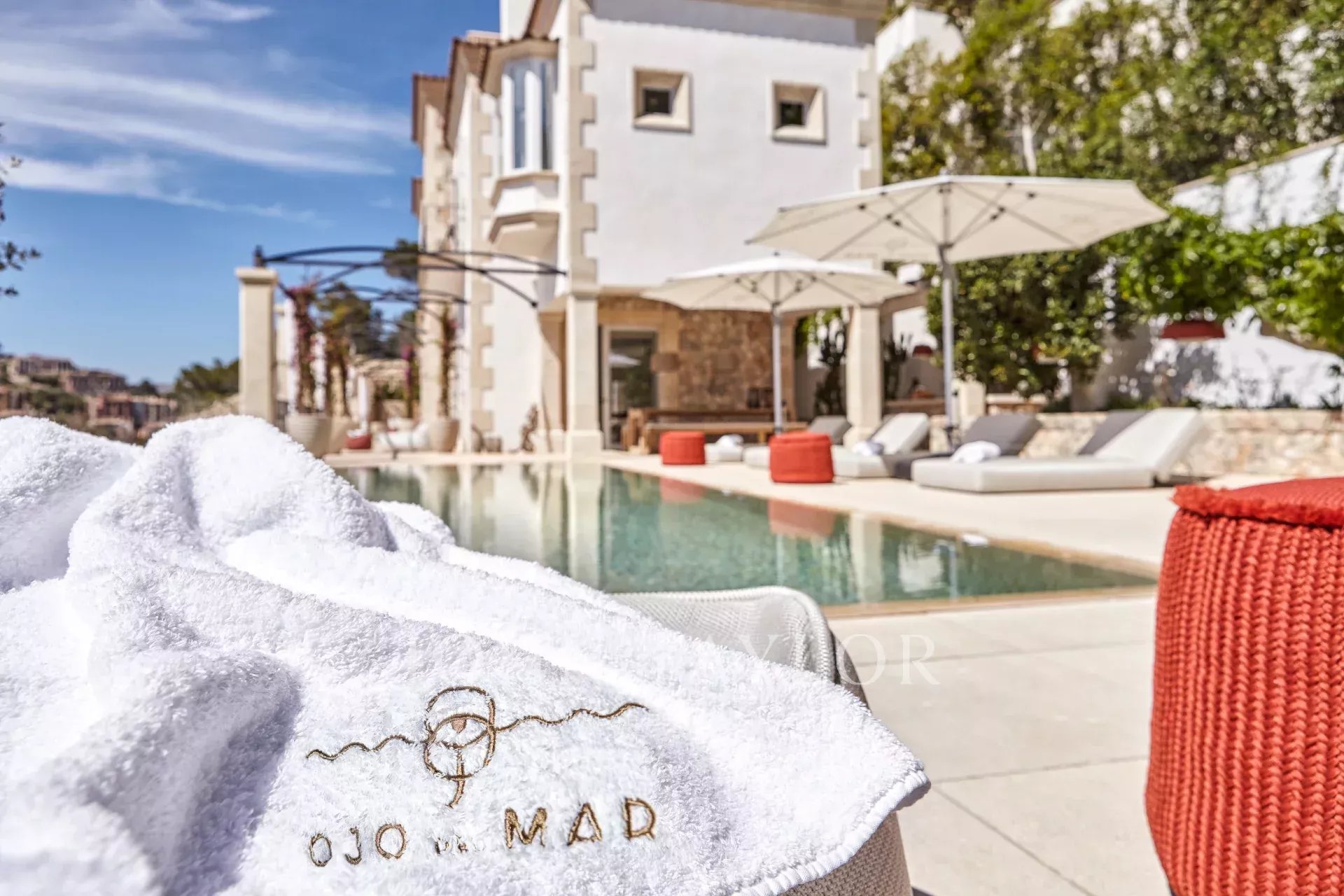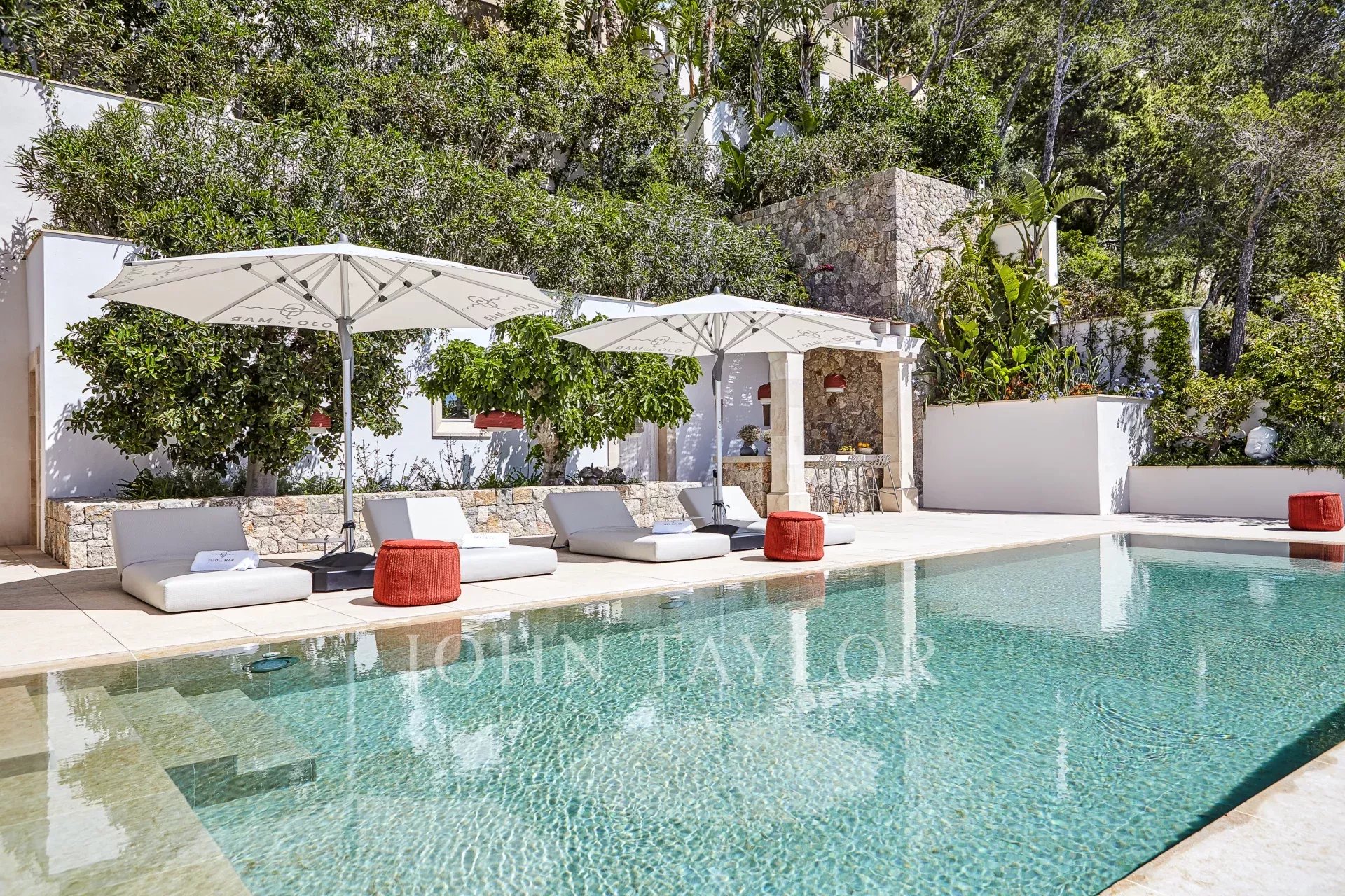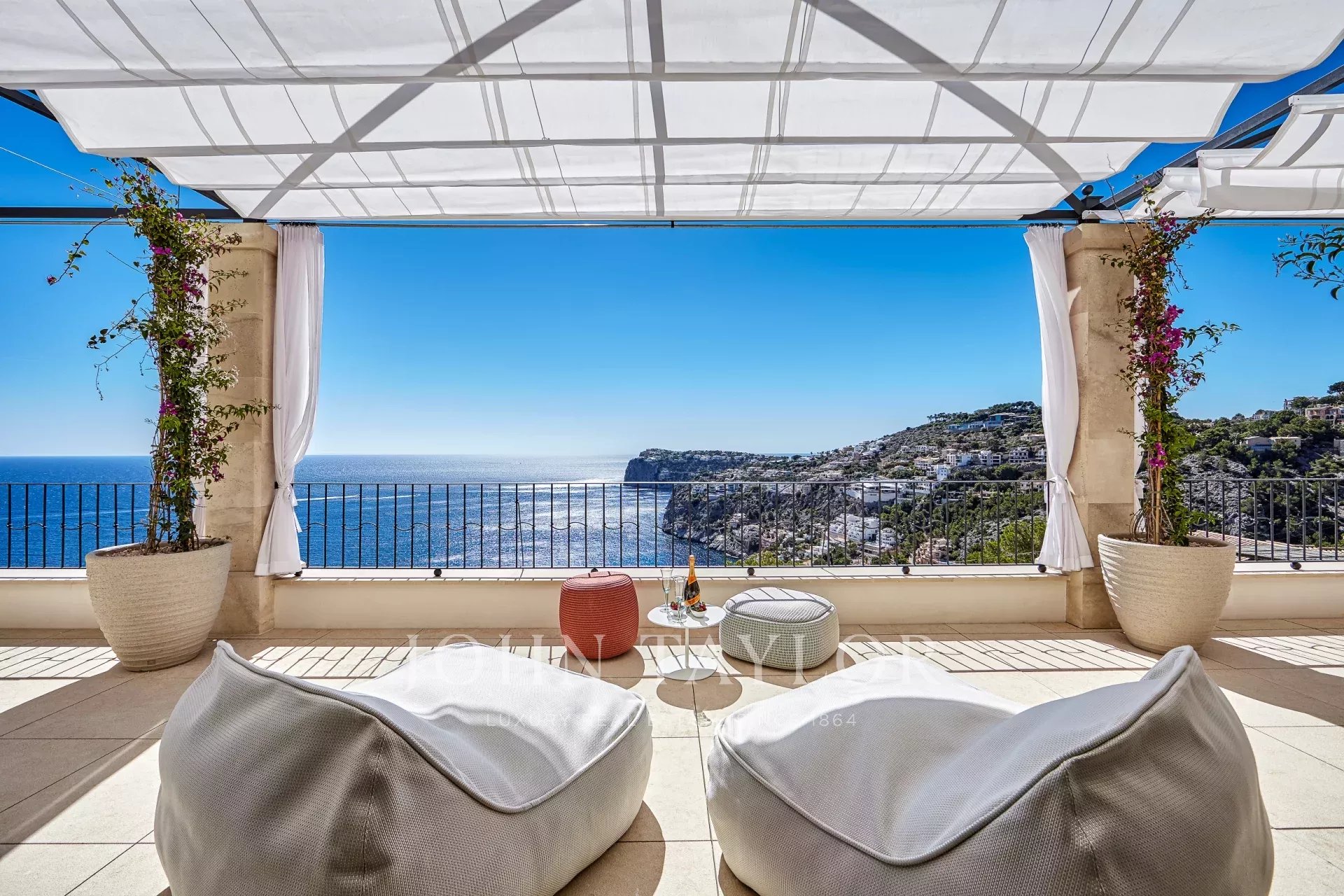 Cette luxueuse propriété est située dans un endroit recherché au-dessus de la baie de Cala Llamp et offre des vues panoramiques sur la mer à couper le souffle. La villa a une surface construite de 700m2 sur trois niveaux. Au rez-de-chaussée, un élégant hall d'entrée mène au salon de télévision, au salon, à la salle à manger et à la cuisine. L'espace de vie spacieux se prolonge à travers les pergolas sur les terrasses, où se trouvent deux cuisines extérieures avec des grilles de barbecue et une grande table à manger, ainsi qu'une salle de bains. La piscine à débordement de 60 m2 est un autre point fort. L'espace extérieur est conçu pour vous permettre de profiter parfaitement du climat méditerranéen. L'étage supérieur est accessible par l'ascenseur ou par l'escalier élégamment éclairé, où se trouve le coin nuit. Il se compose de deux chambres avec salle de bains privative et d'une confortable suite parentale. Cette dernière se compose d'une antichambre, d'un espace de couchage spacieux et d'une luxueuse salle de bains avec baignoire dans la baie vitrée. Au sous-sol, en plus du garage de 100m2, qui offre de l'espace pour au moins 5 voitures, il y a une bodega, une zone de fitness avec sauna, un home cinéma, une chambre de service avec salle de bain en-suite, une autre salle de bain, une buanderie, une salle de service et une salle de stockage. La propriété sera vendue avec le mobilier.
