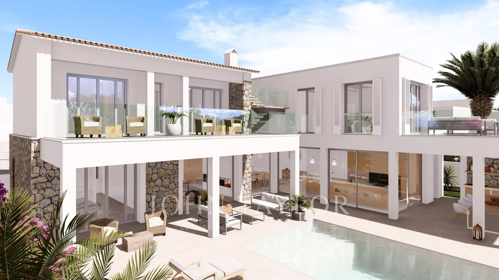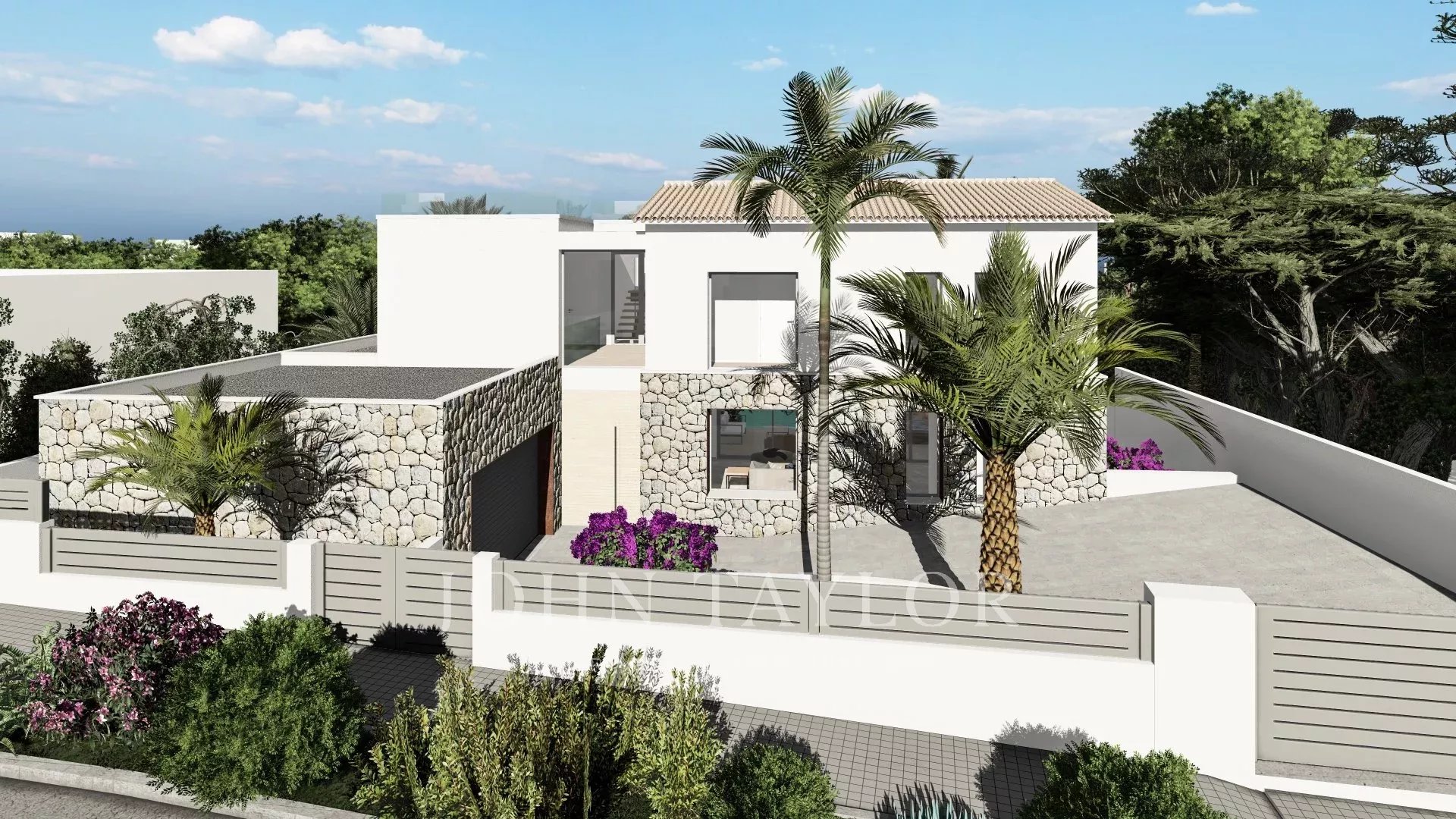 Villa de luxe nouvellement construite avec d'excellents espaces extérieurs à Santa Ponsa. Sur un terrain spacieux et ensoleillé de 1244 m2 bordant une zone verte dans un excellent emplacement à Santa Ponsa à une courte distance de la plage, des terrains de golf et du célèbre Port Adriano, cette fabuleuse villa de haute qualité dans un style méditerranéen contemporain combinant les espaces ouverts et la luminosité sera construite. Des éléments typiques de Majorque tels que la pierre seront utilisés pour créer un aspect sophistiqué et moderne tout en conservant le caractère, la chaleur et une atmosphère agréable. Des matériaux de haute qualité et des équipements de pointe seront utilisés pour créer une maison très confortable et représentative. Ce sera la maison idéale pour une famille qui passe beaucoup de temps dans les espaces extérieurs, qui forment une extension intégrée de l'intérieur, tels que les porches, le coin barbecue, la terrasse pour prendre un bain de soleil et la magnifique piscine entourée d'un grand jardin plat. La maison se compose d'un rez-de-chaussée offrant un salon spacieux avec une cuisine ouverte, des toilettes et une chambre avec dressing et salle de bains en suite. A l'étage supérieur, il y a 3 chambres avec salle de bains en suite, dont une grande suite parentale. De cet étage et de la terrasse sur le toit, vous pouvez profiter de la vue sur la mer. Le sous-sol comprend une salle de sport, une salle de bains et une buanderie. Un garage pour 2 voitures complètera cette propriété. À l'heure actuelle, il est encore possible d'adapter le projet à vos besoins et à vos souhaits et vous pouvez participer à la construction de la maison de vos rêves à Majorque. Le permis a été accordé et la construction peut commencer immédiatement.
