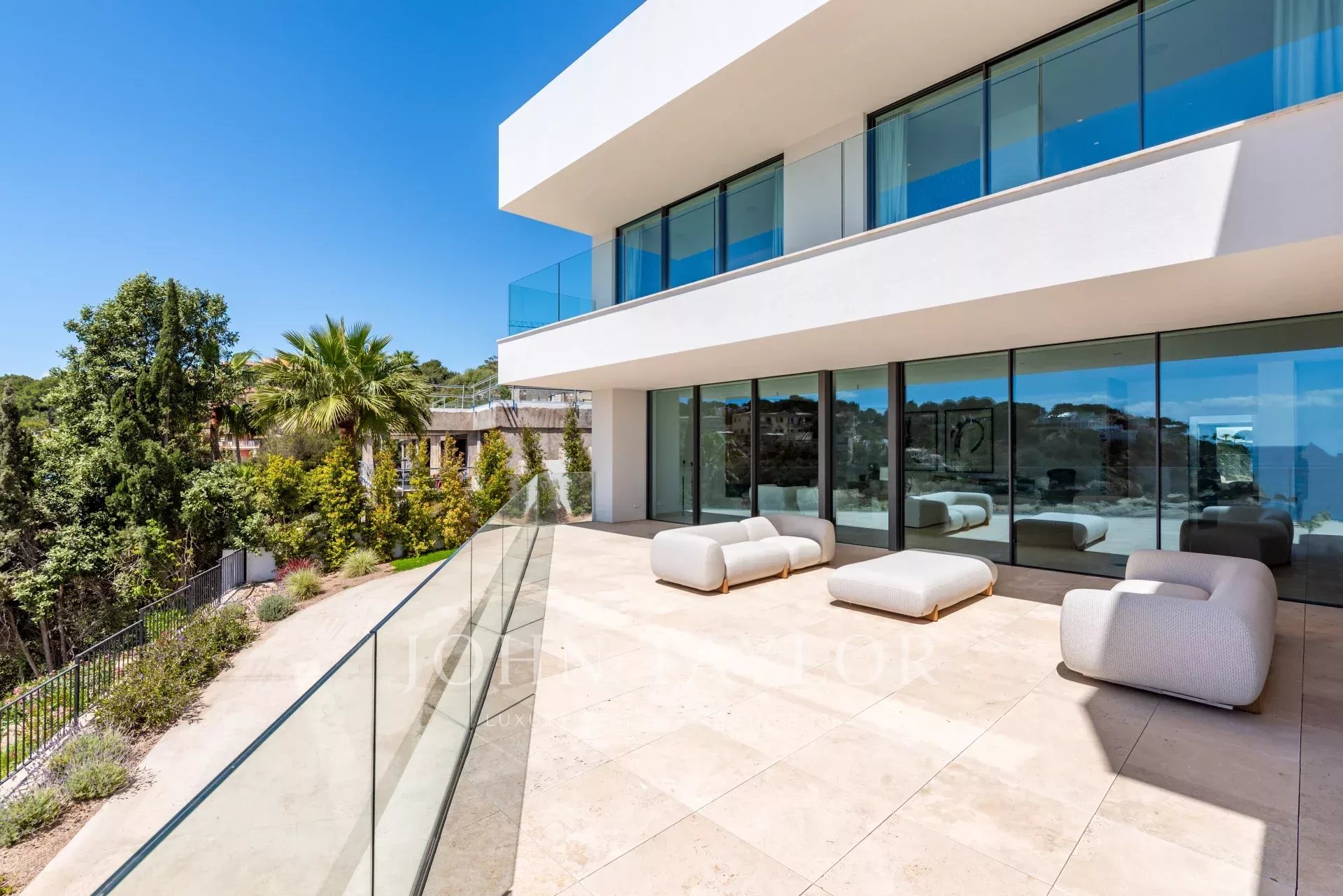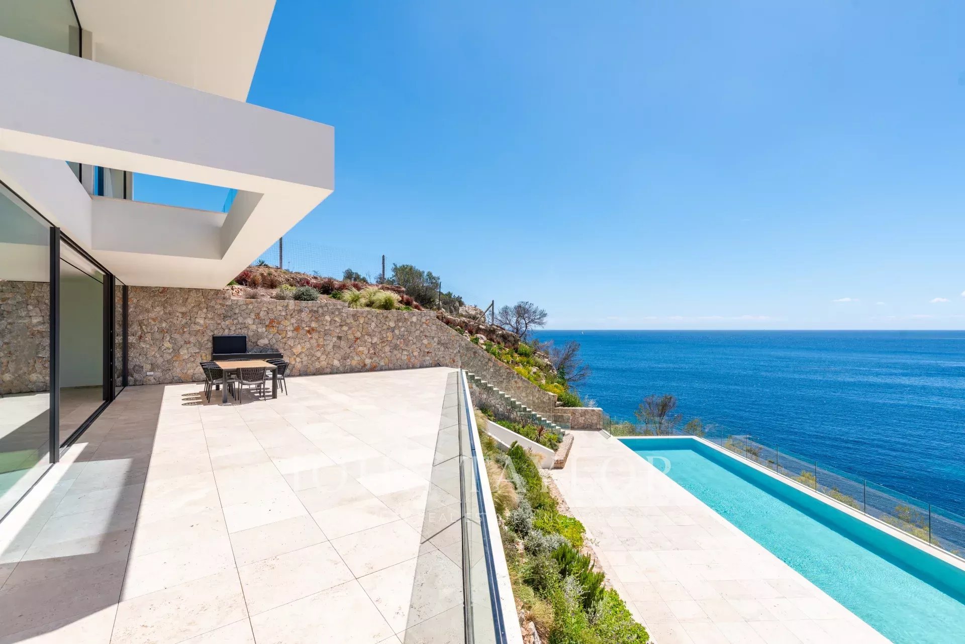 Découvrez le summum du luxe dans cette extraordinaire villa nouvellement construite dans le quartier résidentiel paisible de Sol de Mallorca. Entrez dans ce chef-d'œuvre côtier, qui offre un style de vie sans pareil ! Cette étonnante résidence de première ligne, impeccablement conçue et bénéficiant d'une vue inégalée sur la mer, redéfinit les propriétés côtières de luxe à Majorque. Avec plus de 1000 m2 de surface construite sur un terrain de 2142 m2, cette incroyable maison offre 3 étages reliés par un ascenseur. En entrant dans le hall d'entrée à l'étage supérieur, vous êtes accueillis par une vue à couper le souffle sur la mer Méditerranée. À ce niveau, vous trouverez la magnifique suite parentale avec deux dressings et une salle de bains sophistiquée. Chaque matin, vous vous réveillerez avec les couleurs changeantes de la mer à vos pieds. Ce niveau comprend également trois autres chambres, chacune avec sa propre salle de bains. En descendant un bel escalier, on accède au salon principal, complètement inondé de lumière, relié et spacieux, mais en même temps conçu pour offrir des espaces clairement séparés pour différents moments, que ce soit pour une soirée confortable près de la cheminée, un dîner formel, une soirée barbecue animée avec la famille et les amis ou tout simplement pour se détendre sur la terrasse. Le sous-sol de la maison offre un garage pour au moins 7 voitures et de vastes espaces qui peuvent être utilisés comme une salle de fitness, un home cinéma ou une salle de jeux pour les enfants. De nombreux porches et terrasses ouvertes pour profiter du soleil autour de l'impressionnante piscine à débordement complètent cette propriété unique en son genre. Prêt à élever votre expérience de vie à de nouveaux sommets et à vous approprier ce style de vie unique, contactez-nous dès aujourd'hui pour que ce rêve devienne réalité !
