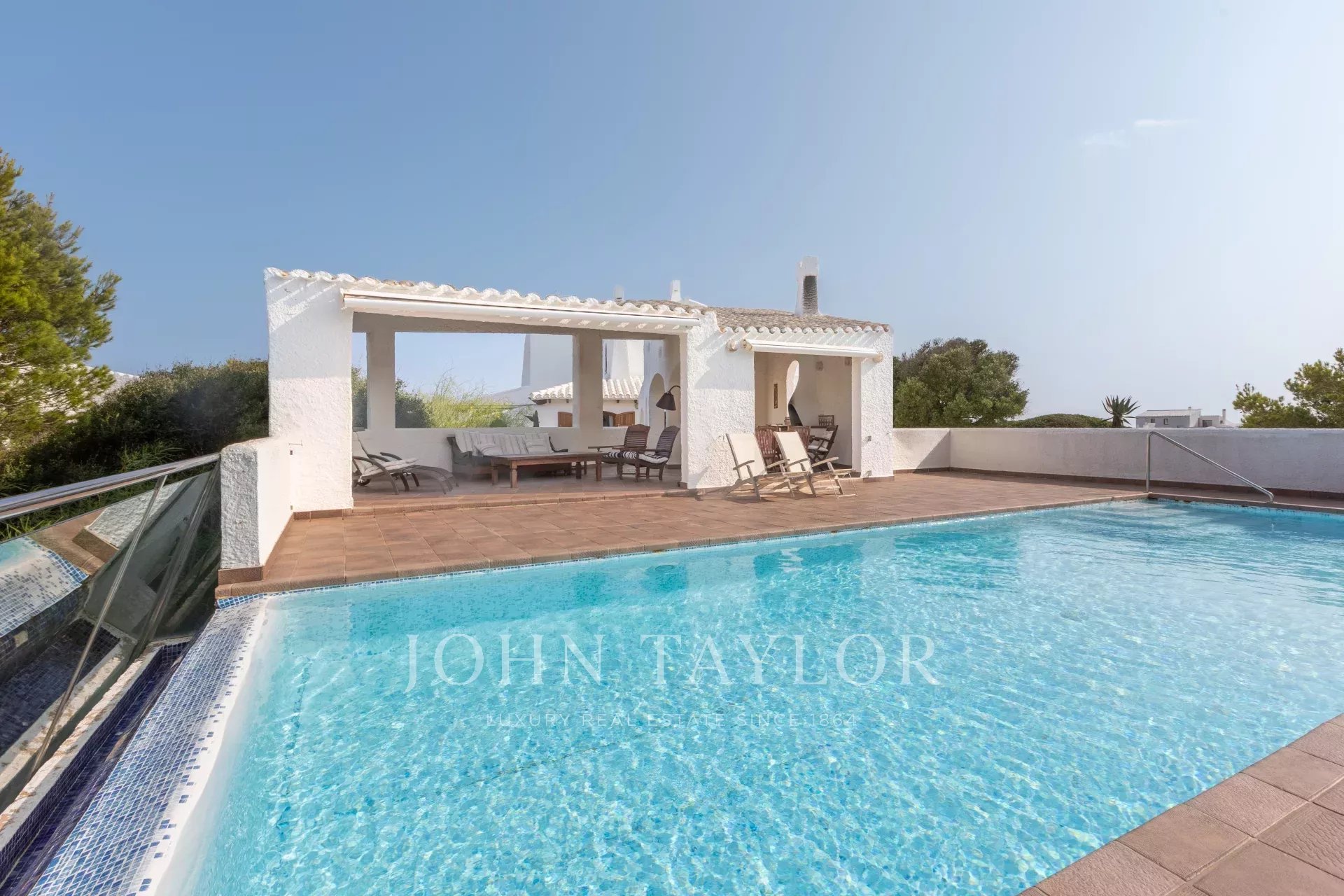 Au-dessus de cette dépendance se trouve une grande piscine, entourée d'une grande terrasse partiellement couverte donnant sur un espace vert non constructible et sur la mer.