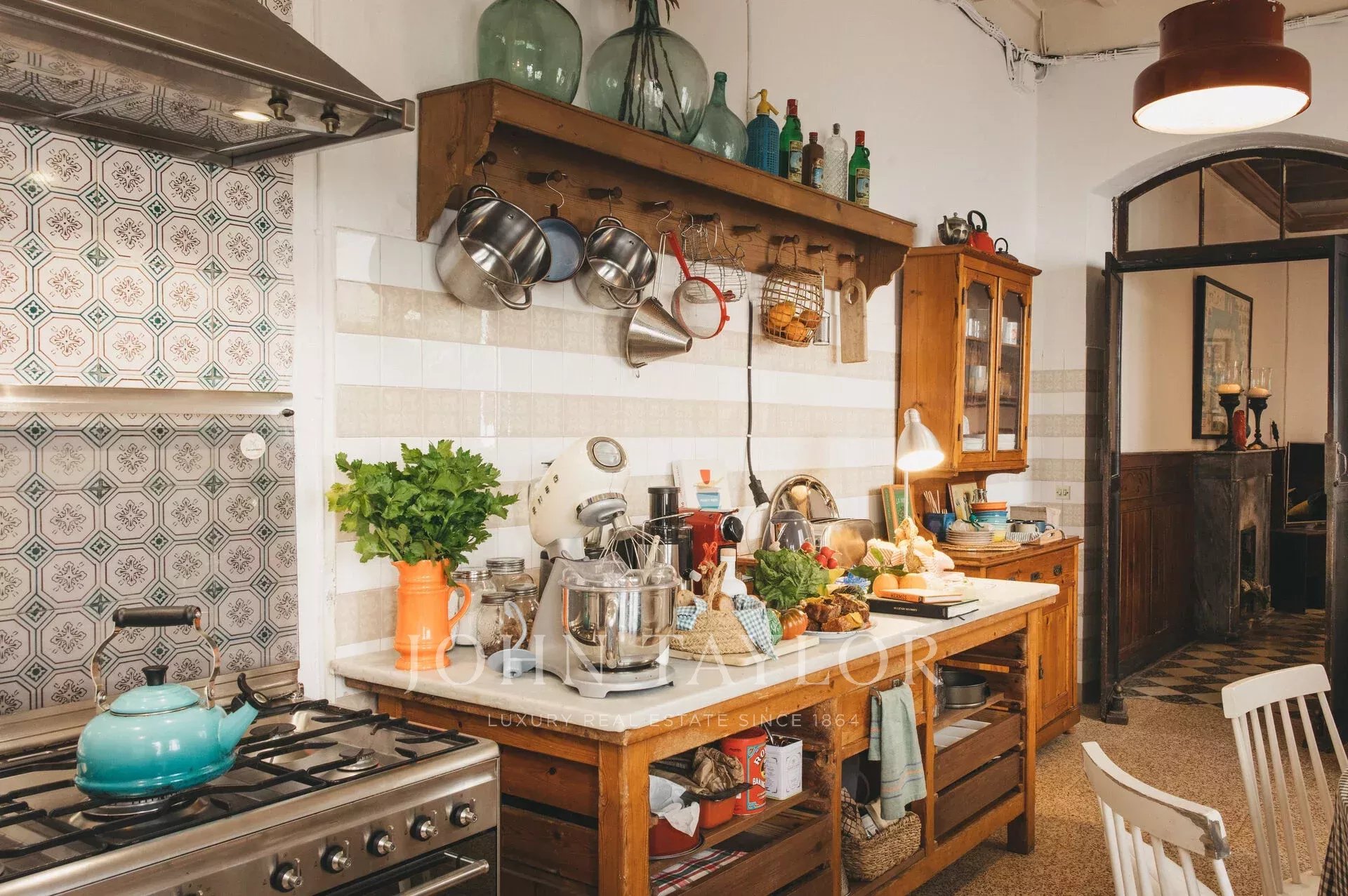 La résidence principale (590 m²) dispose d'une licence touristique officielle, de six chambres avec salles de bains privatives, d'un salon avec cheminée, d'une élégante salle à manger, d'une cuisine traditionnelle minorquine, d'un bureau-bibliothèque, d'un grenier et d'un sous-sol en pierre marée. Les détails originaux tels que les fenêtres à guillotine, les sols hydrauliques et les plafonds décorés reflètent le savoir-faire unique de Minorque.