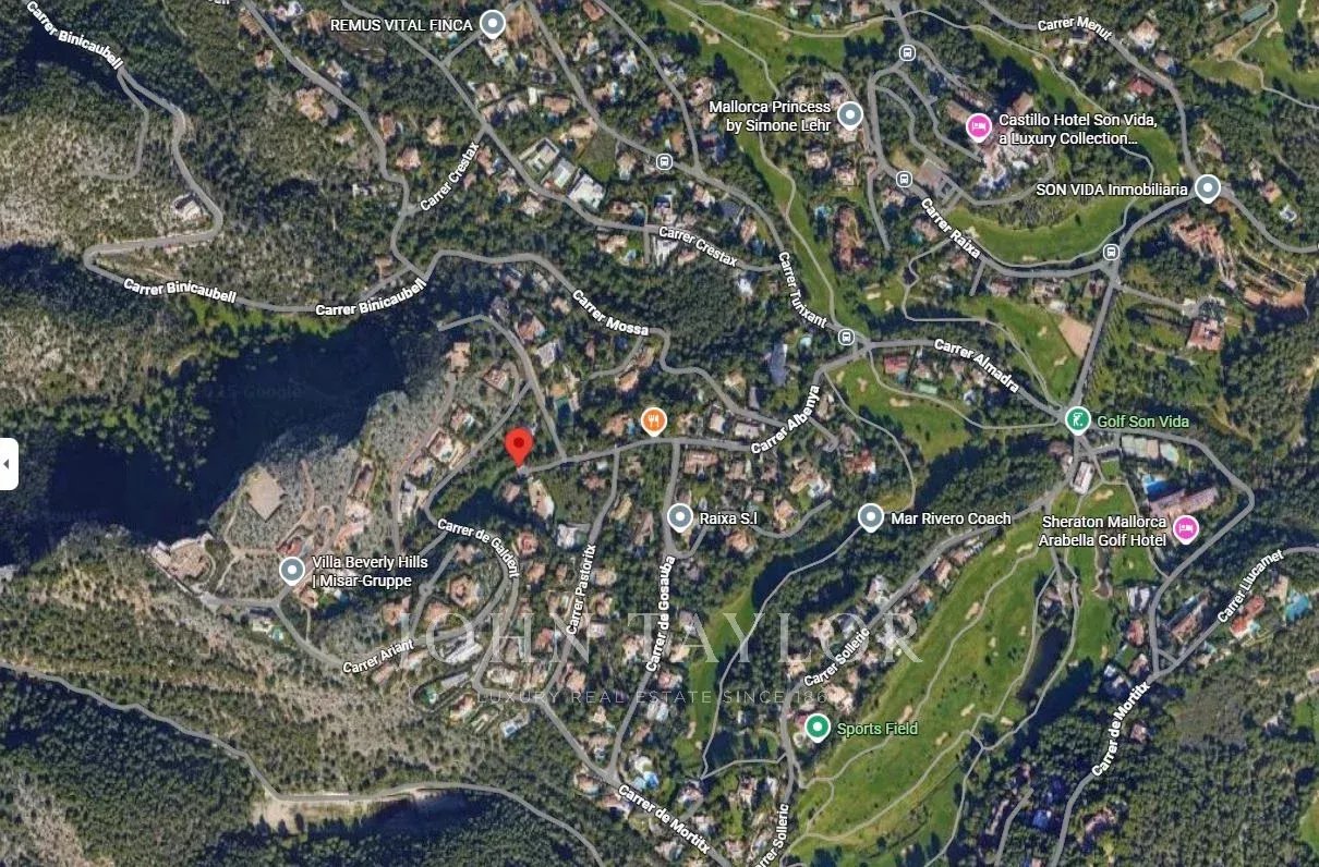 Ce vaste terrain est niché dans l'un des meilleurs emplacements de Son Vida. Avec une superficie totale de 2 399 m2 et une orientation sud-est, il offre les conditions parfaites pour votre future maison avec des vues exceptionnelles sur Palma et la mer. Le projet lui-même a été conçu par l'un des cabinets d'architectes les plus prestigieux de l'île afin de répondre aux normes les plus élevées et les plus luxueuses. Il comprend 6 chambres, 6 salles de bains, une piscine d'eau salée de 78 m2, un spa et un espace de remise en forme, ainsi qu'un parking pouvant accueillir jusqu'à 5 voitures. Comme il s'agit de l'un des quatre terrains en cours de développement dans le quartier, il s'agit vraiment d'une opportunité unique. La possibilité est donnée de réaliser le projet avec les architectes déjà impliqués. Le prix indiqué n'inclut pas la planification, la construction ou les modifications du projet actuel.